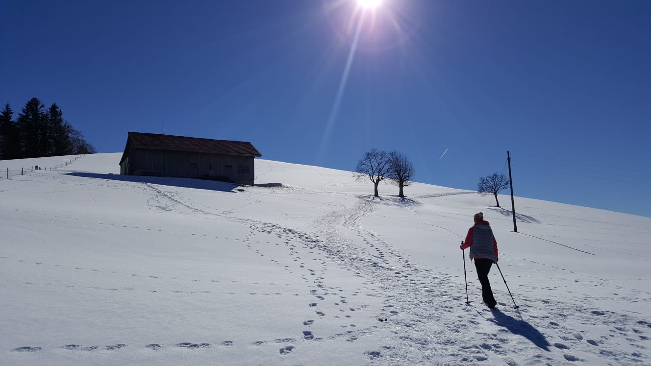 Die Rundwanderung rund um Schwellbrunn mit Aussicht auf den Alpstein und den Säntis und inmitten der typischen Appenzeller Hügellandschaft lohnt sich auf jeden Fall. Wenn es jedoch nicht richtig viel Schnee hat, ist sie mit guten Winterstiefeln und Laufstöcken besser machbar, vor allem, weil man immer wieder kurze Strecken auf der Strasse zurücklegen muss. Und als Belohnung winkt gegen Ende der Wanderung das Bergrestaurant Sitz mit Weitblick auf den Alpstein.