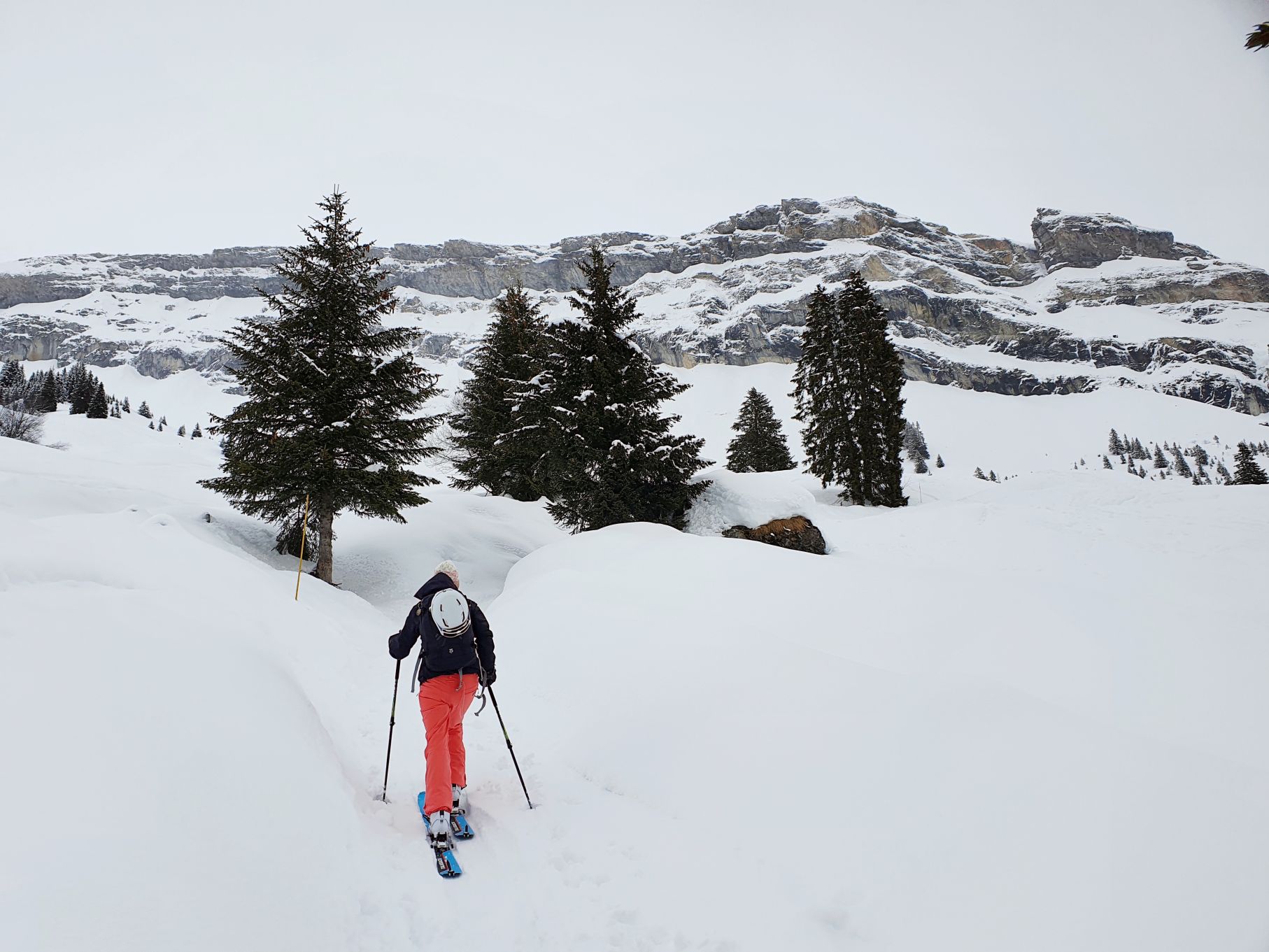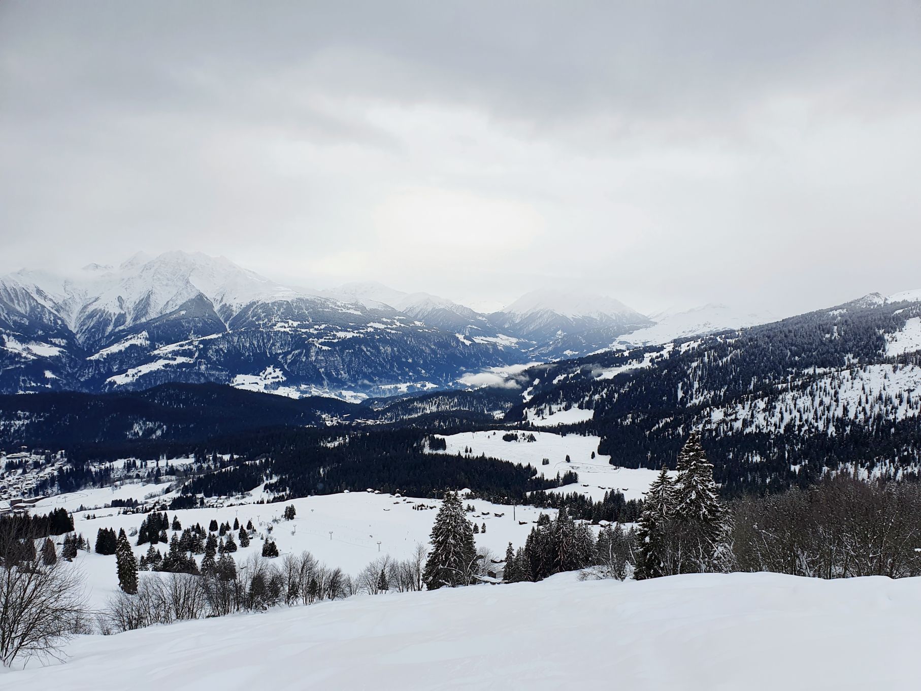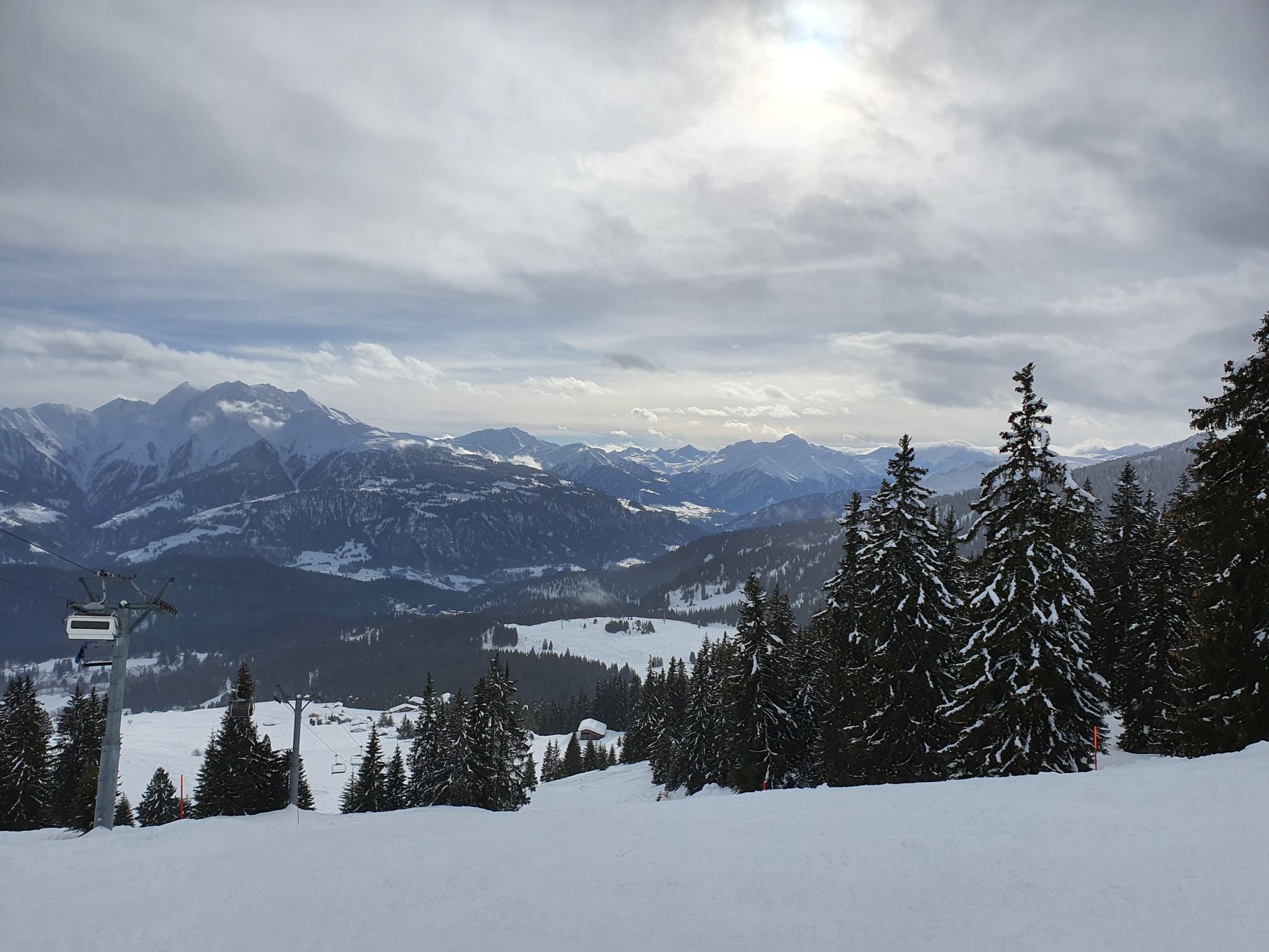 Aufgrund der hohen Lawinengefahr und dem eher trüben Wetter entschieden wir uns heute für die gesicherte Skitour von der Talstation Flims bis zum Bergrestaurant Naraus. Die ersten paar Hundert Meter waren nicht besonders schön, sie führten von der Talstation Flims der Piste entlang hoch. Mit dem Einstieg in den gesicherten Skitourenweg begann der spannendere Teil der Tour. Bis Spaligna ging es stetig angenehm hoch, danach wurde es immer steiler und strenger bis zur Bergstation Naraus. Da uns den letzten Teil der Strecke grusliger Nieselregen begleitete, waren wir dankbar bei der Bergstation Naraus überdachte Bänkli vorzufinden. Wir gönnten uns eine Picknick-Pause und genossen dann die Abfahrt über die Skipiste zurück nach Flims.