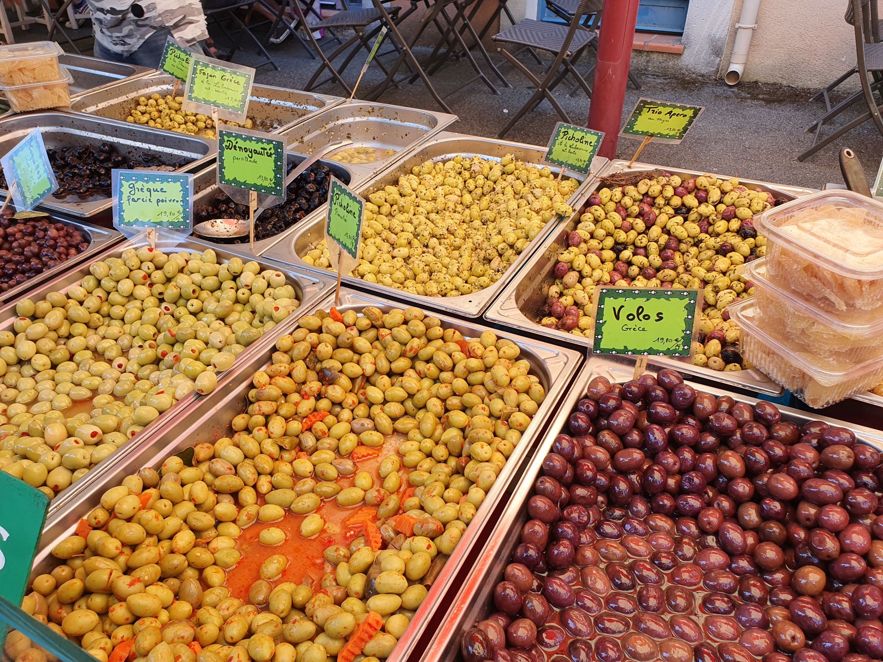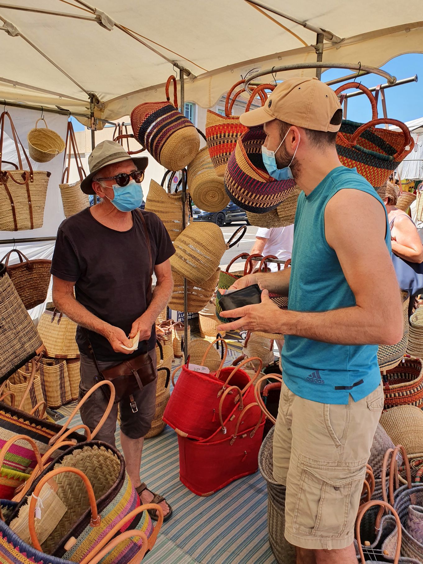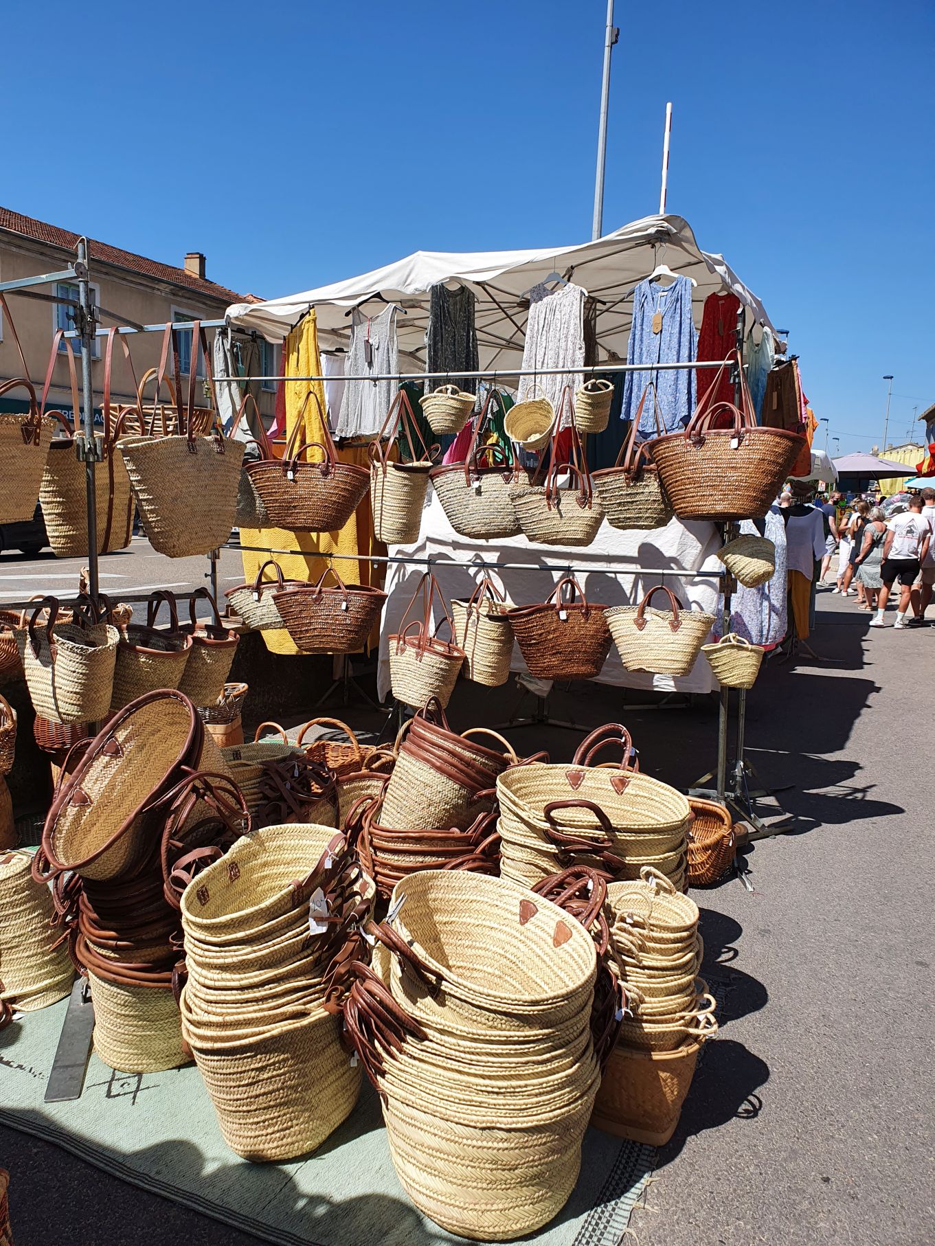 Nach einem kurzen Stopp in unserem hübschen Atelier in Lacoste machten wir uns zu Fuss auf den Weg zum Farmer’s market in Coustellet. Nach gut 1.5 Stunden Marsch an Wein- und Gemüsefeldern vorbei erreichten wir den Markt in Coustellet – und der war grösser, als wir erwartet haben 🙂 Jedenfalls so gross, dass wir allerhand einkauften; Früchte, Oliven, Käse, Brot und einen dieser in Südfrankreich typischen Flechtkörbe. Damit hatte ich mir schon einen Ferienwunsch erfüllt, diese Körbe sind nämlich in der Schweiz nicht so einfach zu kriegen. Nach einer kurzen Stärkung in einer Bäckerei machten wir uns vollgepackt und in der Hitze der Mittagssonne auf den Weg zum Taxistand – nur um herauszufinden, dass dieser nicht existiert und der einzige Taxifahrer, welcher telefonisch erreichbar war, erst in zwei Stunden Zeit hatte. Leicht verzweifelt angesichts unserer vollen Taschen fragte ich den sympathisch aussehenden Mann, der auf uns zukam, ob er mit dem Auto hier sei. Nach ein paar Sätzen erkannte der Eiheimische schnell, dass wir etwas „perdu“ waren. Wie recht er doch hatte! Und dieser nette Herr nahm uns dann tatsächlich in seinem Privatauto mit – mitsamt all unserer Einkaufstaschen. Hatte es sich doch gelohnt, ein bisschen einzukaufen 😉 Und die Franzosen haben einmal mehr einen guten Eindruck hinterlassen.