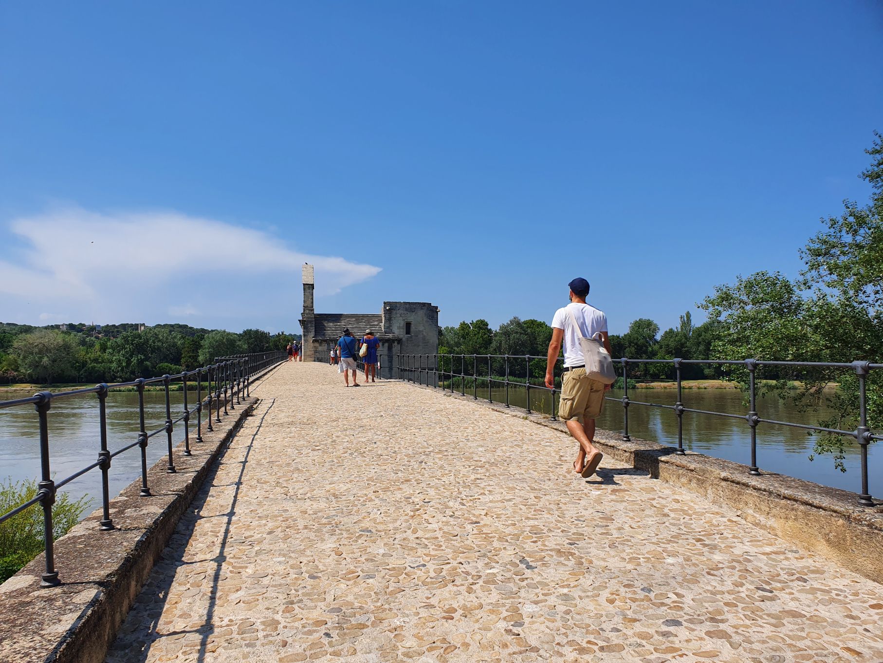Zum Abschluss besichtigten wir noch die Pont d’Avignon, wofür man 5 Euro Eintritt bezahlen muss. Dafür erhält man jedoch nicht nur Zutritt zur mittelalterlichen Brücke, sondern auch Informationen zur Konstruktion, zur Zerstörung und zur historischen Bedeutung der Brücke. Der Legende nach baute Pater Bénézet eine 900 Meter lange Brücke von Avignon über die Rhone nach Villeneuve-les-Avignon. Die Brücke wurde 1185 fertiggestellt und bestand aus 22 Steinbogen. Die Brücke musste mehrfach wieder aufgebaut werden, bis im 17. Jahrhundert alle Steinbogen bis auf vier aufgrund massiver Wetterveränderungen davongeschwemmt wurden und in der Rhone versanken.