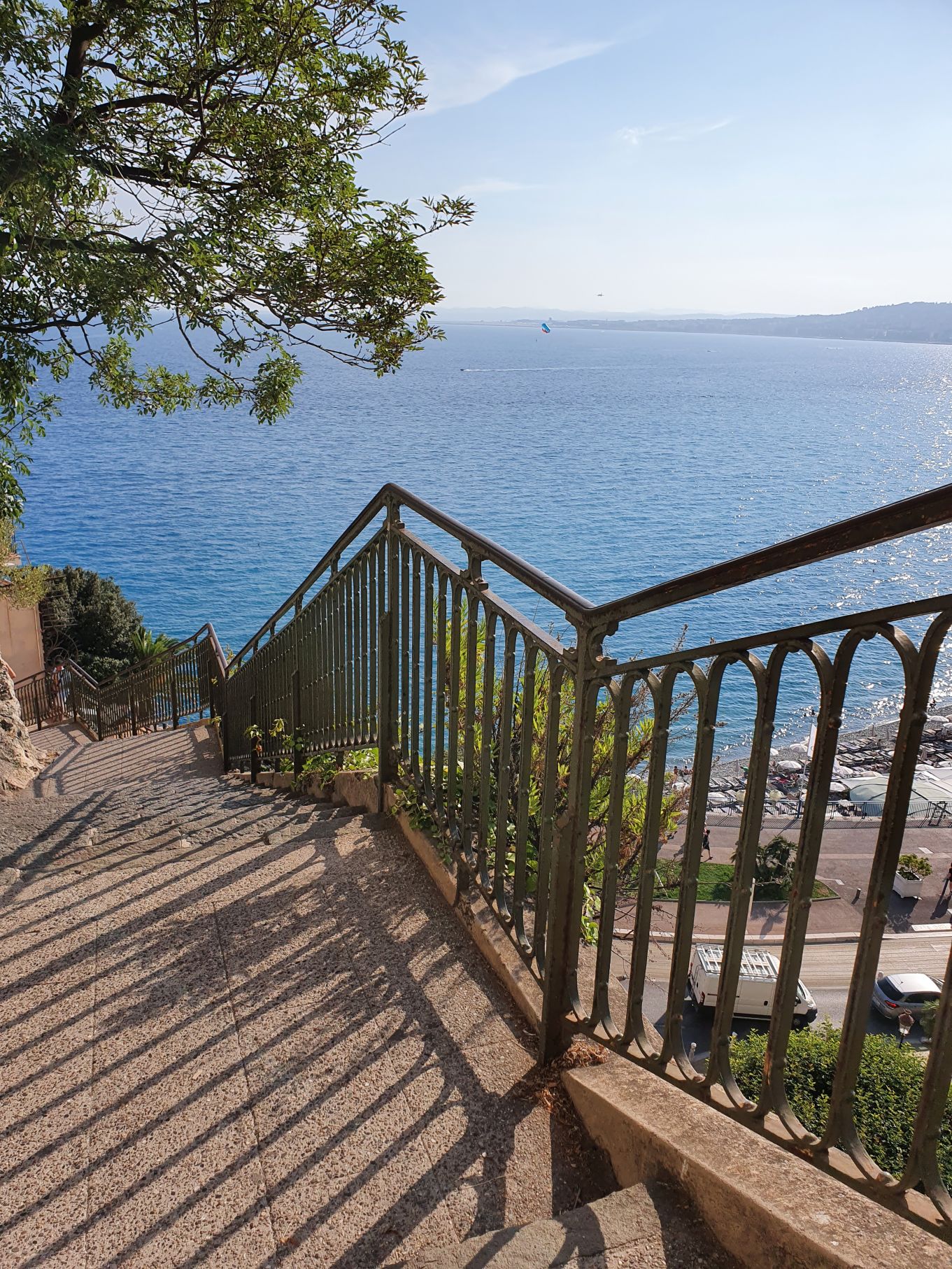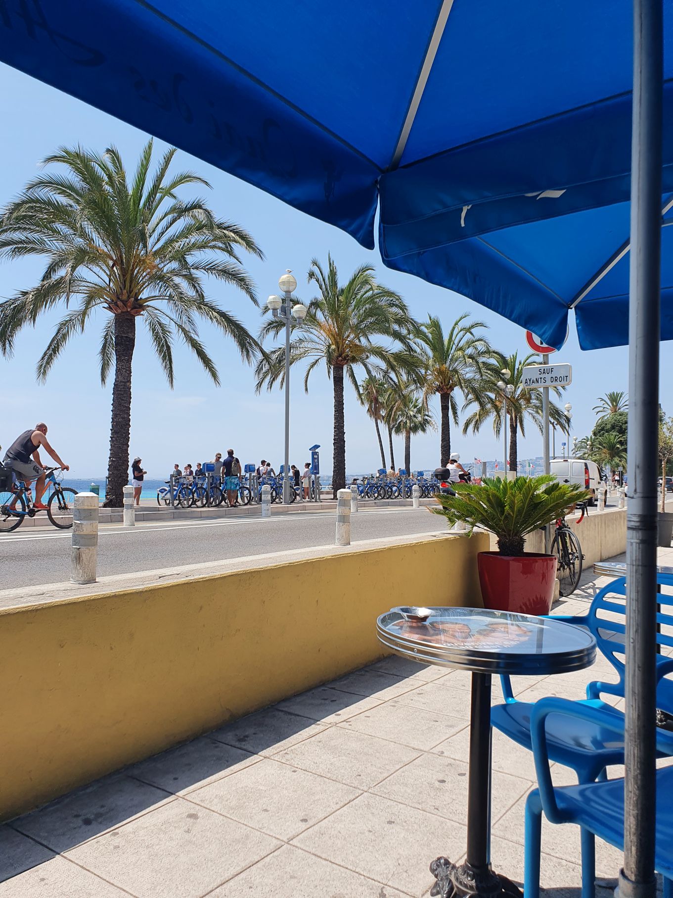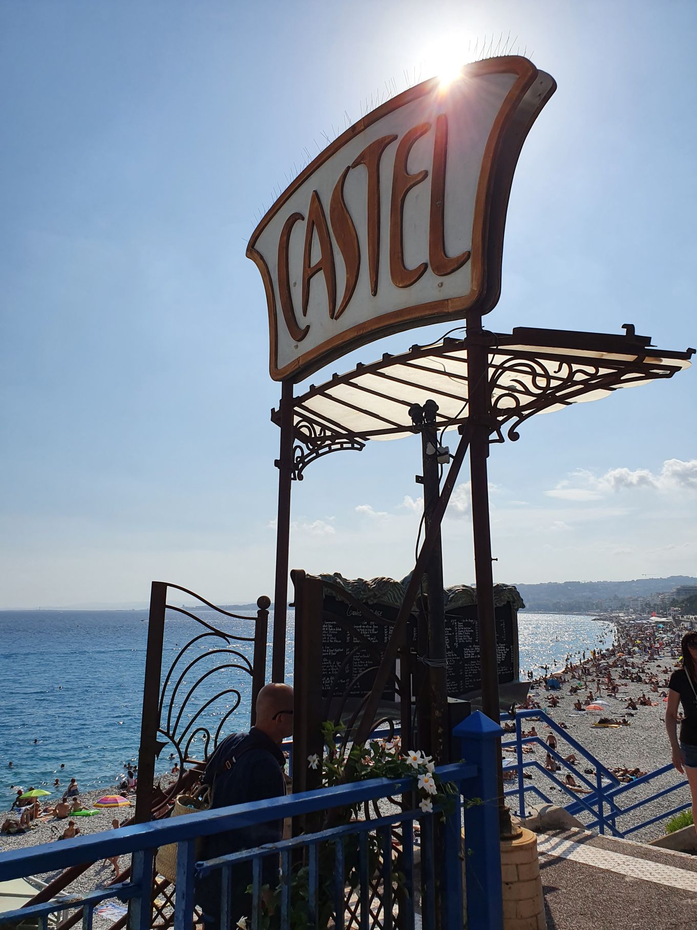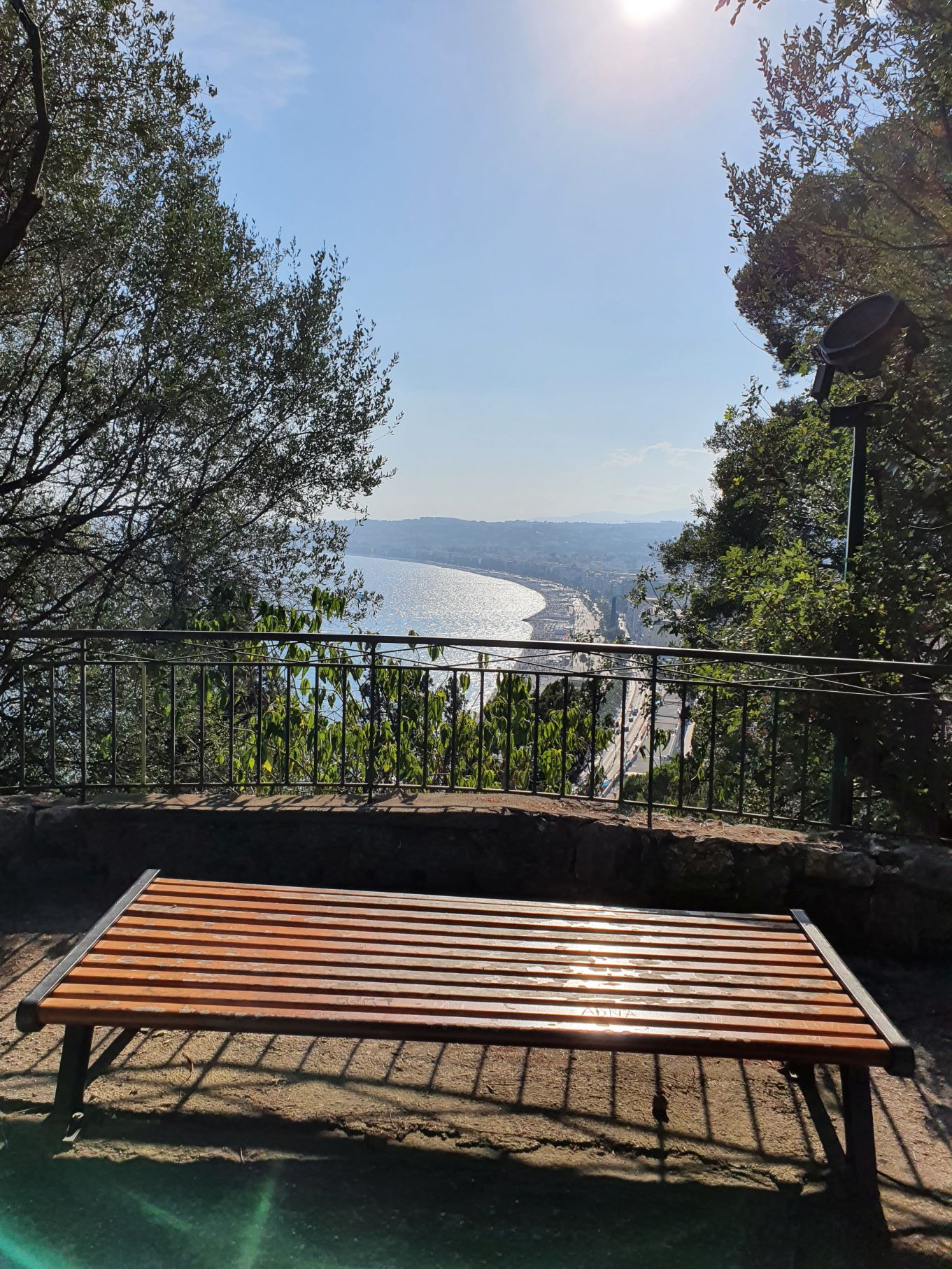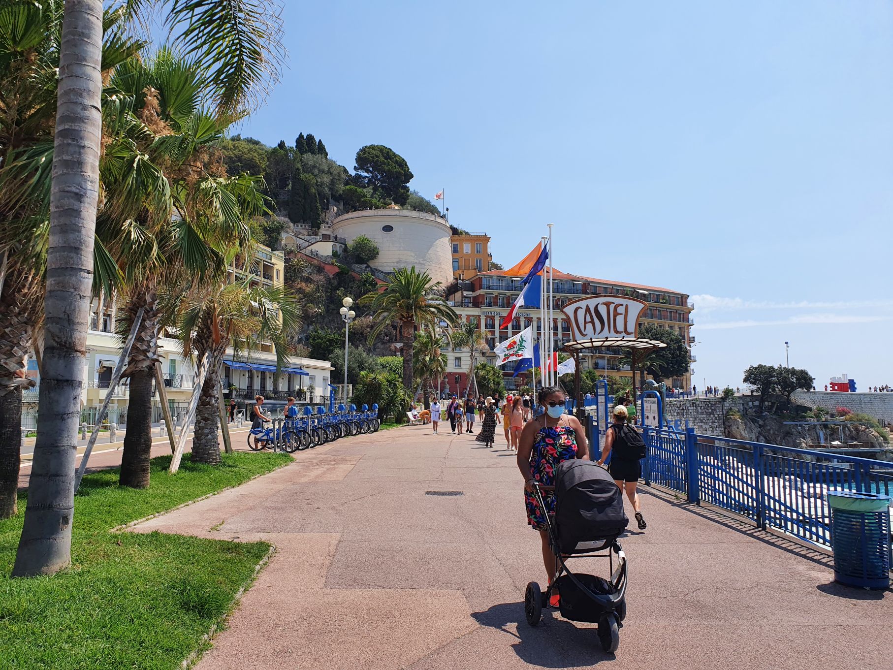 Zum Glück ist die Promenade sehr breit und unterteilt in Fussgänger:innen und Velofahrer:innen, so dass für alle genug Platz ist. Das ist auch nötig, denn an der Promenade des Anglais tummeln sich zu jeder Tageszeit Einheimische und Touristen gleichermassen. Bekannt ist die Strasse auch für ihre chaises bleues, die zu einer kurzen Pause mit herrlichem Ausblick auf das türkisfarbene Meer einladen. Zudem reihen sich vor allem gegen das Zentrum hin einige Luxushotel aneinander, das teuerste darunter ist das Hotel Negresco. Besonders gefreut haben wir uns nicht nur über den Anblick des Meeres, sondern vor allem auch über die tollen „Kühlungsdächer“, die in regelmässigen Abständen aufgestellt wurden und unter denen man Schatten und Abkühlung in Form von Wassernebel findet. Eine grossartige Erfindung in Anbetracht der heissen Temperaturen! Und nach diesen eineinhalb Stunden Fussmarsch der Promenade entlang freuten wir uns wahnsinnig auf einen Willkommensdrink in einem der hübschen Strandcafés unterhalb des Hausberges von Nizza, dem Colline du Château.