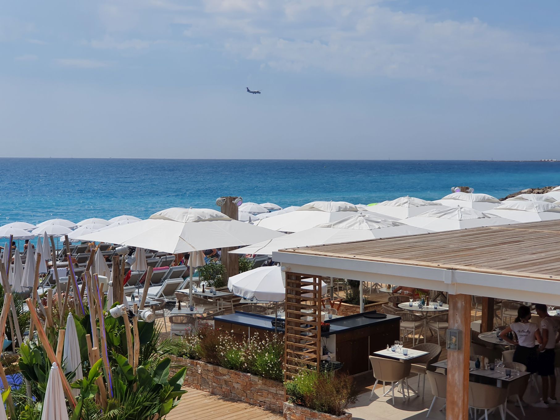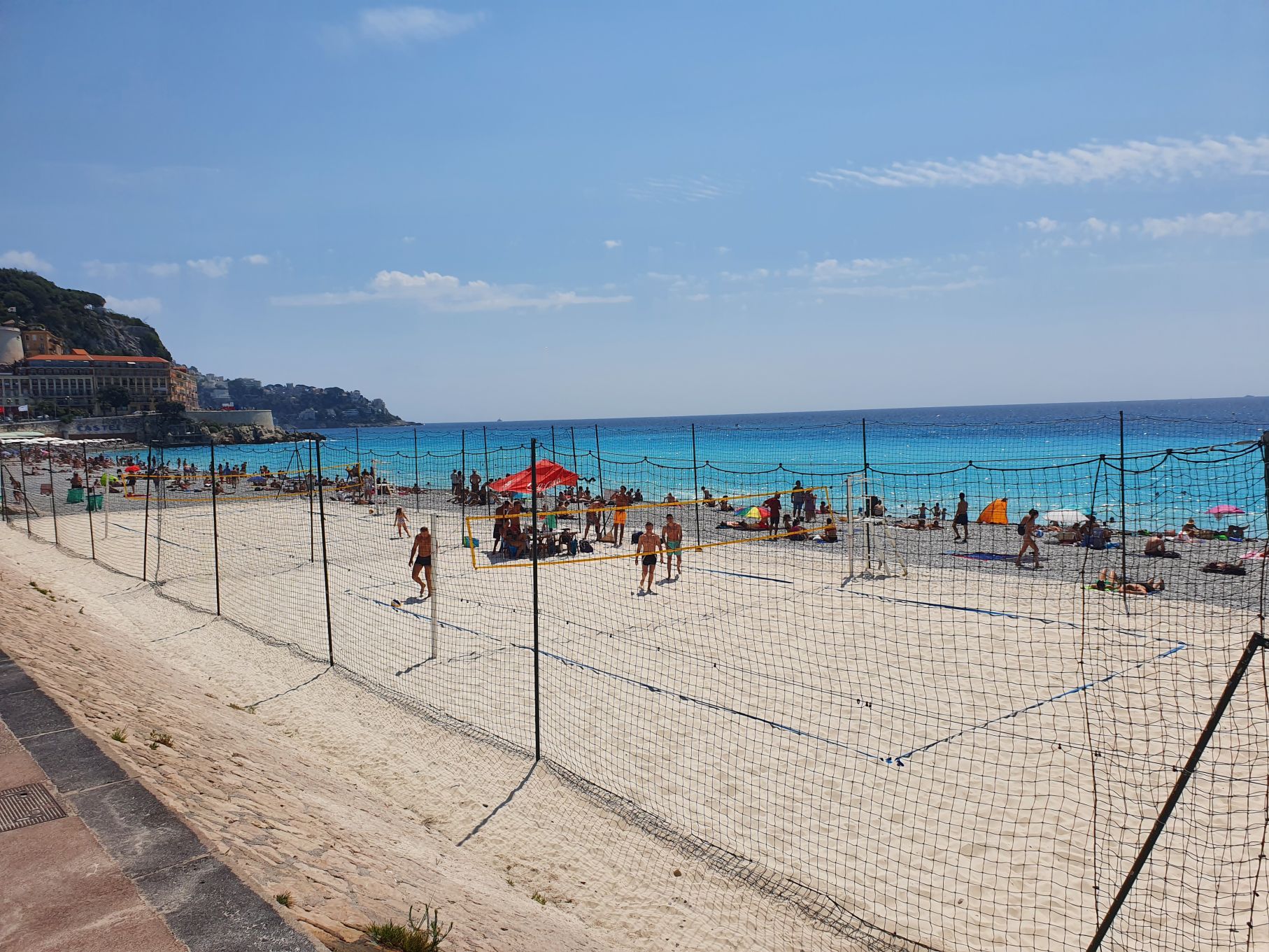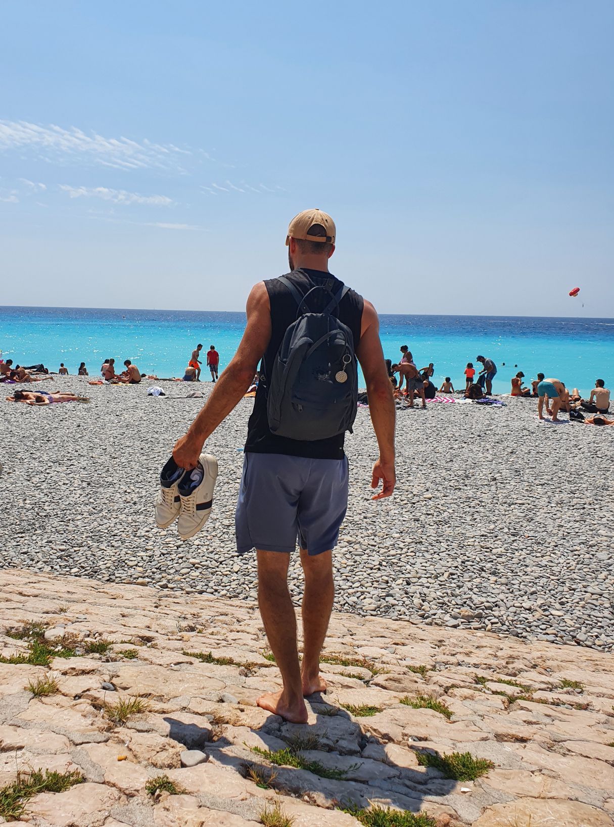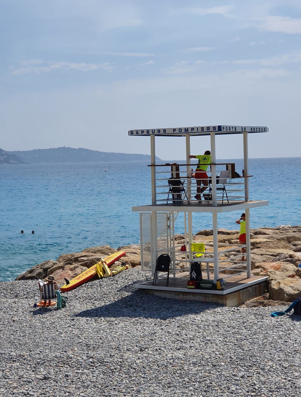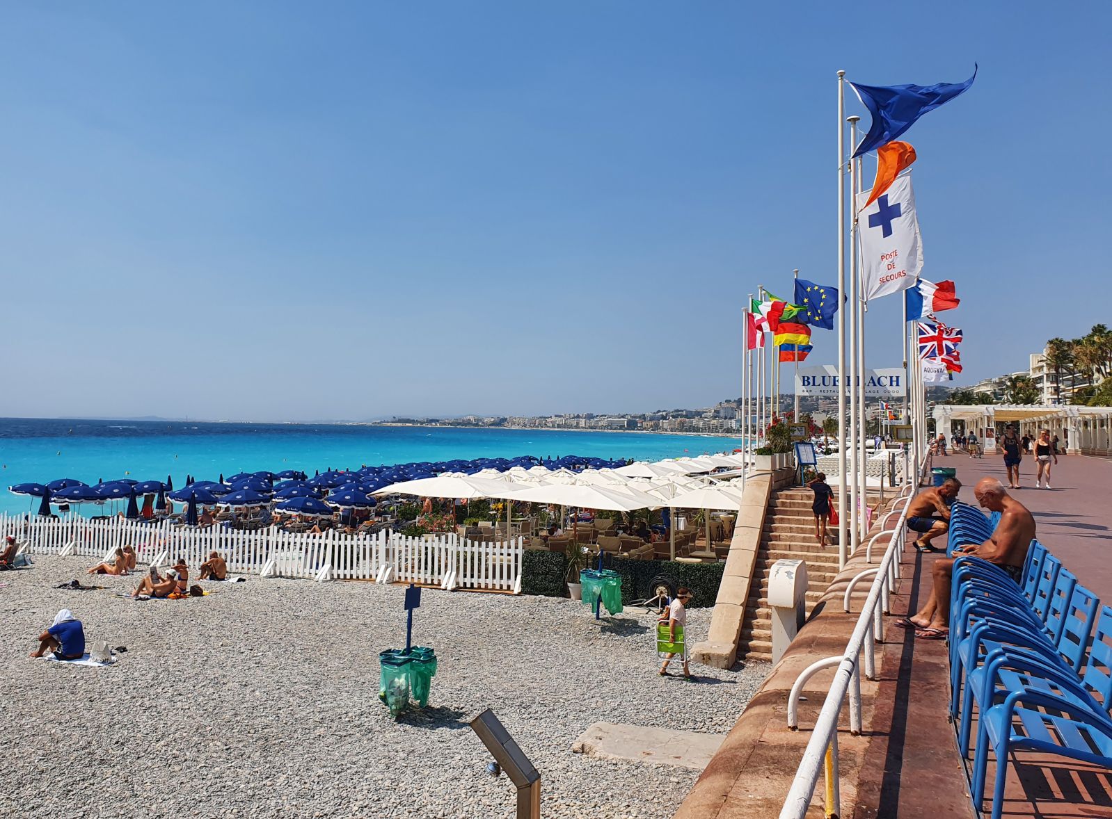 Zum Glück ist die Promenade sehr breit und unterteilt in Fussgänger:innen und Velofahrer:innen, so dass für alle genug Platz ist. Das ist auch nötig, denn an der Promenade des Anglais tummeln sich zu jeder Tageszeit Einheimische und Touristen gleichermassen. Bekannt ist die Strasse auch für ihre chaises bleues, die zu einer kurzen Pause mit herrlichem Ausblick auf das türkisfarbene Meer einladen. Zudem reihen sich vor allem gegen das Zentrum hin einige Luxushotel aneinander, das teuerste darunter ist das Hotel Negresco. Besonders gefreut haben wir uns nicht nur über den Anblick des Meeres, sondern vor allem auch über die tollen „Kühlungsdächer“, die in regelmässigen Abständen aufgestellt wurden und unter denen man Schatten und Abkühlung in Form von Wassernebel findet. Eine grossartige Erfindung in Anbetracht der heissen Temperaturen! Und nach diesen eineinhalb Stunden Fussmarsch der Promenade entlang freuten wir uns wahnsinnig auf einen Willkommensdrink in einem der hübschen Strandcafés unterhalb des Hausberges von Nizza, dem Colline du Château.