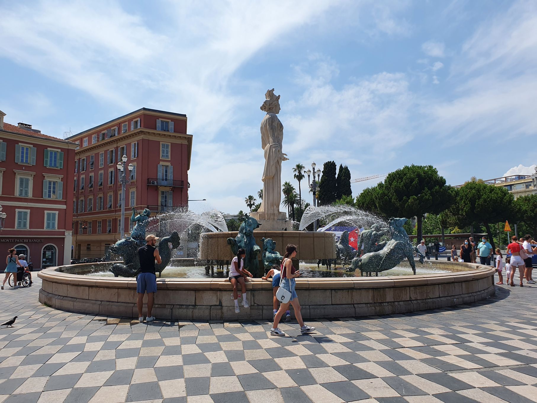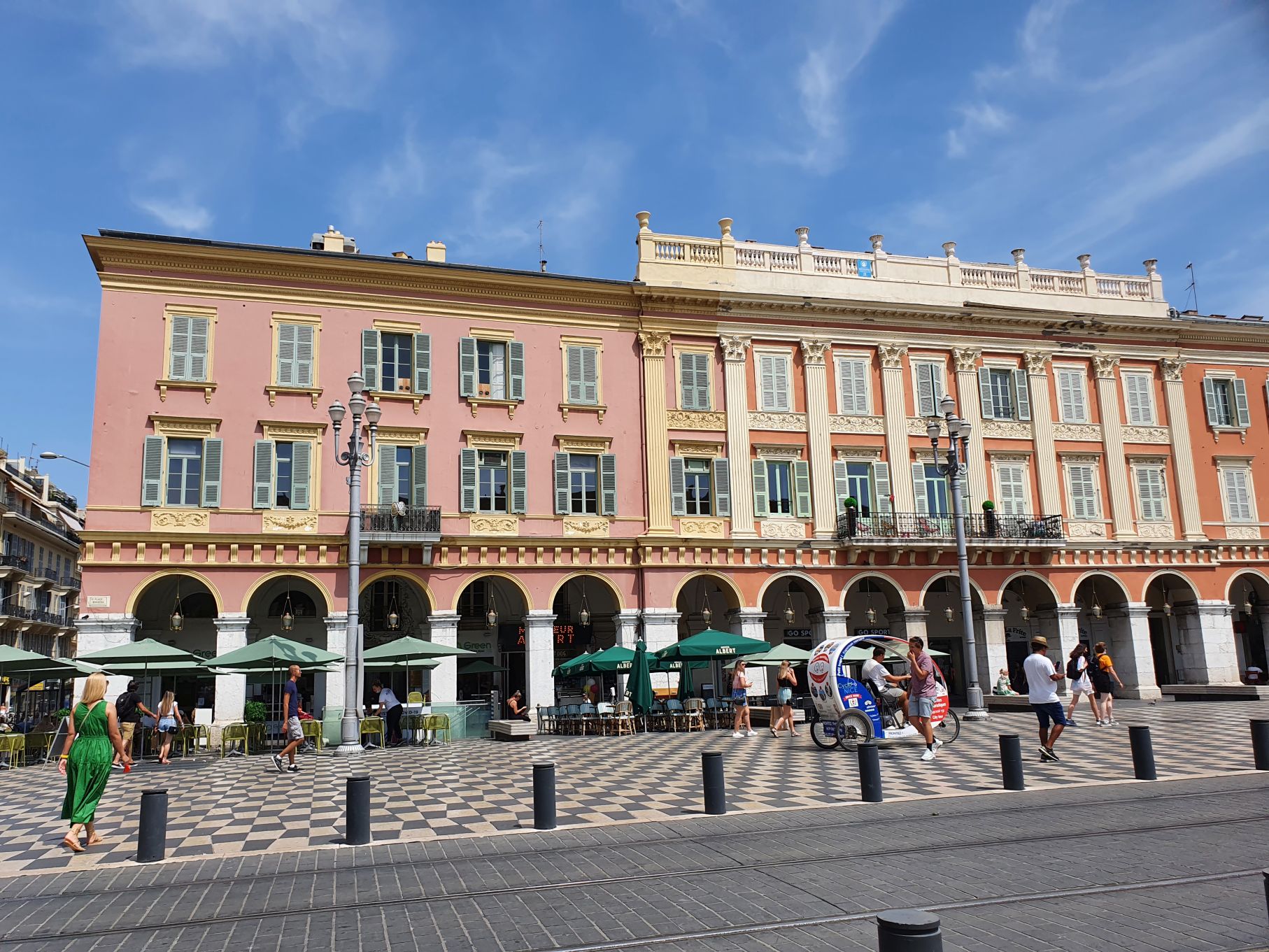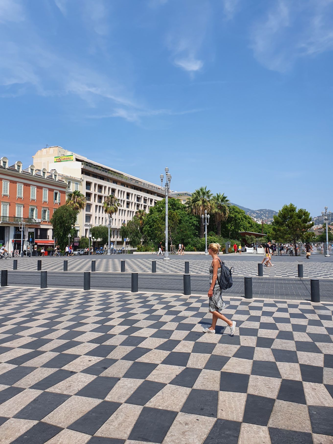 Wenn man am Ende der Promenade des Anglais links Richtung Stadt abdreht, kommt man direkt zum Place Masséna, dem Herzen Nizzas. Der Place Masséna erinnert mit seinem schwarz-karierten Pflaster und den ockerfarbenen Gebäuden aus dem 19. Jahrhundert sehr an das nahe Italien und verleiht ihm ein einmaliges Flair. Auch auf diesem Platz herrscht tagein, tagaus reges Treiben. Abends zeigen Strassenkünstler:innen ihr Können und Cafés laden zum Verweilen ein. Im Winter findet auf dem Place Masséna anscheinend ein Weihnachtsmarkt statt, das stelle ich mir sehr stimmungsvoll vor.