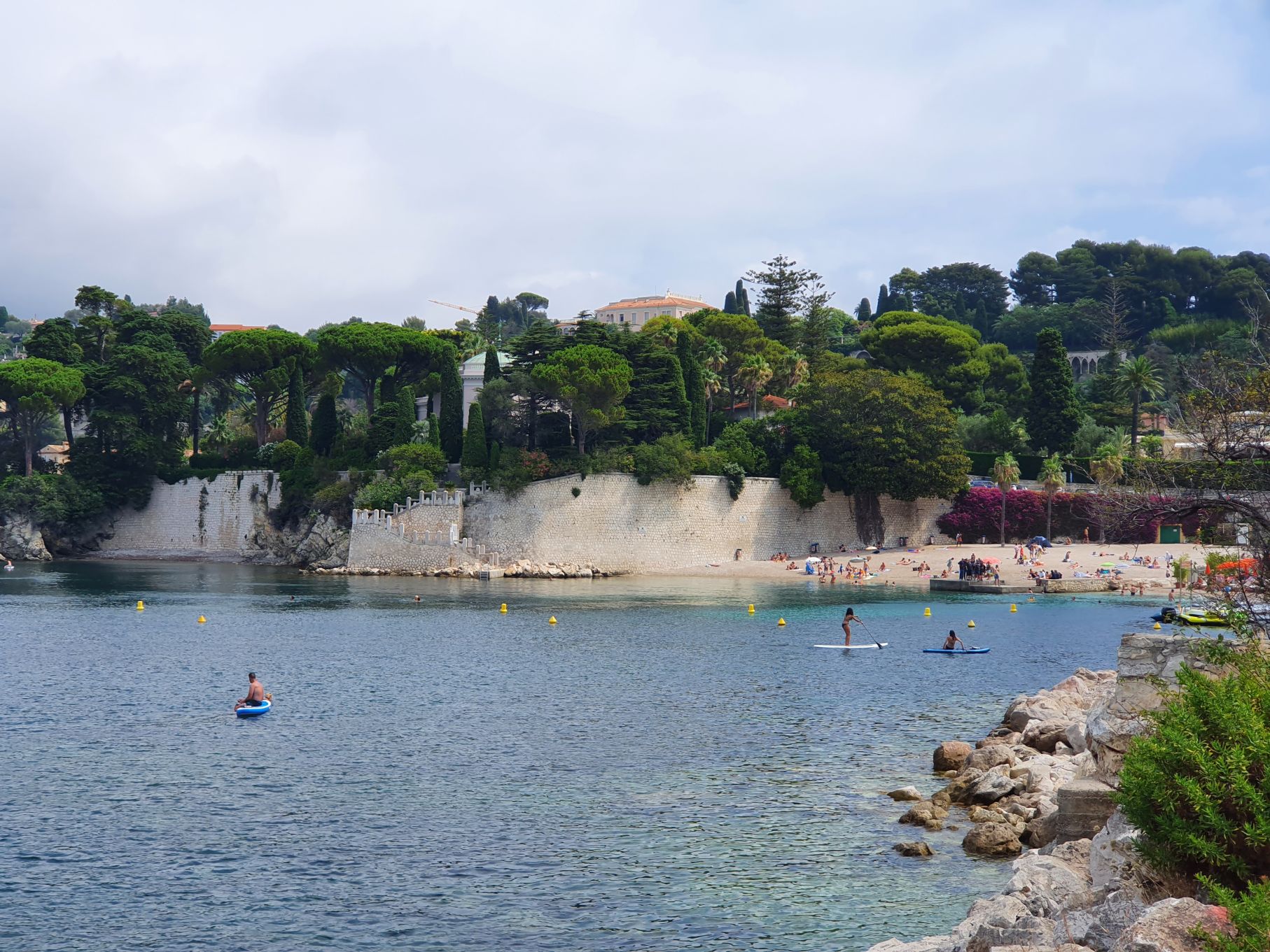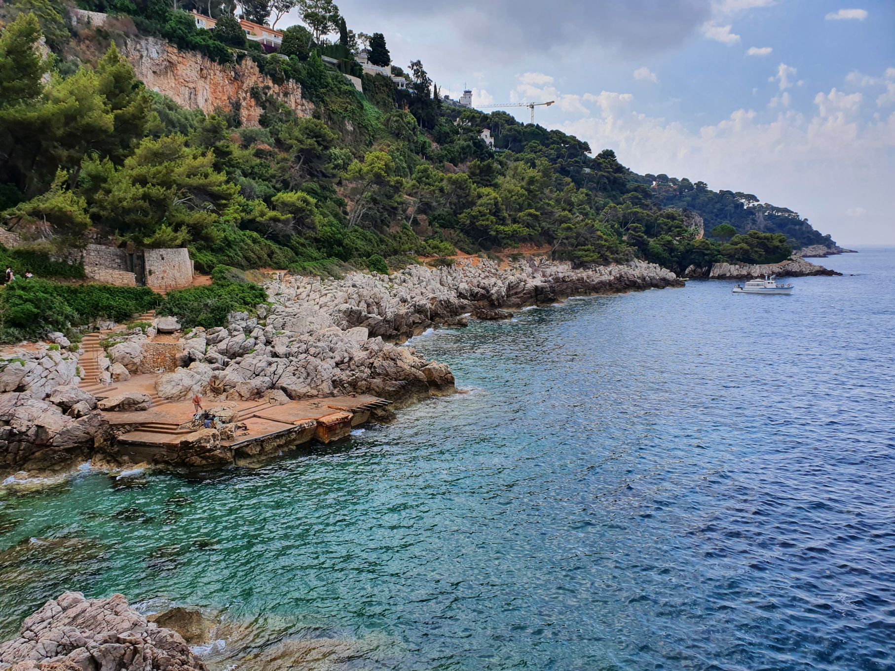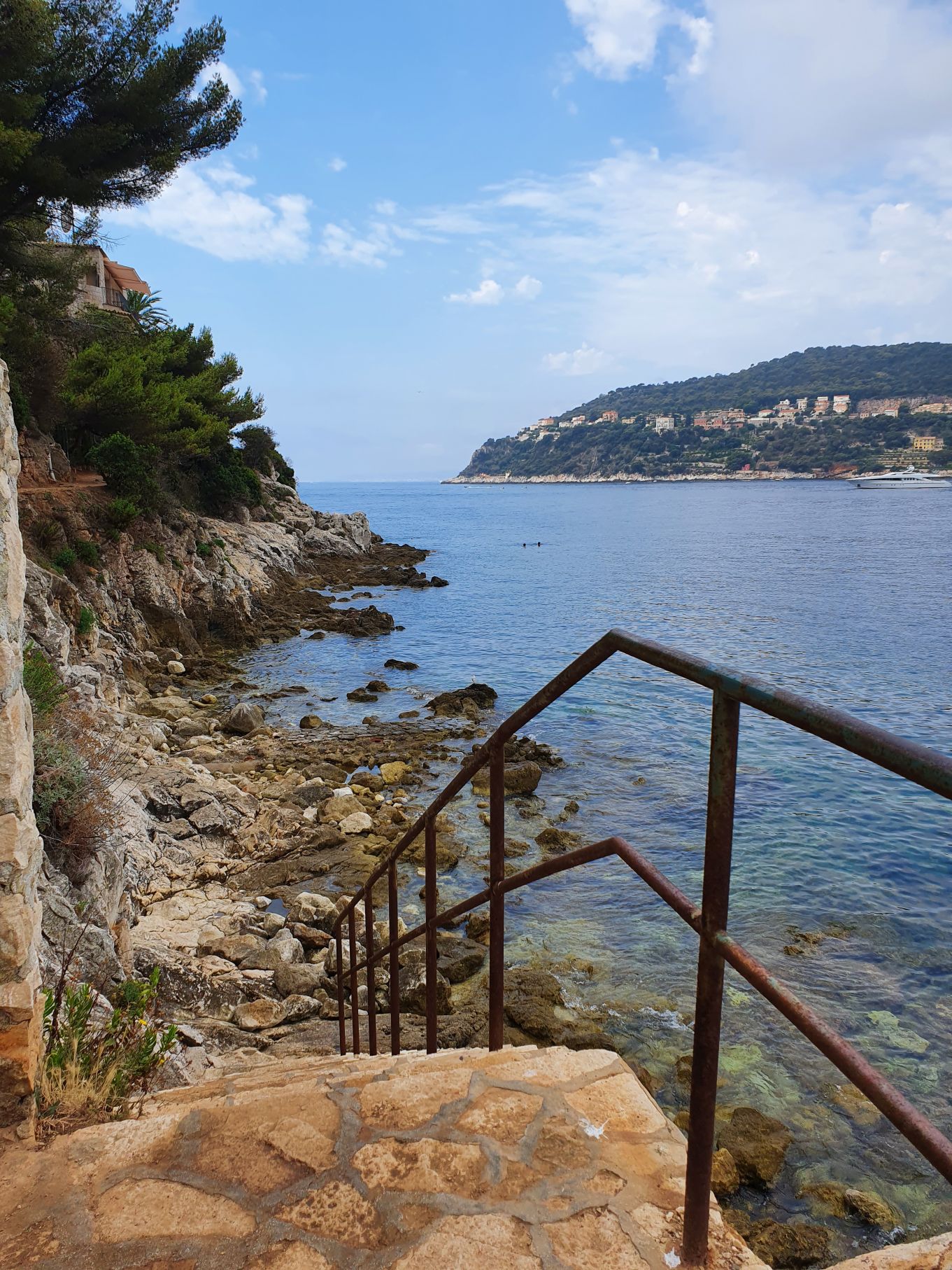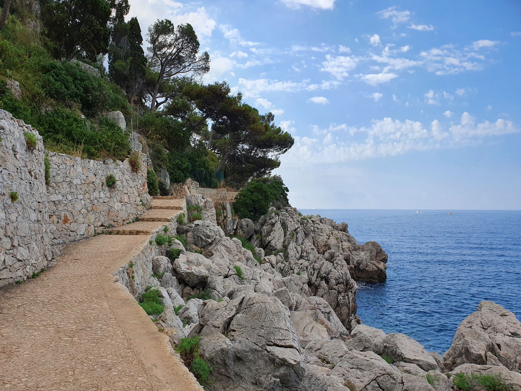 Gleich neben Villefranche-sur-mer liegt die Halbinsel Saint-Jean-Cap-Ferrat, welche nicht nur besonders beliebt ist bei den Reichen und Schönen – der Quadratmeterpreis gehört zu den höchsten weltweit! – sondern auch einen wunderschönen Wanderweg rund um die Insel, den Sentier Littorel. Der Weg ist gut beschrieben und führt direkt der Küste entlang bis zum Leuchtturm, den man nachts von der Promenade des Anglais leuchten sehen kann. Einen Blick auf die Villen zu werfen, ist jedoch schwierig. Jedes Grundstück ist eingezäunt und mit Hecken und blickdichten Eingangstoren extrem abgeschottet. Das ist uns jedoch nicht nur hier aufgefallen, sondern überall an der Küste, auch in Nizza. Alle Grundstücke sind abgeriegelt und eingezäunt, was uns immer wieder erstaunt und erschreckt hat.