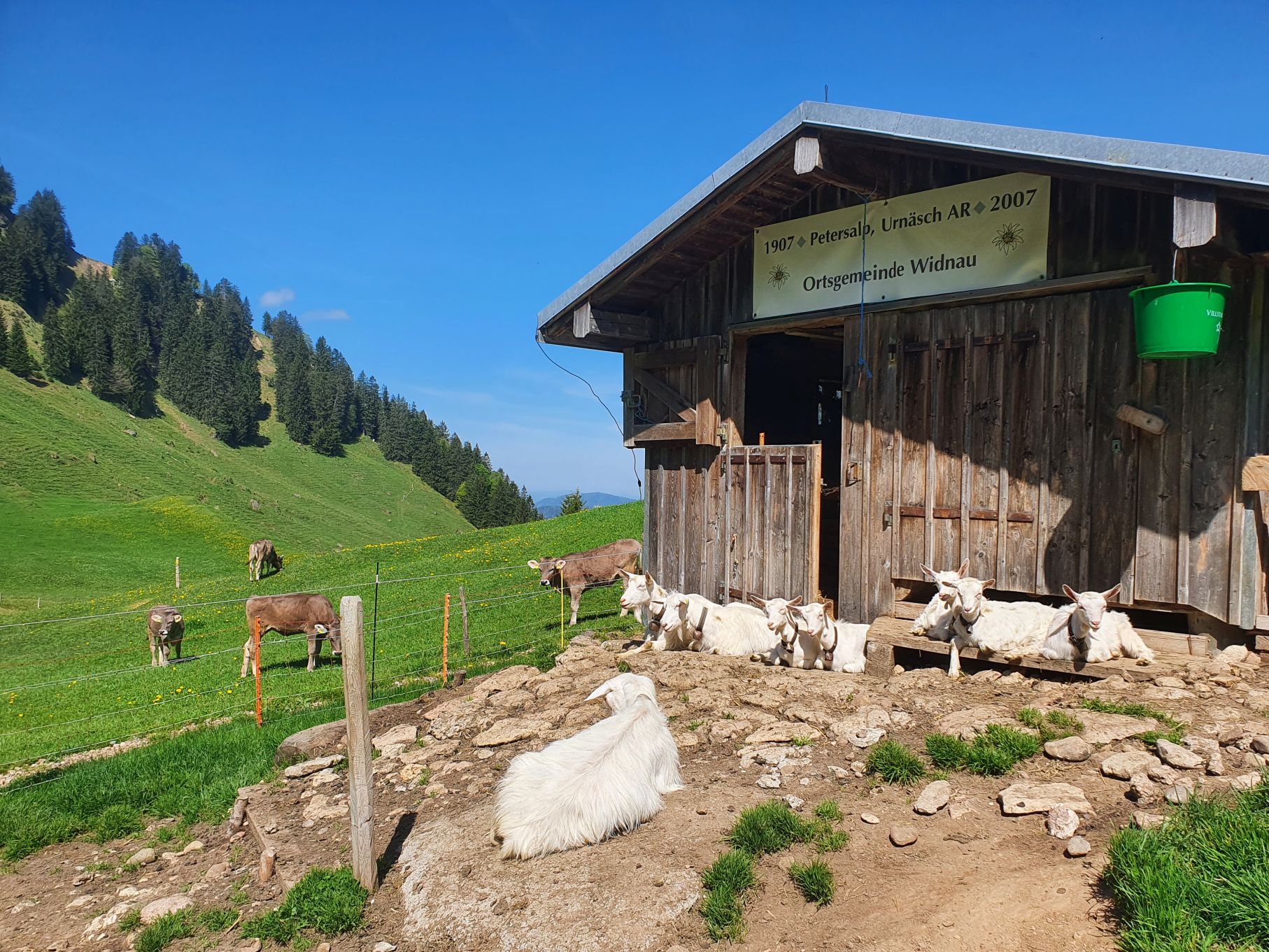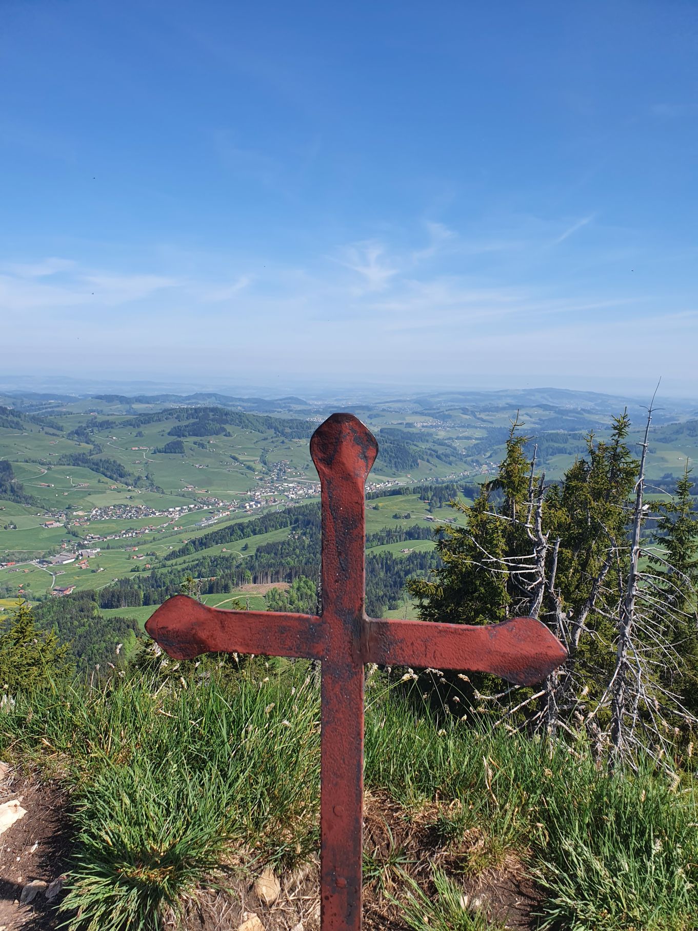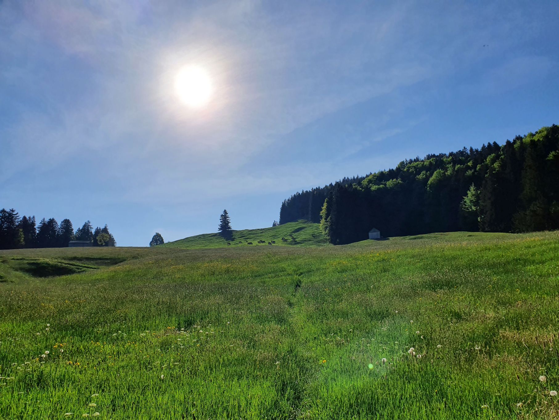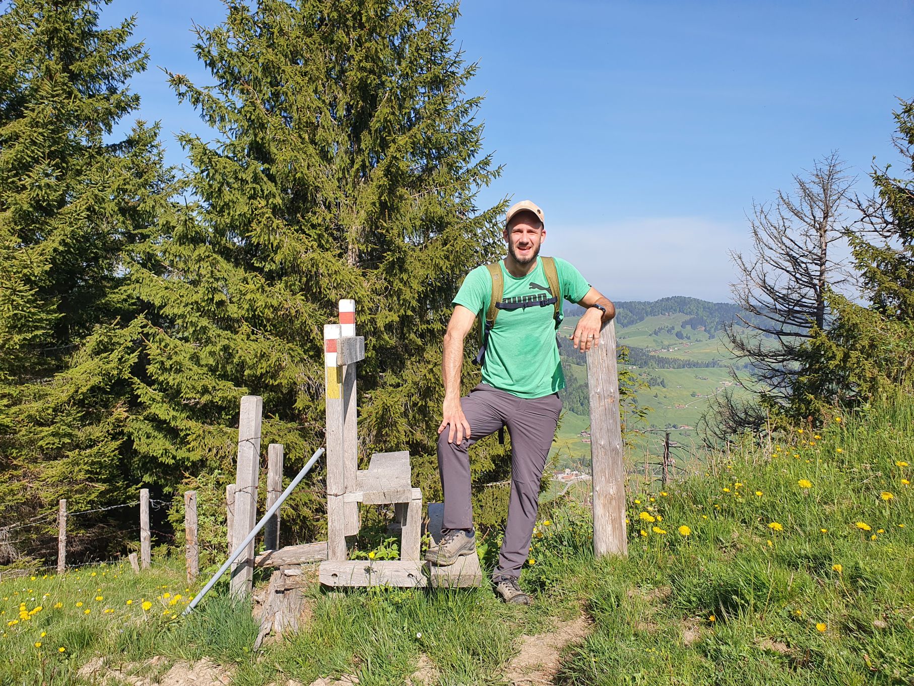 Nach einer Vollmondnacht sind wir heute Morgen bereits vor 6 Uhr aufgewacht und haben die Gunst der Stunde genutzt. Noch vor 9 Uhr machten wir uns von Urnäsch aus auf den Weg Richtung Spitzli. Die ersten zwei Kilometer geradeaus bis zur Grünau waren ein lockeres Aufwärmen, danach ging es dafür umso steiler hoch. Zuerst über weite, von Kühen beweidete Wiesen, dann noch steiler durch einen endlos scheinenden Wald, der mit einem lustigen Felsdurchschlupf endete. Von dort führten die letzten Höhenmeter wieder über Wiesen bis hinauf zum Spitzli, wo ein verhältnismässig kleines Kreuz auf uns wartete. Um 10.30 Uhr genossen wir bei herrlichem Sonnenschein bereits die Aussicht auf den Säntis, so früh haben wir es noch nie geschafft! Und so gönnten wir uns auf dem Rückweg auf der Petersalp noch ein Nickerchen, bevor wir bei sommerlichen Temperaturen das letzte Stück über Blattendürren auf uns nahmen. Als perfekten Abschluss durften unsere Füsse noch eine Runde im eiskalten Dürrenbach kneippen. Was für ein herrlicher Tag!