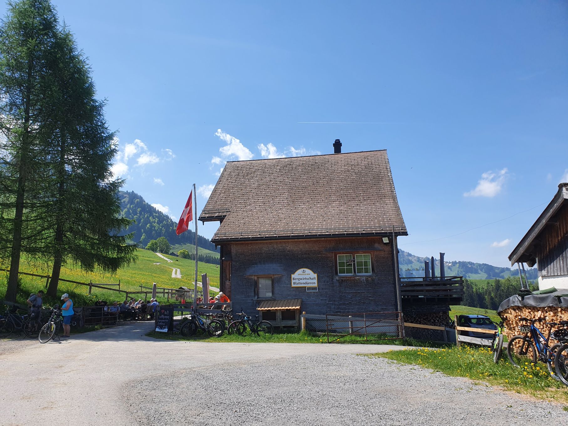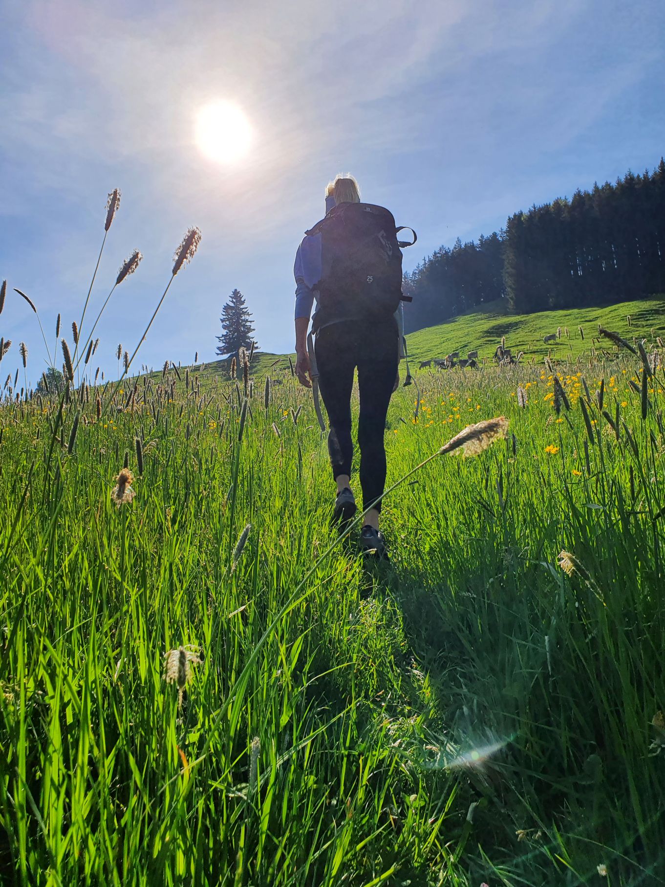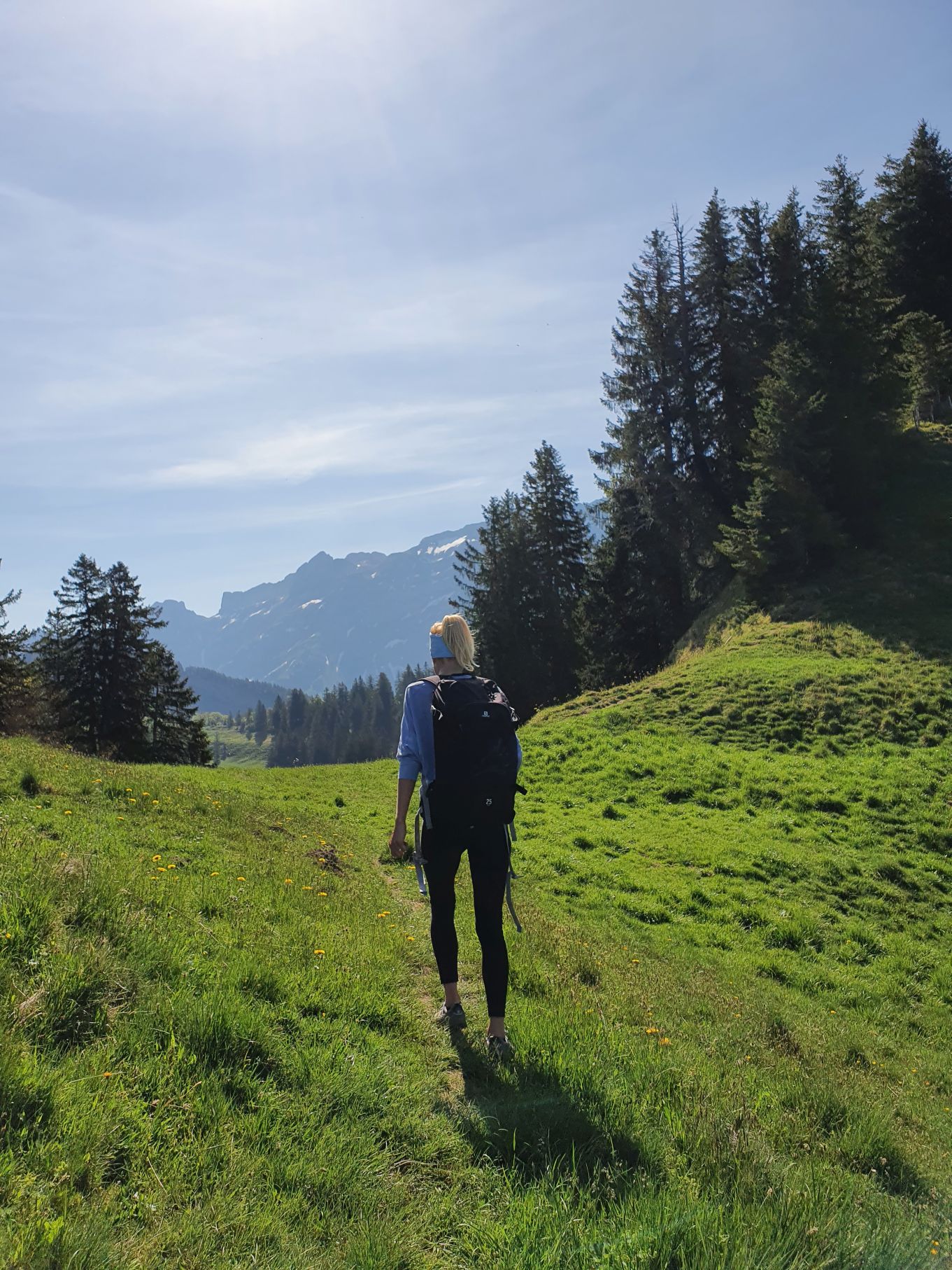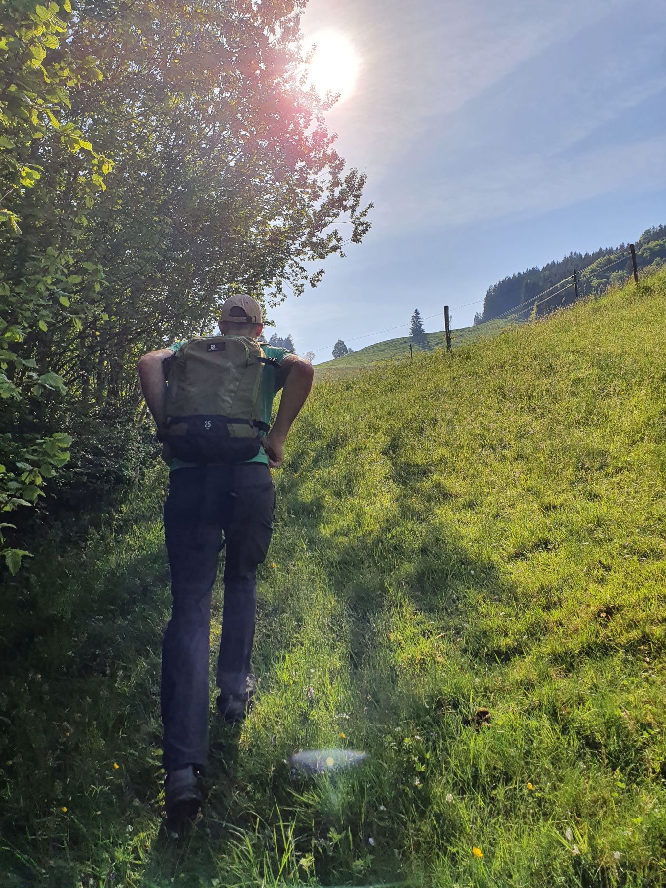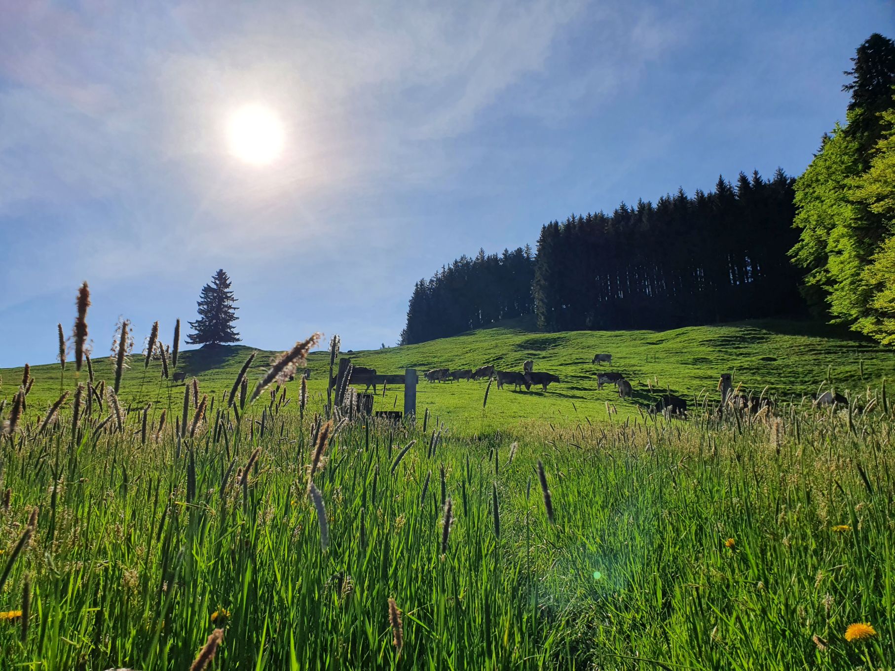 Nach einer Vollmondnacht sind wir heute Morgen bereits vor 6 Uhr aufgewacht und haben die Gunst der Stunde genutzt. Noch vor 9 Uhr machten wir uns von Urnäsch aus auf den Weg Richtung Spitzli. Die ersten zwei Kilometer geradeaus bis zur Grünau waren ein lockeres Aufwärmen, danach ging es dafür umso steiler hoch. Zuerst über weite, von Kühen beweidete Wiesen, dann noch steiler durch einen endlos scheinenden Wald, der mit einem lustigen Felsdurchschlupf endete. Von dort führten die letzten Höhenmeter wieder über Wiesen bis hinauf zum Spitzli, wo ein verhältnismässig kleines Kreuz auf uns wartete. Um 10.30 Uhr genossen wir bei herrlichem Sonnenschein bereits die Aussicht auf den Säntis, so früh haben wir es noch nie geschafft! Und so gönnten wir uns auf dem Rückweg auf der Petersalp noch ein Nickerchen, bevor wir bei sommerlichen Temperaturen das letzte Stück über Blattendürren auf uns nahmen. Als perfekten Abschluss durften unsere Füsse noch eine Runde im eiskalten Dürrenbach kneippen. Was für ein herrlicher Tag!