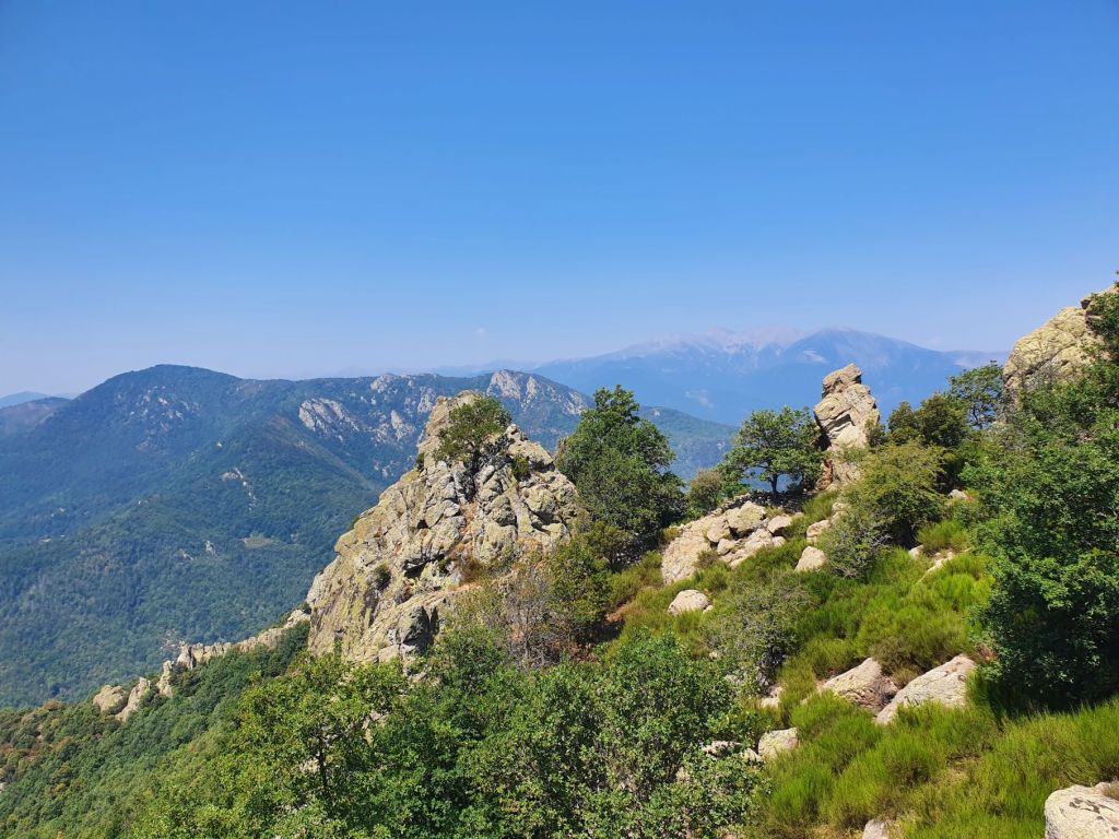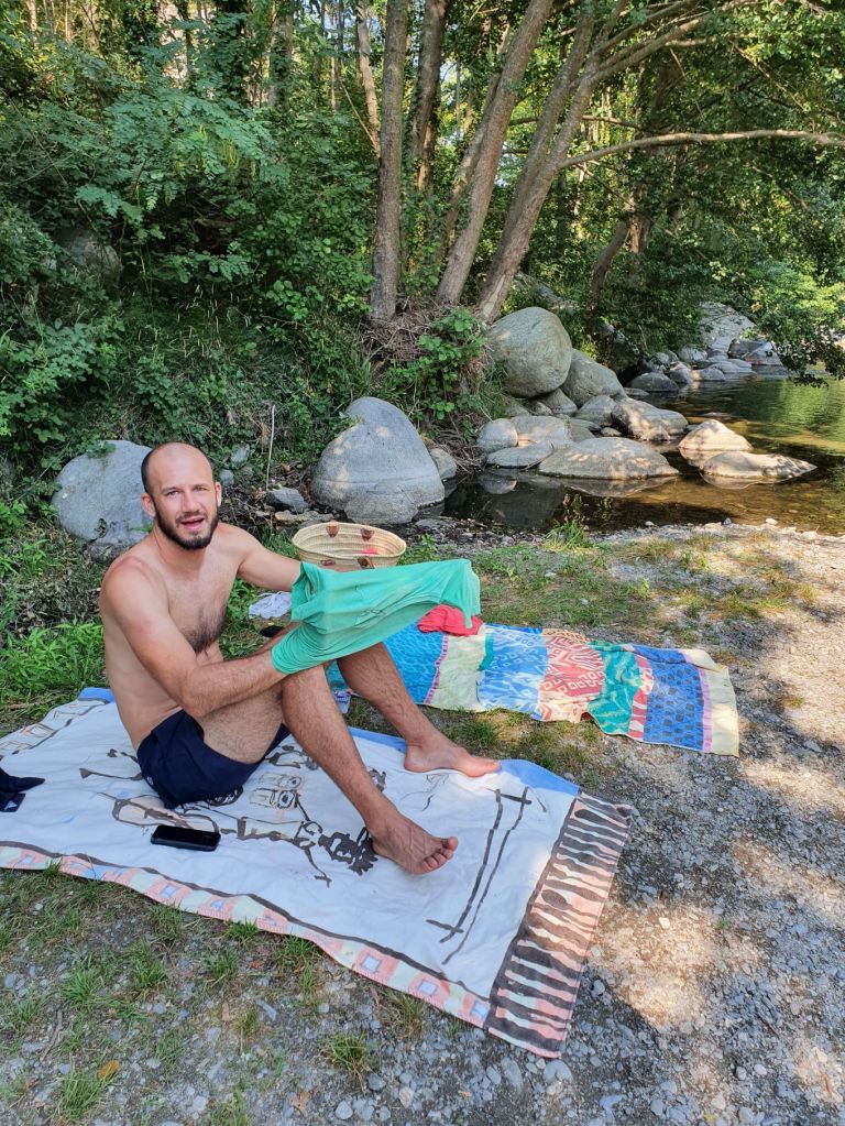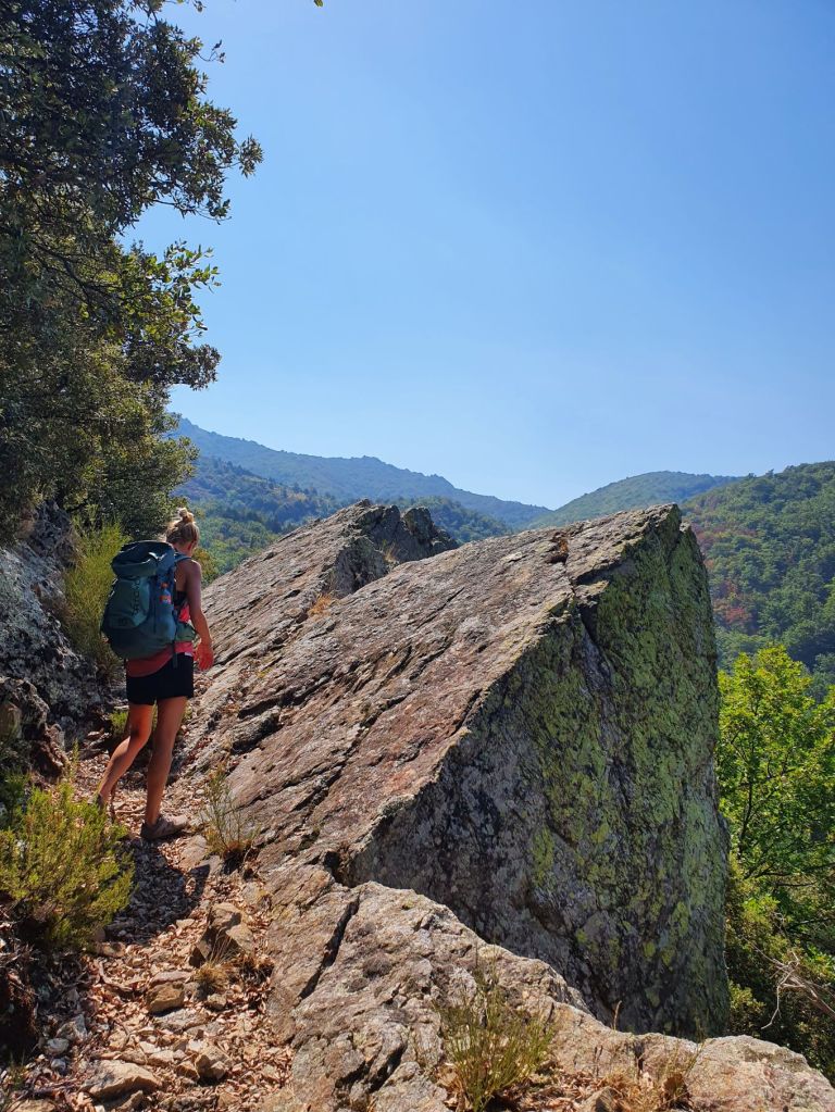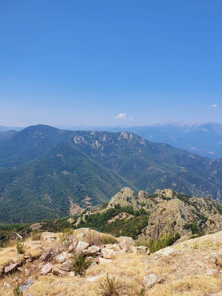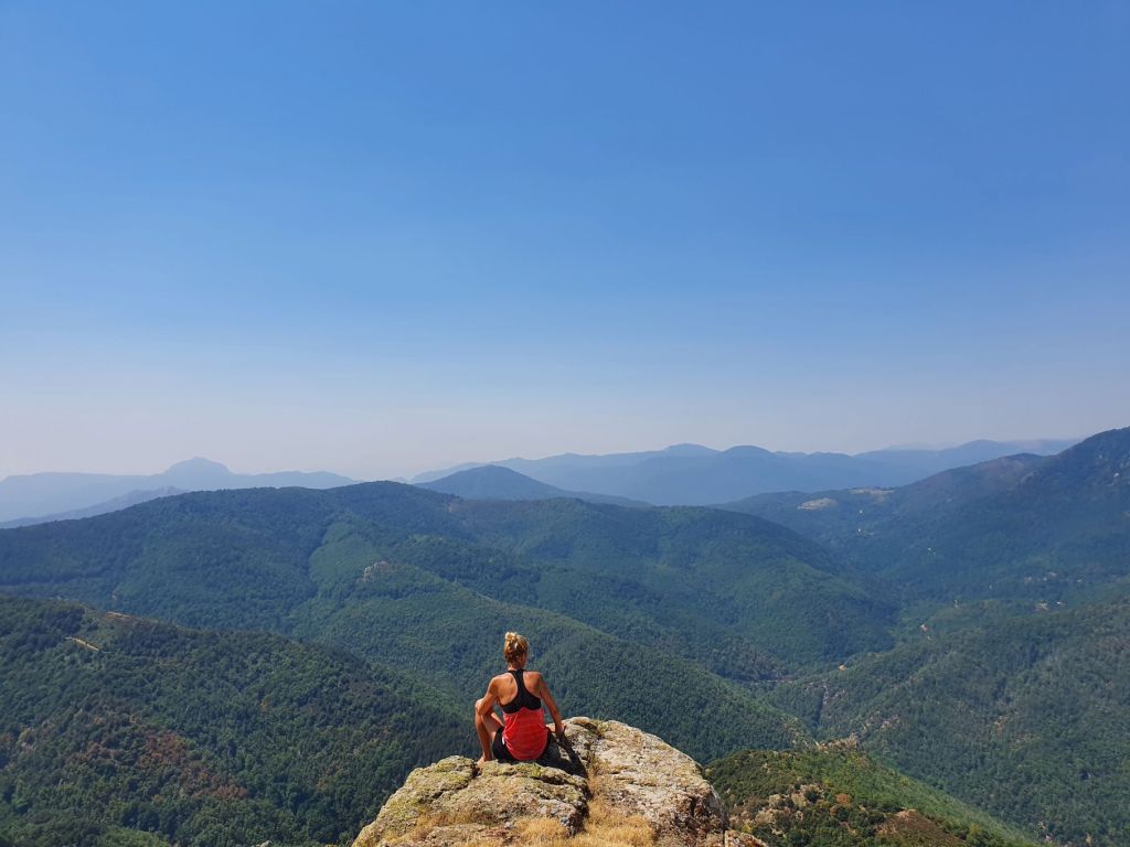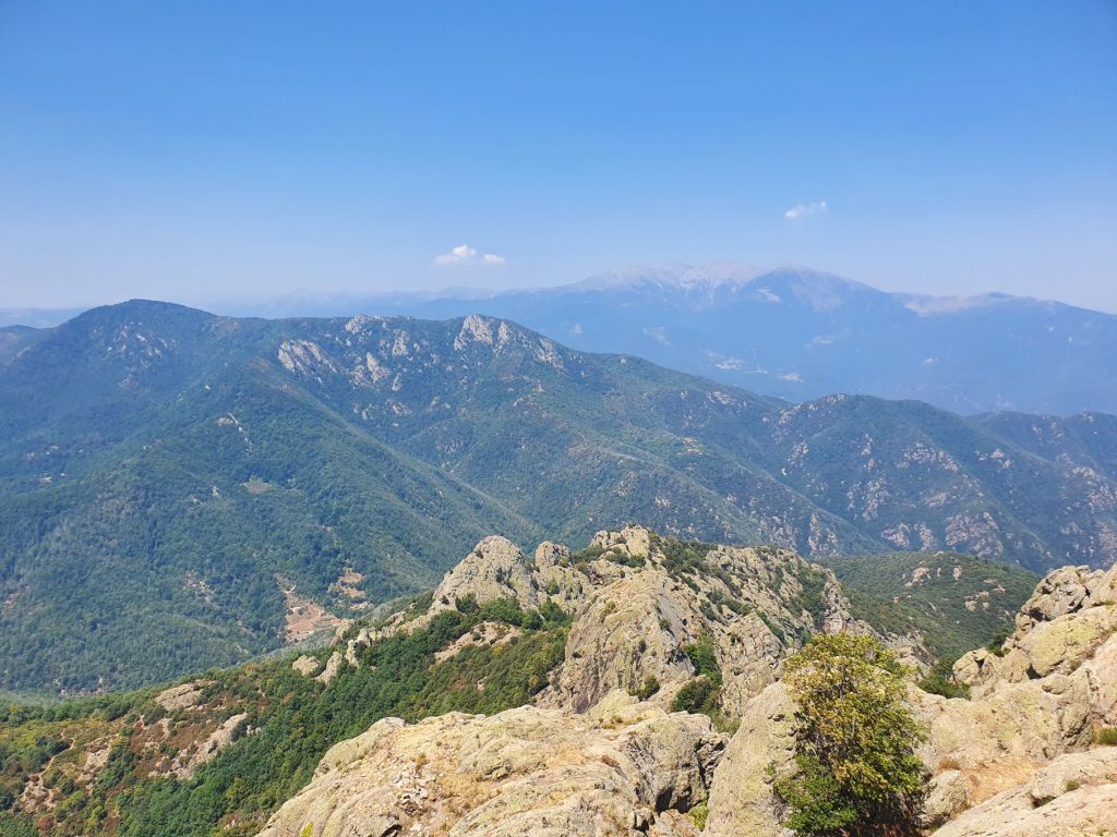 Nach einem wunderbar ruhigen Frühstück vor unserem katalanischen Steinhüttchen und einer abenteuerlichen Autofahrt zur Schutzhütte Moli de la Paleta, etwas oberhalb von Montalba gelegen, waren wir bereit für die Wanderung auf den Roc Saveur. Nach etwa einem Kilometer weiter der staubigen Bergstrasse entlang bogen wir links ab und liefen auf mit Laub überhäuften Wegen stetig hoch bis zum Fuss des Felsens Roc Saveur, wo es dann richtig steil und steinig wurde. Die letzten hundert Höhenmeter waren wir teilweise auf allen Vieren oder mit an den Steinen angemachter Seilhilfe unterwegs. Oben angekommen, machten wir es uns auf einem Stein gemütlich und sogen die herrliche Aussicht auf die umliegenden Gipfel, die weiten Waldflächen und das winzige Dörfchen Amélie-les-Bains in uns auf. So ganz alleine auf dem Gipfel die Schönheit der Natur zu geniessen ist ein unschlagbares Gefühl. Unten waren wir dann ziemlich schnell wieder. Die Vorfreude auf eine Abkühlung im Fluss Tech, beim Dorfeingang von Arles-sur-Tech, trieb uns förmlich an. Immerhin war es mindestens 34° heiss! Der Tech ist 84km lang, entspringt den Pyrenäen und mündet bei Argelès-sur-Mer, nahe der spanischen Grenze, ins Mittelmeer. So schnell im Wasser wie heute war ich wohl selten 😉