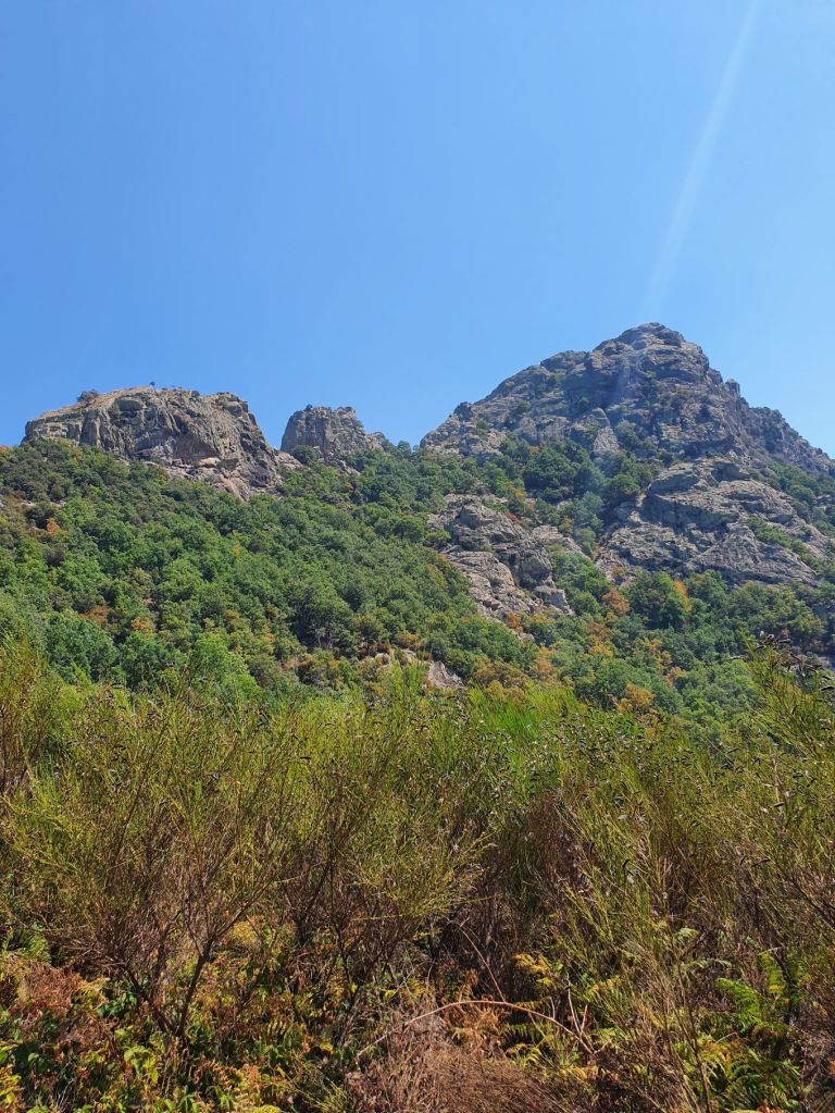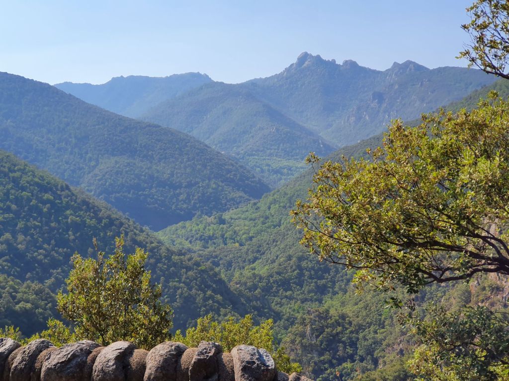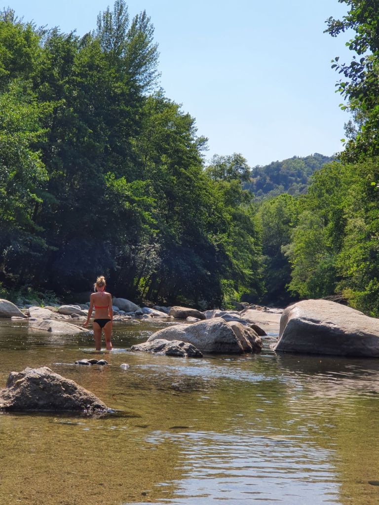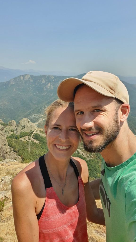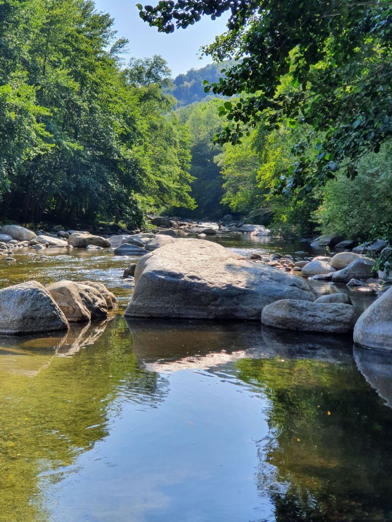 Nach einem wunderbar ruhigen Frühstück vor unserem katalanischen Steinhüttchen und einer abenteuerlichen Autofahrt zur Schutzhütte Moli de la Paleta, etwas oberhalb von Montalba gelegen, waren wir bereit für die Wanderung auf den Roc Saveur. Nach etwa einem Kilometer weiter der staubigen Bergstrasse entlang bogen wir links ab und liefen auf mit Laub überhäuften Wegen stetig hoch bis zum Fuss des Felsens Roc Saveur, wo es dann richtig steil und steinig wurde. Die letzten hundert Höhenmeter waren wir teilweise auf allen Vieren oder mit an den Steinen angemachter Seilhilfe unterwegs. Oben angekommen, machten wir es uns auf einem Stein gemütlich und sogen die herrliche Aussicht auf die umliegenden Gipfel, die weiten Waldflächen und das winzige Dörfchen Amélie-les-Bains in uns auf. So ganz alleine auf dem Gipfel die Schönheit der Natur zu geniessen ist ein unschlagbares Gefühl. Unten waren wir dann ziemlich schnell wieder. Die Vorfreude auf eine Abkühlung im Fluss Tech, beim Dorfeingang von Arles-sur-Tech, trieb uns förmlich an. Immerhin war es mindestens 34° heiss! Der Tech ist 84km lang, entspringt den Pyrenäen und mündet bei Argelès-sur-Mer, nahe der spanischen Grenze, ins Mittelmeer. So schnell im Wasser wie heute war ich wohl selten 😉