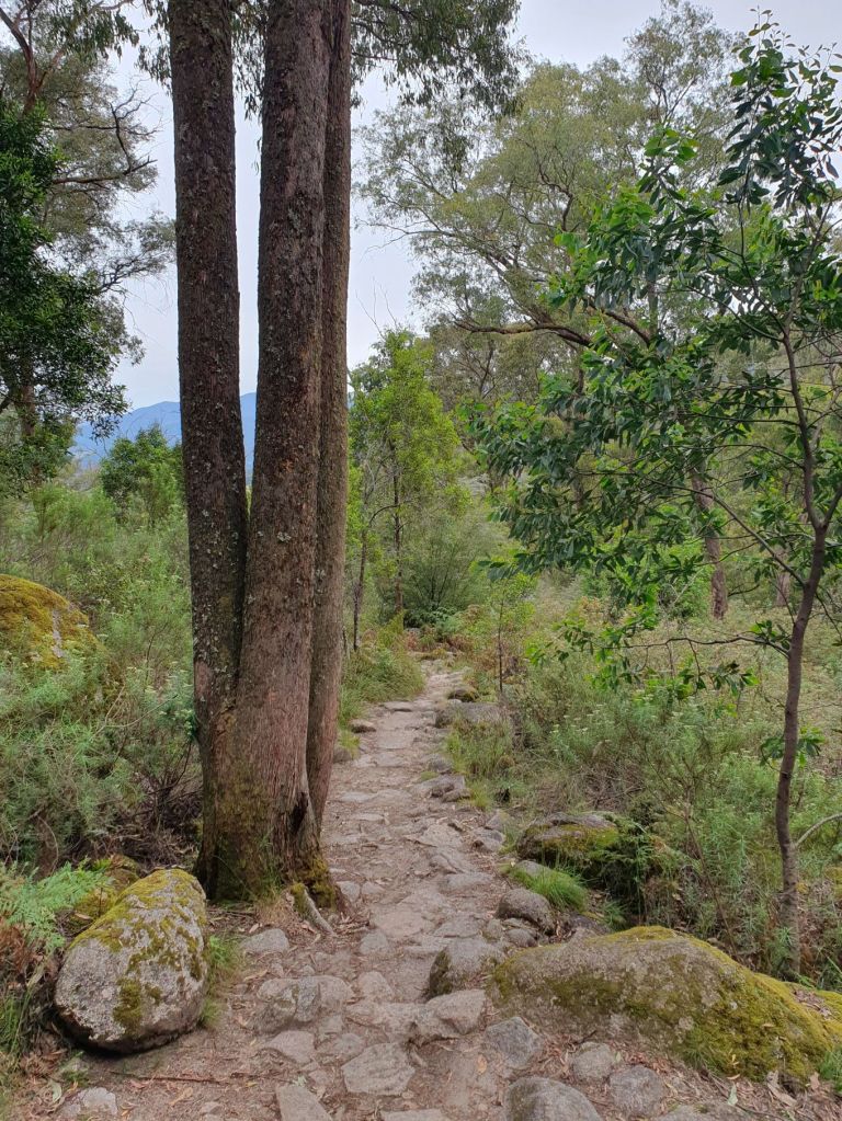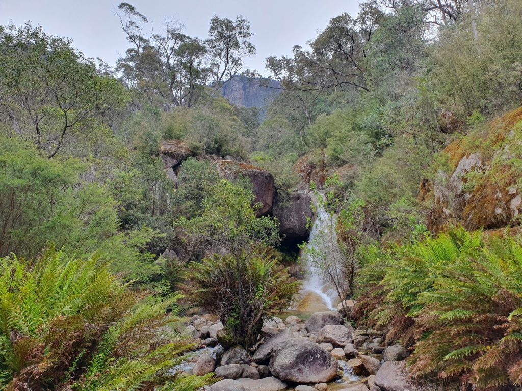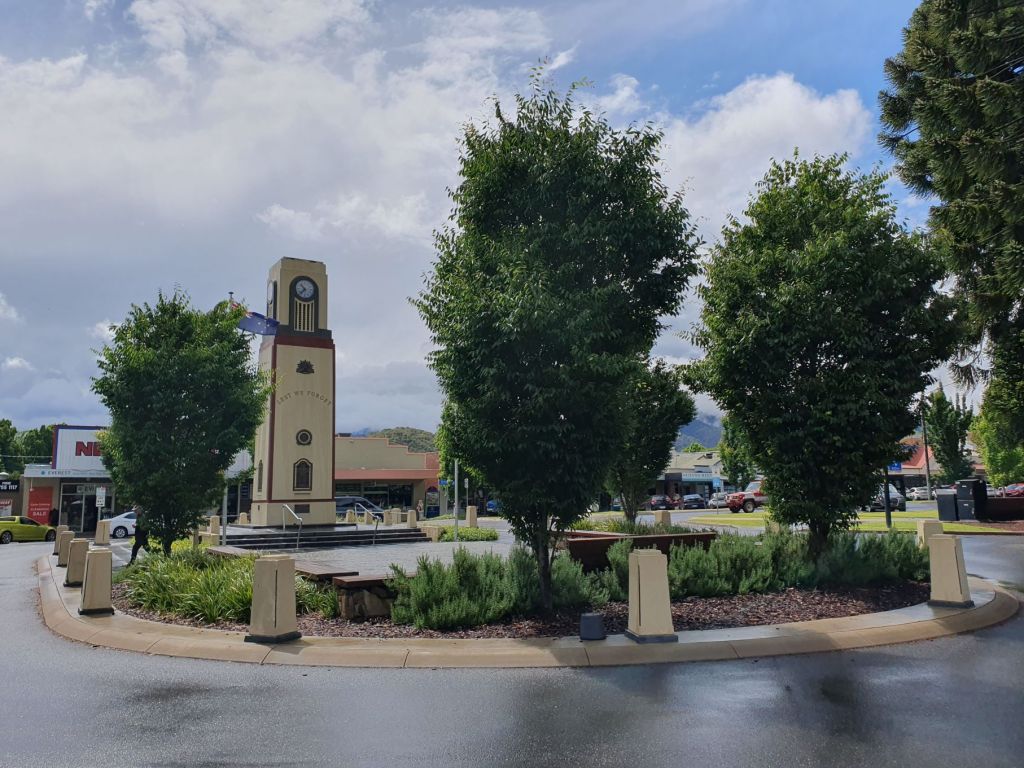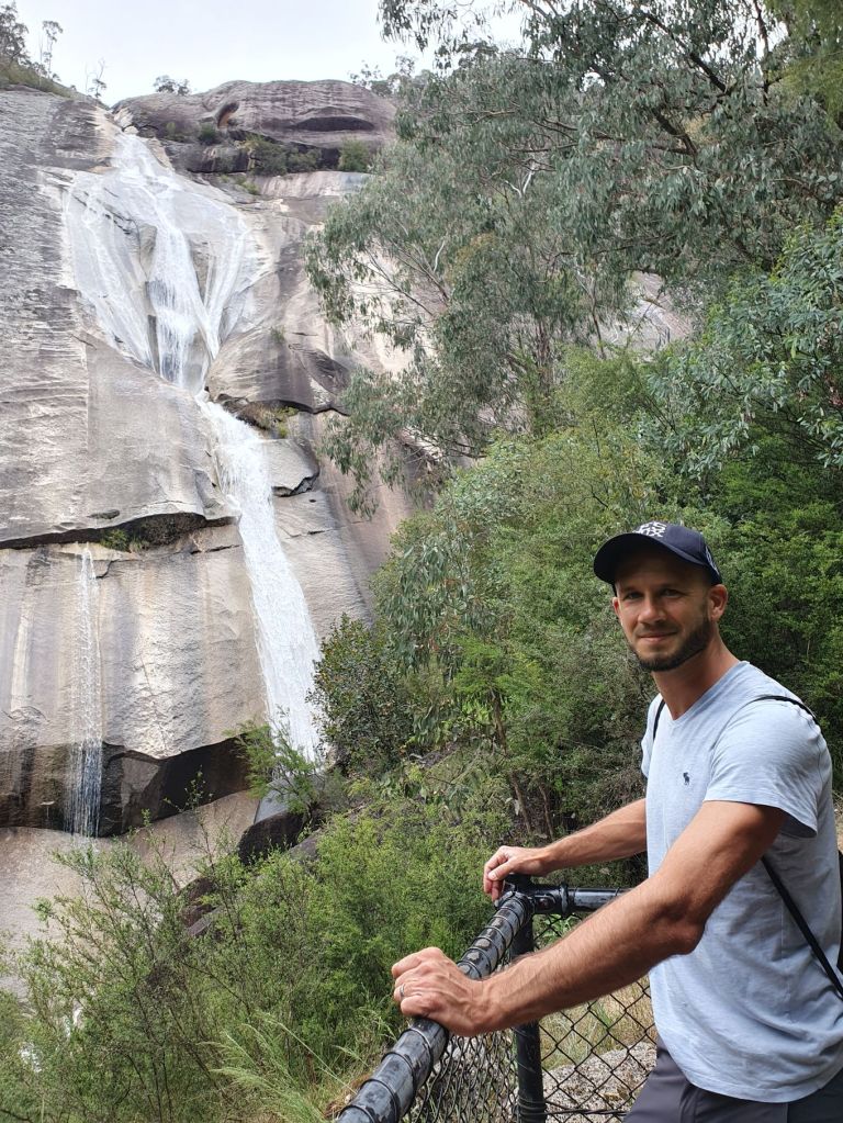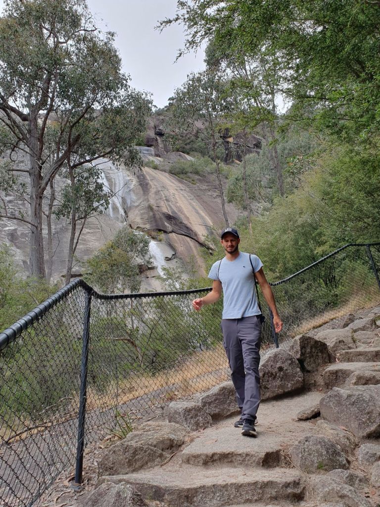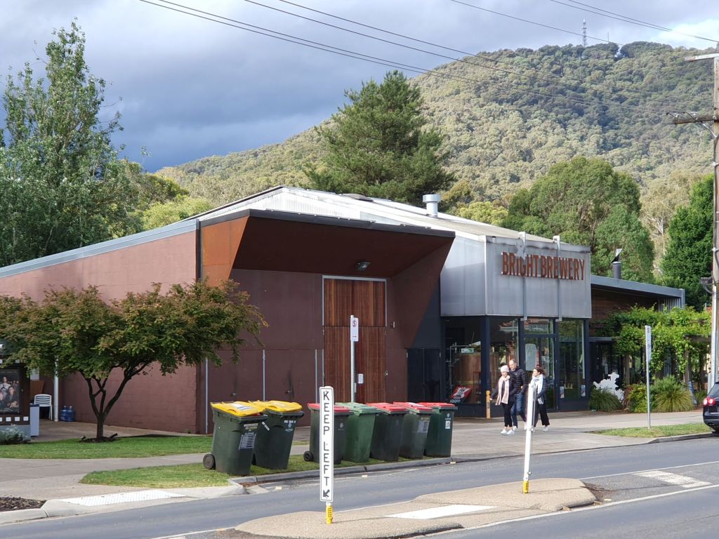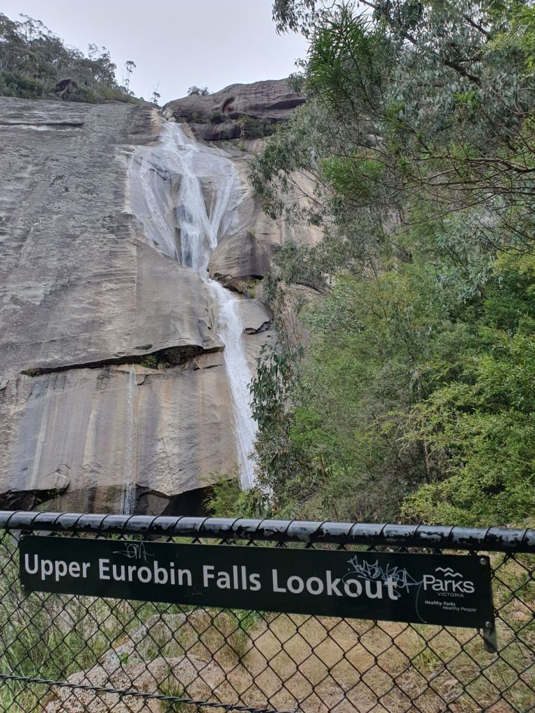 Am frühen Sonntagmorgen verabschiedeten wir uns vom wunderschönen Jyndabyne Lake und machten uns auf den fünfstündigen Weg nach Bright. Bright ist eine herzige, für Ferien attraktive Kleinstadt, die neben Porepunkah und Harrietville auf der wunderschönen Great Alpine Road liegt. Aufgrund der Nähe zu den Nationalparks Mount Buffalo und Alpine National Park, sowie den Skigebieten Mount Buffalo, Mount Hotham und Falls Creek, zieht es viele Einheimische und Touristen an. Unser Ziel war es, vor dem angekündigten Gewitter noch die nahegelegenen Eurobin Falls zu besichtigen, was wir gerade noch geschafft haben. Um den wirklich sehr schönen und mit seinen flachen Steinplatten einzigartigen Wasserfall zu sehen, mussten wir nur ein paar wenige hundert Meter hochlaufen. Tiptop, um die Beine zu vertreten nach der langen Fahrt, aber so ultrakurze Strecken hinterlassen nicht die gleichen Spuren wie richtige Wanderungen. Aber mehr lag an diesem regnerischen Tag einfach nicht drin. Bis wir im Woolie’s in Bright ankamen, regnete es in Strömen.