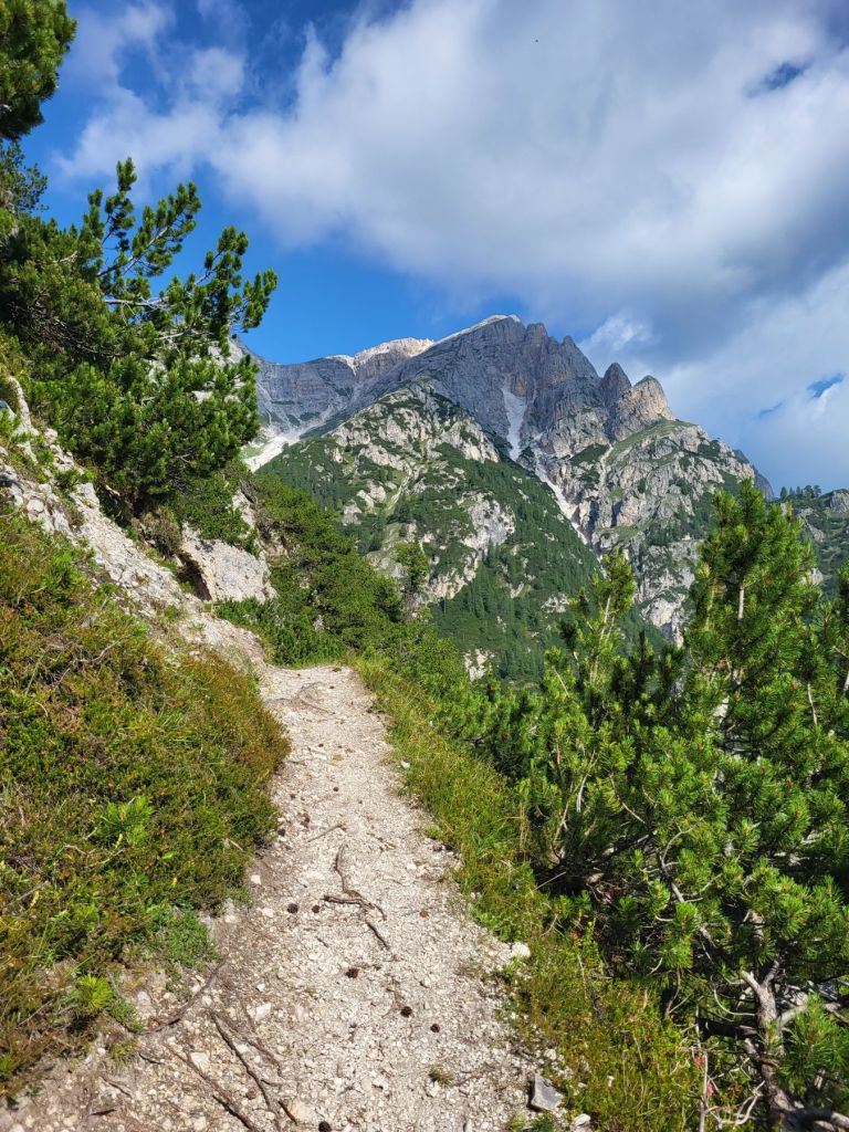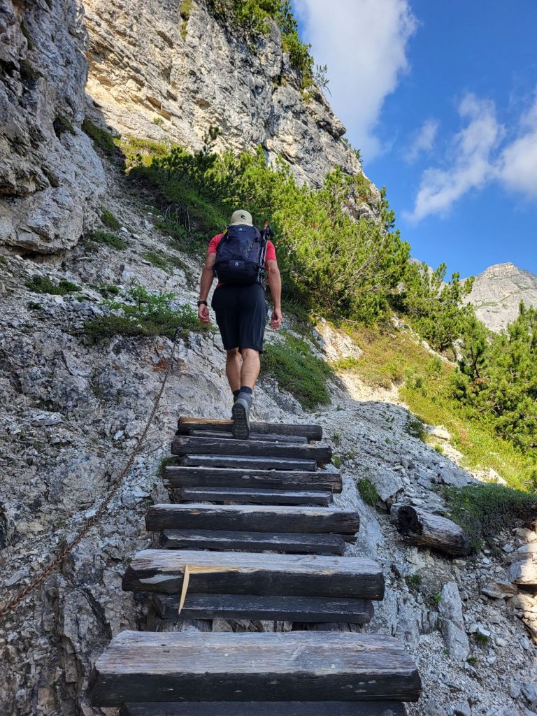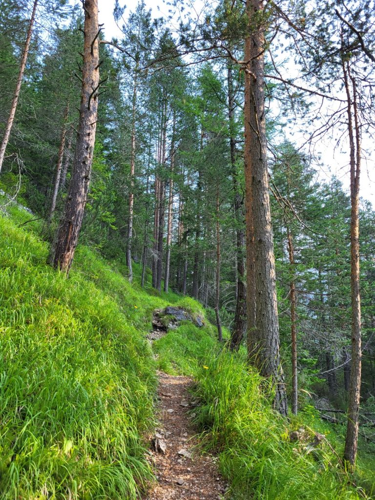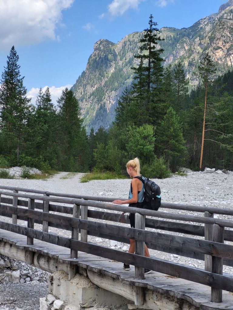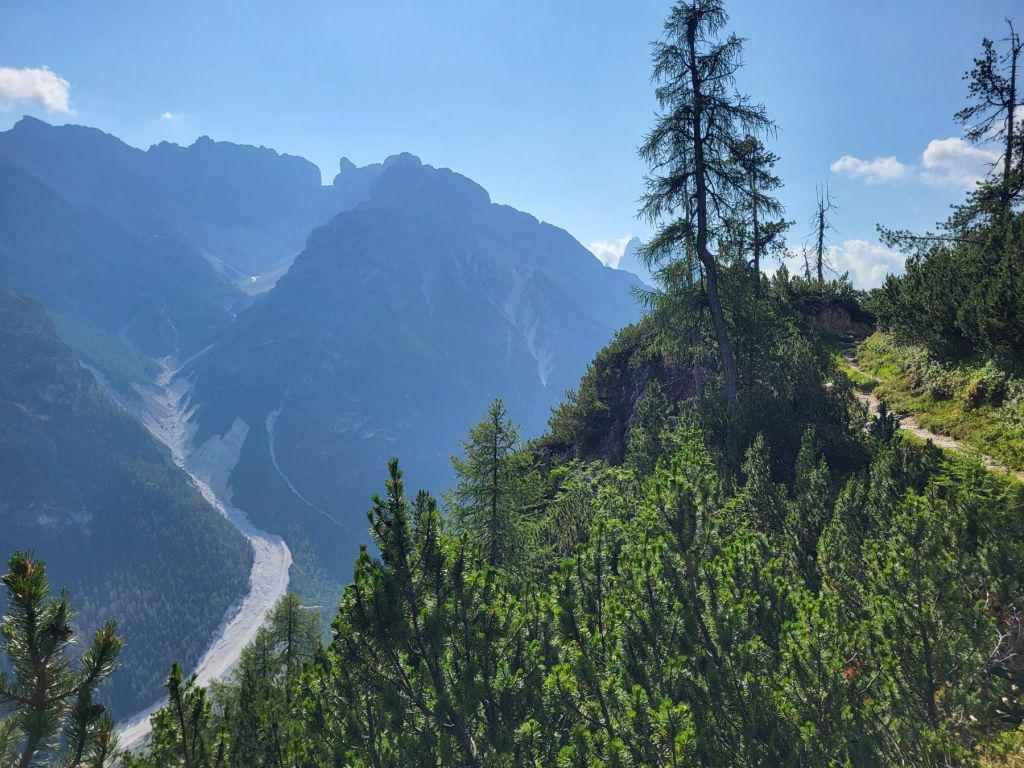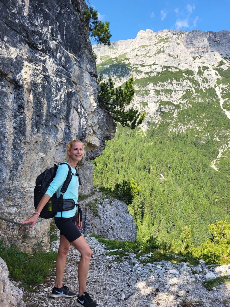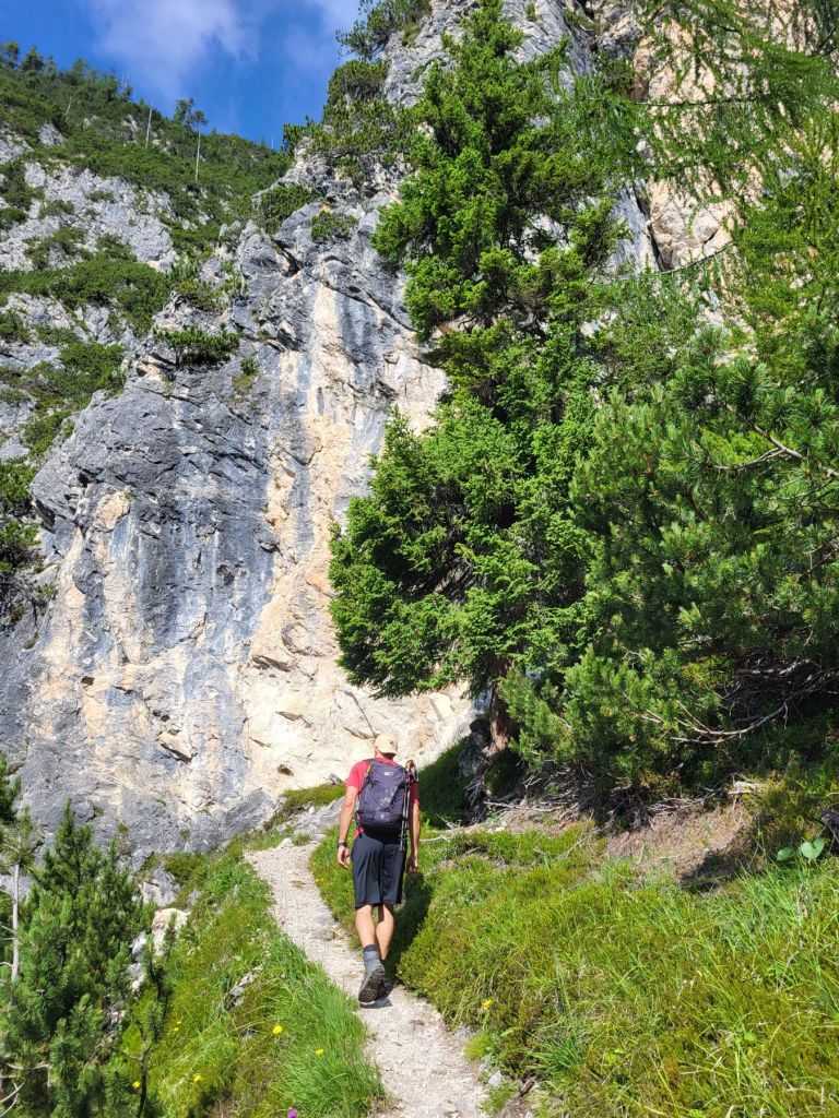 Heute waren wir früh dran und super motiviert den Strudelkopf zu erklimmen. Die Tatsache, dass wir um 8.15 Uhr die ersten auf dem Parkplatz waren, steigerte unsere Vorfreude noch mehr. Wir überquerten die Strasse und stiegen direkt in den Weg Nummer 34 Richtung Strudelkopf ein. Da wir die steile Felswand vom Parkplatz aus schon gesehen hatten, wussten wir, was auf uns zukam. Stetig ansteigend stiegen wir den schmalen, aber gut begehbaren Weg hoch. Während der ersten halben Stunde gab es ein paar wenige, etwas ausgesetzte Stellen, im Grossen und Ganzen war der Weg aber kein Problem. Und die Aussicht wurde mit jedem Höhenmeter beeindruckender. Dann, nach gut der Hälfte der Wanderung, kamen wir zuerst zu einer Holztreppe und kurz darauf zu einem kurzen Tunnel. Und dann hätte der Weg über einen alten, sehr ausgesetzten Kriegssteig vom 1.Weltkrieg in das obere Helltal geführt. Aber obwohl der ehemalige Kriegssteig durch ein Drahtseil gesichert war – für mich war es zu viel. Ein Blick hunderte von Metern gerade die Felswand hinunter hat genügt, um die Angst ins Unerträgliche ansteigen zu lassen. Schweren Herzens mussten wir also wieder umkehren. Zügig liefen wir den Weg zurück ins Tal. Dort entschieden wir uns, noch die knappe halbe Stunde bis zum Dürrensee zu gehen und dort unser Picknick zu geniessen. Und das hat sich dann auch gelohnt. Wieder fast alleine – wie schon den ganzen Morgen – marschierten wir bei gefühlten 35° und mit Blick auf die drei Zinnen zum Dürrensee, wo wir unsere Beine auf den kühlenden Steinen ausstreckten, unser Mittagessen verputzten und noch ein herrliches Nickerchen im Schatten machten. Und die Aussicht vom Tal war genauso beeindruckend wie von oben. So haben wir trotz nicht erreichtem Ziel schöne Eindrücke sammeln können.