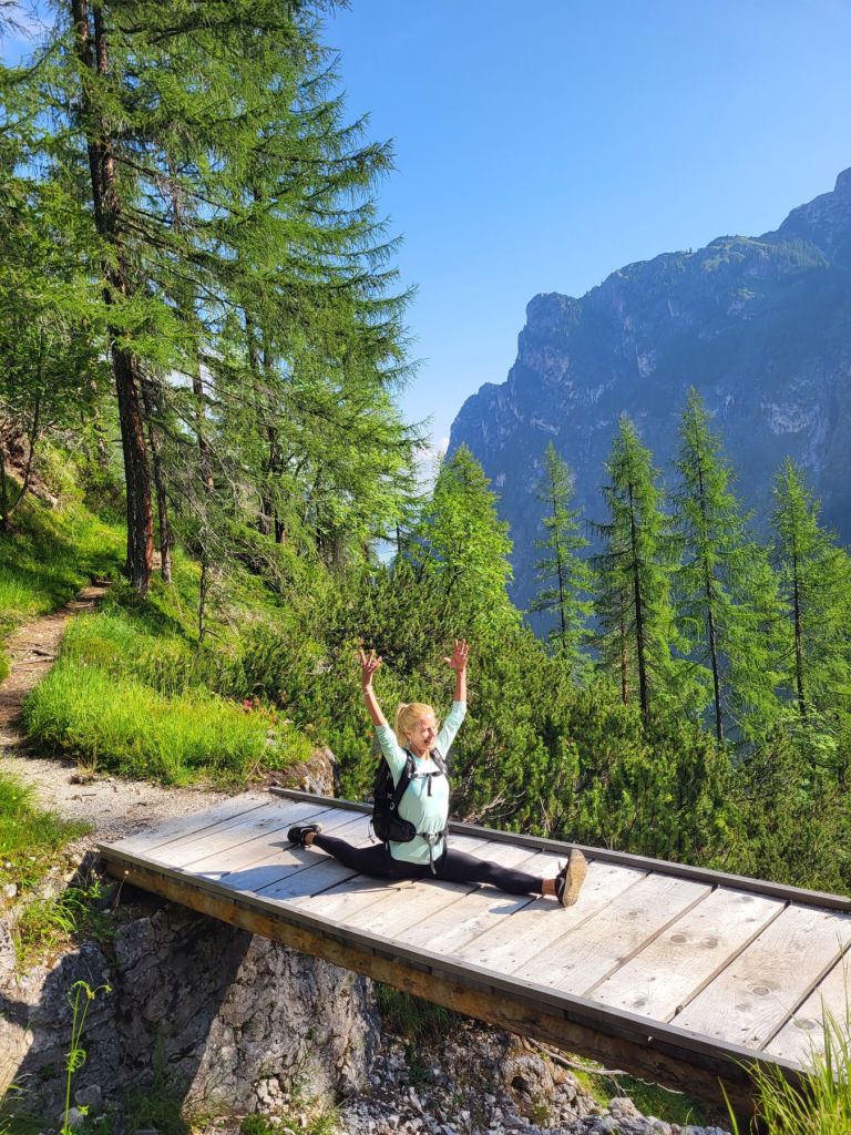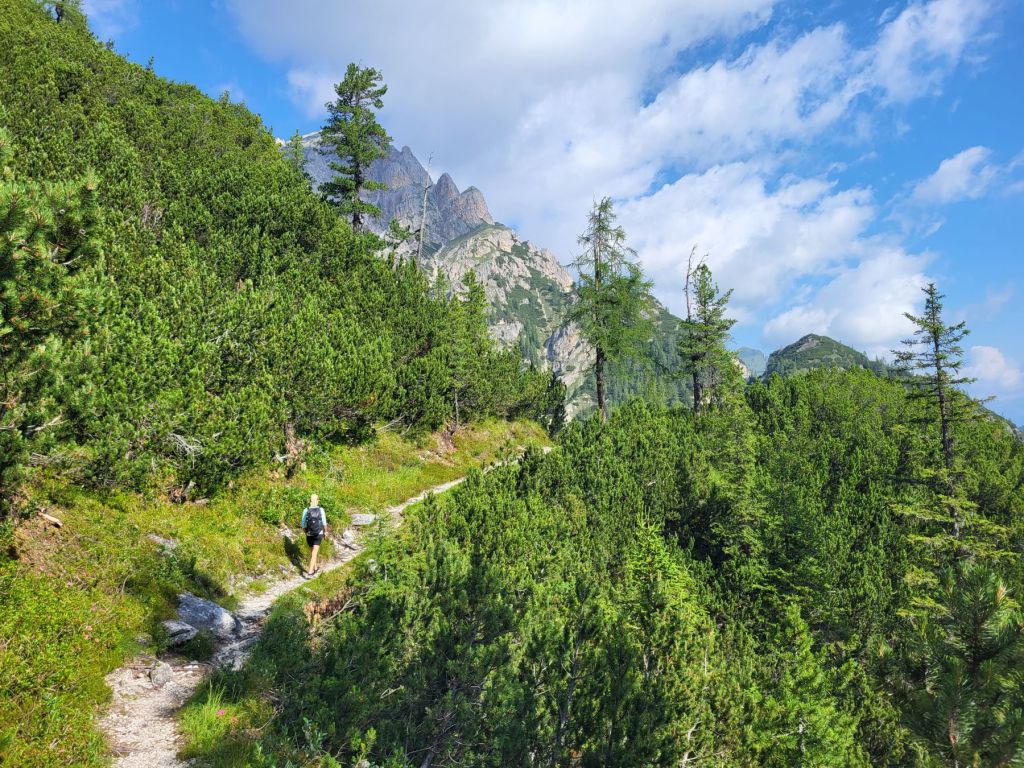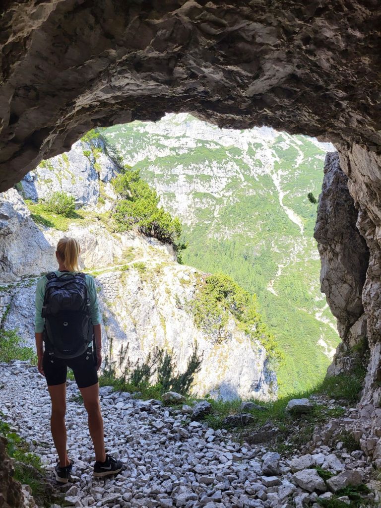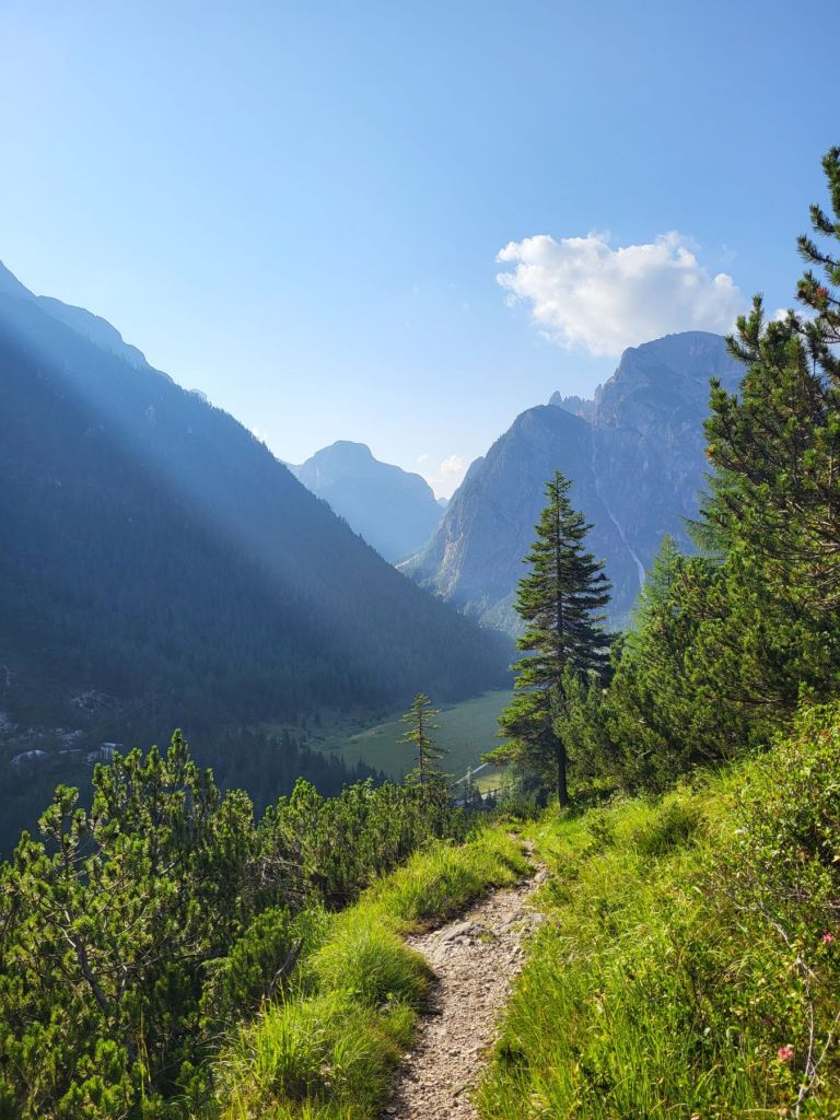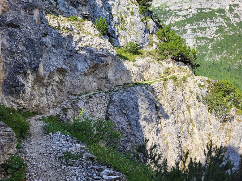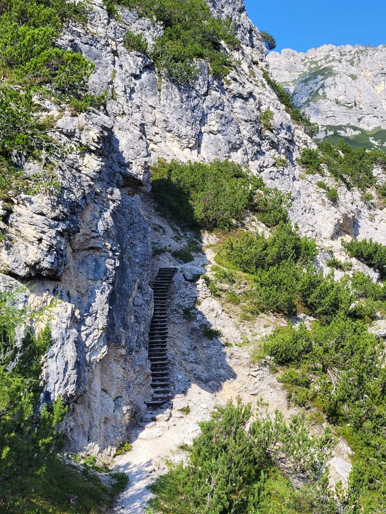 Heute waren wir früh dran und super motiviert den Strudelkopf zu erklimmen. Die Tatsache, dass wir um 8.15 Uhr die ersten auf dem Parkplatz waren, steigerte unsere Vorfreude noch mehr. Wir überquerten die Strasse und stiegen direkt in den Weg Nummer 34 Richtung Strudelkopf ein. Da wir die steile Felswand vom Parkplatz aus schon gesehen hatten, wussten wir, was auf uns zukam. Stetig ansteigend stiegen wir den schmalen, aber gut begehbaren Weg hoch. Während der ersten halben Stunde gab es ein paar wenige, etwas ausgesetzte Stellen, im Grossen und Ganzen war der Weg aber kein Problem. Und die Aussicht wurde mit jedem Höhenmeter beeindruckender. Dann, nach gut der Hälfte der Wanderung, kamen wir zuerst zu einer Holztreppe und kurz darauf zu einem kurzen Tunnel. Und dann hätte der Weg über einen alten, sehr ausgesetzten Kriegssteig vom 1.Weltkrieg in das obere Helltal geführt. Aber obwohl der ehemalige Kriegssteig durch ein Drahtseil gesichert war – für mich war es zu viel. Ein Blick hunderte von Metern gerade die Felswand hinunter hat genügt, um die Angst ins Unerträgliche ansteigen zu lassen. Schweren Herzens mussten wir also wieder umkehren. Zügig liefen wir den Weg zurück ins Tal. Dort entschieden wir uns, noch die knappe halbe Stunde bis zum Dürrensee zu gehen und dort unser Picknick zu geniessen. Und das hat sich dann auch gelohnt. Wieder fast alleine – wie schon den ganzen Morgen – marschierten wir bei gefühlten 35° und mit Blick auf die drei Zinnen zum Dürrensee, wo wir unsere Beine auf den kühlenden Steinen ausstreckten, unser Mittagessen verputzten und noch ein herrliches Nickerchen im Schatten machten. Und die Aussicht vom Tal war genauso beeindruckend wie von oben. So haben wir trotz nicht erreichtem Ziel schöne Eindrücke sammeln können.