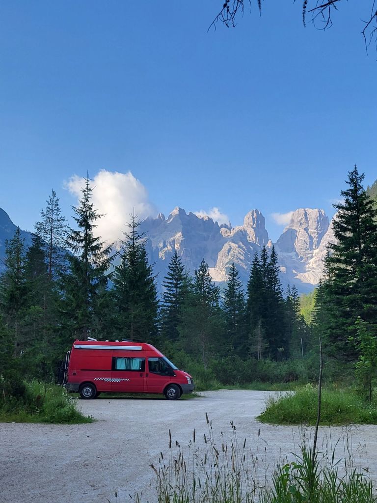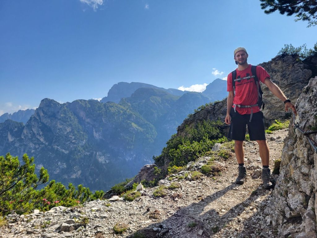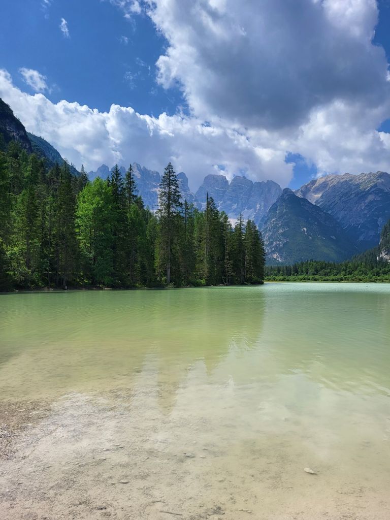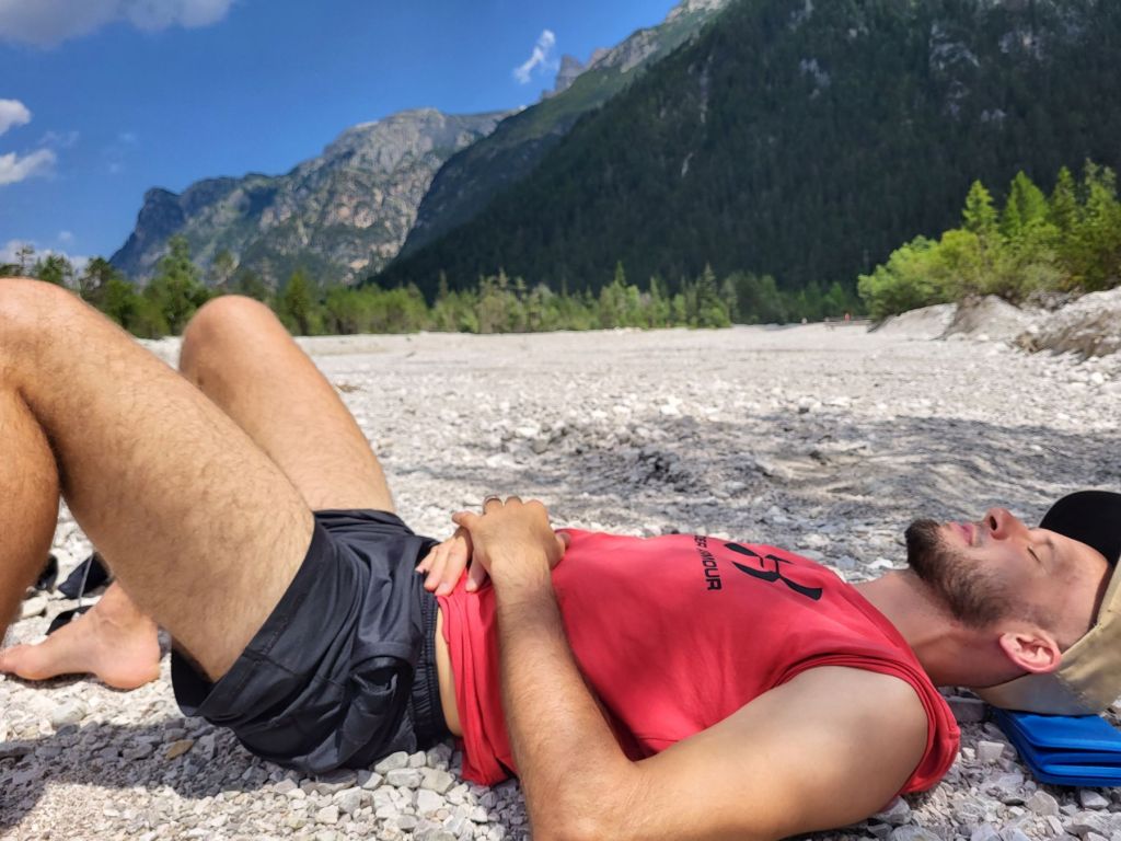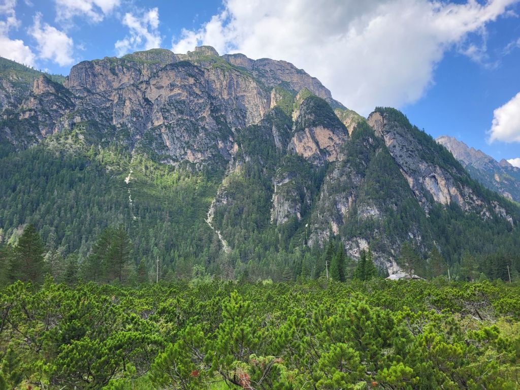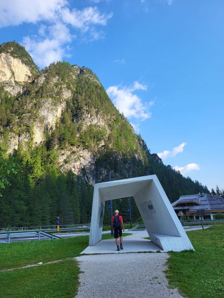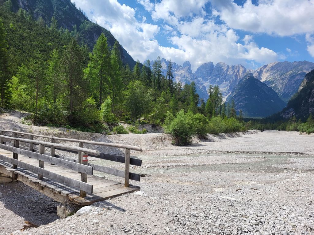 Heute waren wir früh dran und super motiviert den Strudelkopf zu erklimmen. Die Tatsache, dass wir um 8.15 Uhr die ersten auf dem Parkplatz waren, steigerte unsere Vorfreude noch mehr. Wir überquerten die Strasse und stiegen direkt in den Weg Nummer 34 Richtung Strudelkopf ein. Da wir die steile Felswand vom Parkplatz aus schon gesehen hatten, wussten wir, was auf uns zukam. Stetig ansteigend stiegen wir den schmalen, aber gut begehbaren Weg hoch. Während der ersten halben Stunde gab es ein paar wenige, etwas ausgesetzte Stellen, im Grossen und Ganzen war der Weg aber kein Problem. Und die Aussicht wurde mit jedem Höhenmeter beeindruckender. Dann, nach gut der Hälfte der Wanderung, kamen wir zuerst zu einer Holztreppe und kurz darauf zu einem kurzen Tunnel. Und dann hätte der Weg über einen alten, sehr ausgesetzten Kriegssteig vom 1.Weltkrieg in das obere Helltal geführt. Aber obwohl der ehemalige Kriegssteig durch ein Drahtseil gesichert war – für mich war es zu viel. Ein Blick hunderte von Metern gerade die Felswand hinunter hat genügt, um die Angst ins Unerträgliche ansteigen zu lassen. Schweren Herzens mussten wir also wieder umkehren. Zügig liefen wir den Weg zurück ins Tal. Dort entschieden wir uns, noch die knappe halbe Stunde bis zum Dürrensee zu gehen und dort unser Picknick zu geniessen. Und das hat sich dann auch gelohnt. Wieder fast alleine – wie schon den ganzen Morgen – marschierten wir bei gefühlten 35° und mit Blick auf die drei Zinnen zum Dürrensee, wo wir unsere Beine auf den kühlenden Steinen ausstreckten, unser Mittagessen verputzten und noch ein herrliches Nickerchen im Schatten machten. Und die Aussicht vom Tal war genauso beeindruckend wie von oben. So haben wir trotz nicht erreichtem Ziel schöne Eindrücke sammeln können.