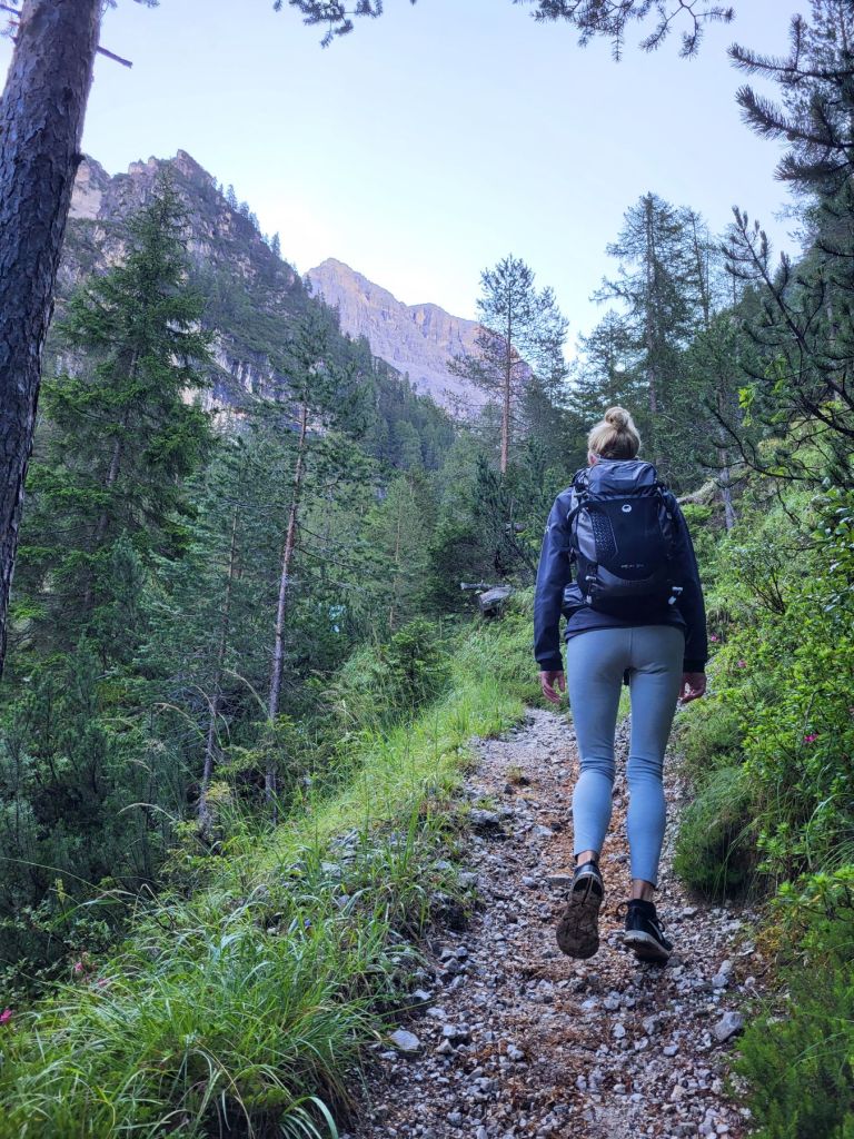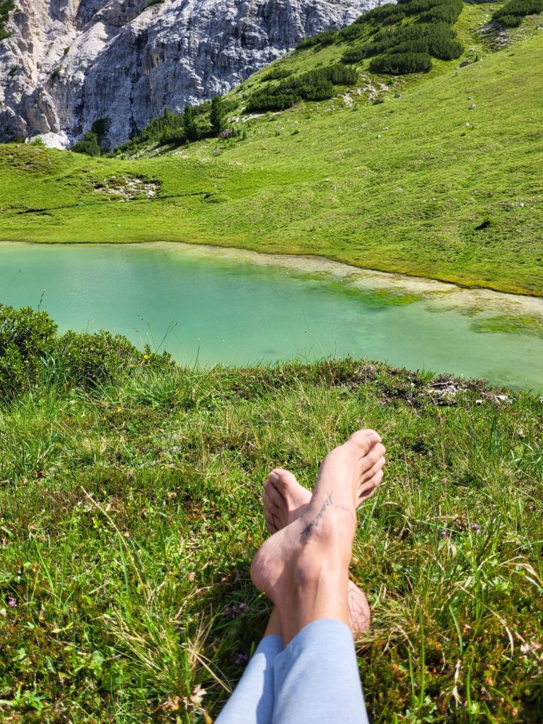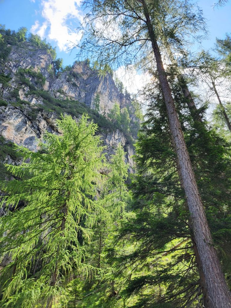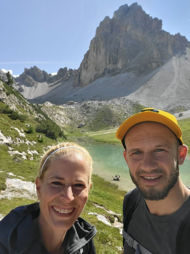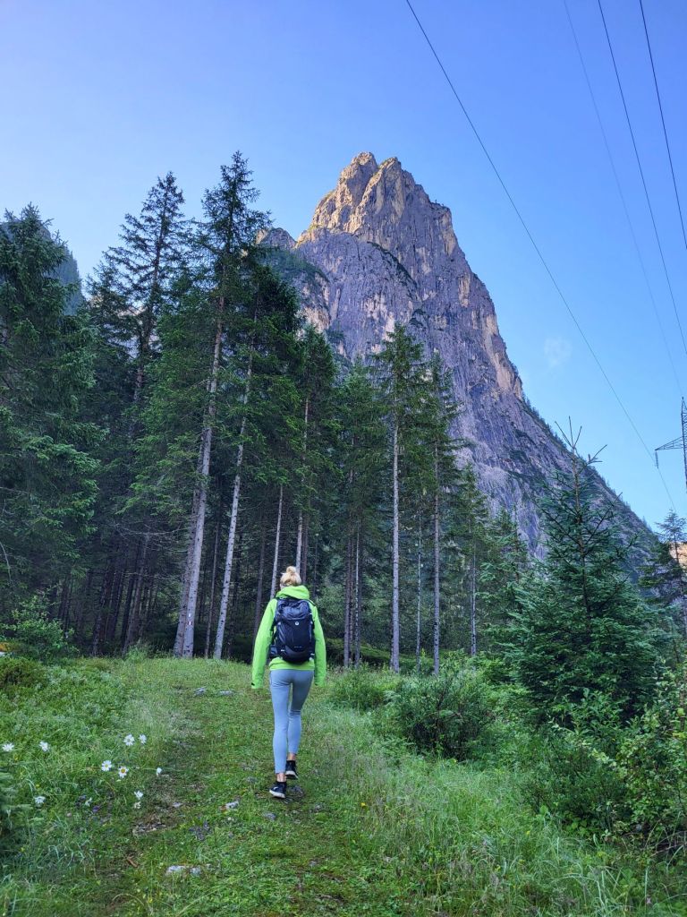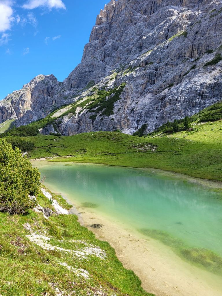 Aufgrund der schlechten Wettervorhersagen für den Freitag, war heute leider schon unser letzter Wandertag in den Dolomiten. Wir wählten eine nahegelegene Route, die eher weniger begangen wird und zu einem See führt. Und das war eine super Entscheidung! Um 8 Uhr waren wir bereits startklar und machten uns auf den Weg Richtung Schafalm. Da es von Beginn weg steil durch den Wald hoch ging, gewannen wir schnell an Höhe. Schon eine halbe Stunde später konnten bis zum Toblacher See blicken. Dann folgten zwei Flussüberquerungen und ein paar steile Kurven später erreichten wir die herzige Schafalm. Dort machten wir eine kurze Rast und liefen dann die letzten Höhenmeter durch den Wald, bevor wir der Felswand entlang links abbogen. Dann kam ein Teilstück, welches wohl typisch ist für Wanderungen in den sehr steilen Dolomiten; ein schmaler Kieselweg der Felswand entlang, extrem abschüssig, mit Drahtseilen gesichert. Schon einmal in die Tiefe blicken war wieder fast zu viel für mich. Dieses Mal konnte ich meine Angst aber einigermassen kontrollieren und dieses Wegstück hinter mich bringen. Danach ging es nochmal durch den Wald, bis es steiniger wurde und sich schlussendlich die Ebene mit dem Mitteralplsee vor uns auftat, wunderschön in den Felsen gelegen. Wir konnten unser Glück, völlig allein am Mittelalplsee zu sein, kaum fassen. Diese unberührte, wunderschöne Natur und die absolute Stille – ein Traum! Wenige Minuten konnten wir noch in der Sonne geniessen, bevor dann leider Wolken aufkamen und es kühler wurde. Nach einem feinen Picknick – selbst das Essen schmeckt besser in den Bergen 😉 – machten wir uns auf den Rückweg, welcher aufgrund des steilen Geländes nochmal Kraft und Konzentration verlangte.