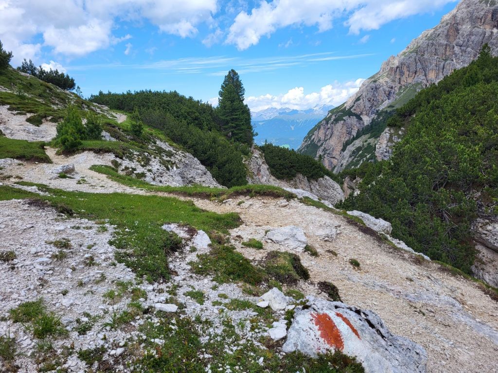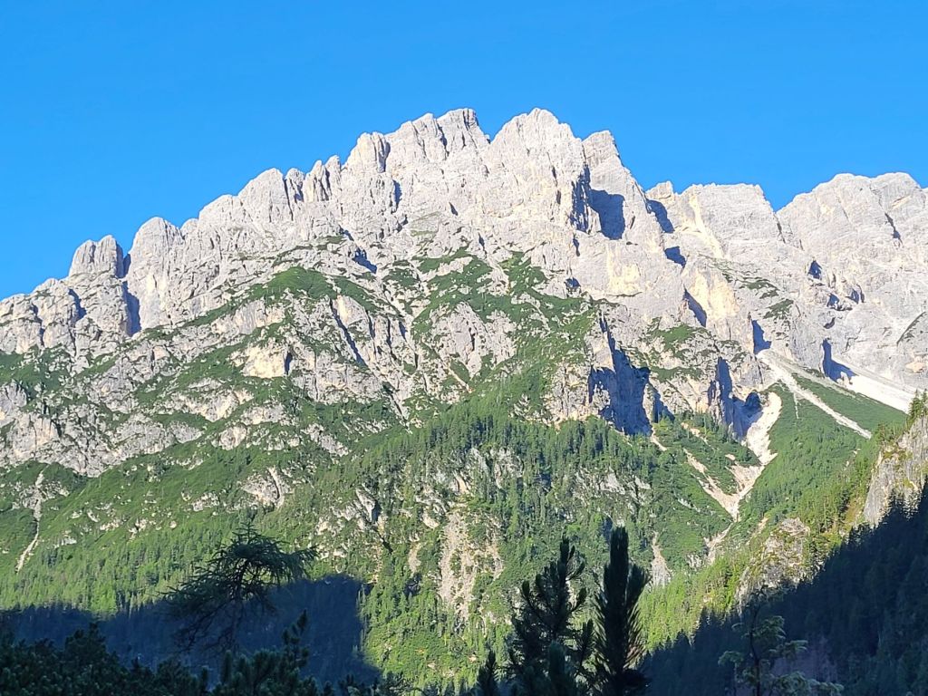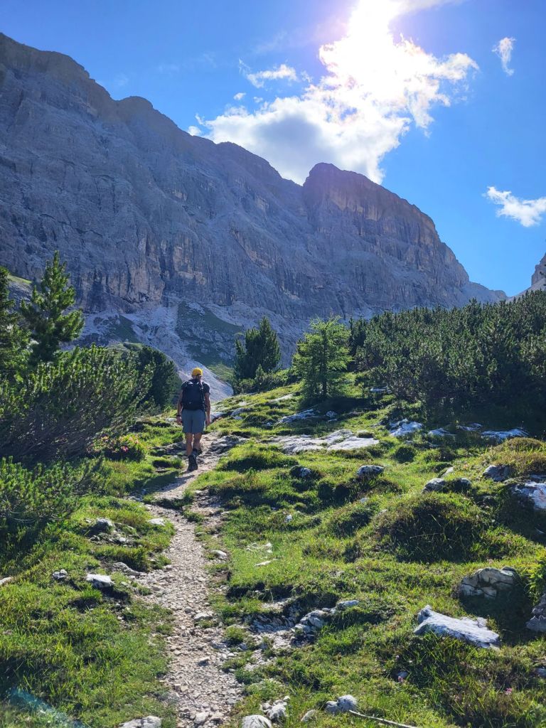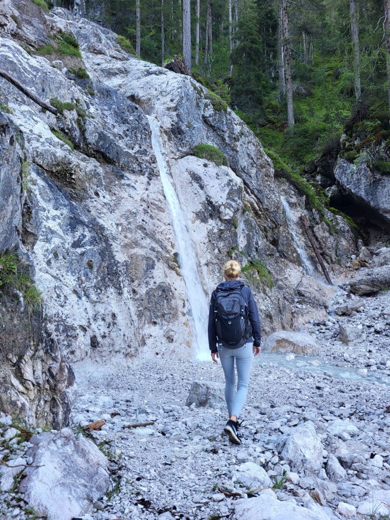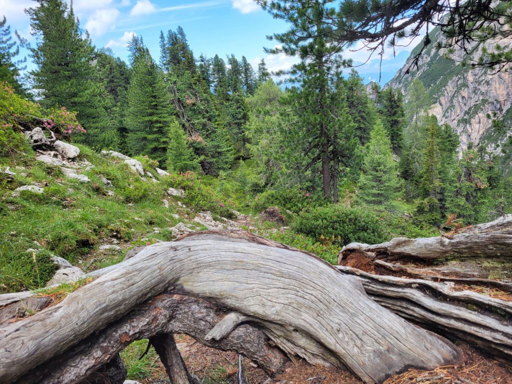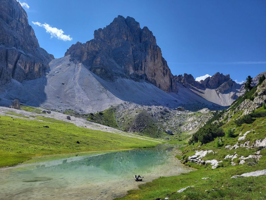 Aufgrund der schlechten Wettervorhersagen für den Freitag, war heute leider schon unser letzter Wandertag in den Dolomiten. Wir wählten eine nahegelegene Route, die eher weniger begangen wird und zu einem See führt. Und das war eine super Entscheidung! Um 8 Uhr waren wir bereits startklar und machten uns auf den Weg Richtung Schafalm. Da es von Beginn weg steil durch den Wald hoch ging, gewannen wir schnell an Höhe. Schon eine halbe Stunde später konnten bis zum Toblacher See blicken. Dann folgten zwei Flussüberquerungen und ein paar steile Kurven später erreichten wir die herzige Schafalm. Dort machten wir eine kurze Rast und liefen dann die letzten Höhenmeter durch den Wald, bevor wir der Felswand entlang links abbogen. Dann kam ein Teilstück, welches wohl typisch ist für Wanderungen in den sehr steilen Dolomiten; ein schmaler Kieselweg der Felswand entlang, extrem abschüssig, mit Drahtseilen gesichert. Schon einmal in die Tiefe blicken war wieder fast zu viel für mich. Dieses Mal konnte ich meine Angst aber einigermassen kontrollieren und dieses Wegstück hinter mich bringen. Danach ging es nochmal durch den Wald, bis es steiniger wurde und sich schlussendlich die Ebene mit dem Mitteralplsee vor uns auftat, wunderschön in den Felsen gelegen. Wir konnten unser Glück, völlig allein am Mittelalplsee zu sein, kaum fassen. Diese unberührte, wunderschöne Natur und die absolute Stille – ein Traum! Wenige Minuten konnten wir noch in der Sonne geniessen, bevor dann leider Wolken aufkamen und es kühler wurde. Nach einem feinen Picknick – selbst das Essen schmeckt besser in den Bergen 😉 – machten wir uns auf den Rückweg, welcher aufgrund des steilen Geländes nochmal Kraft und Konzentration verlangte.