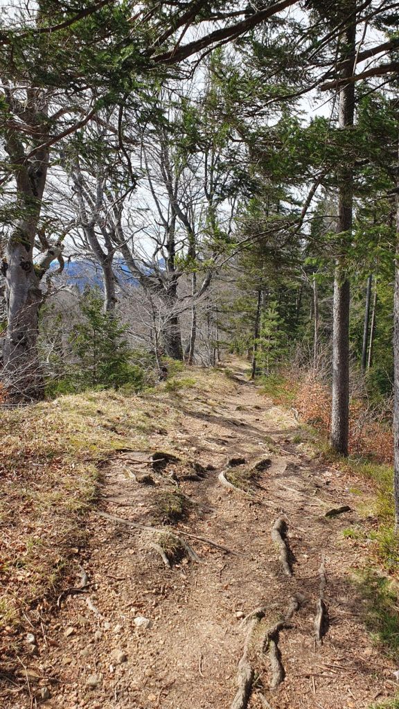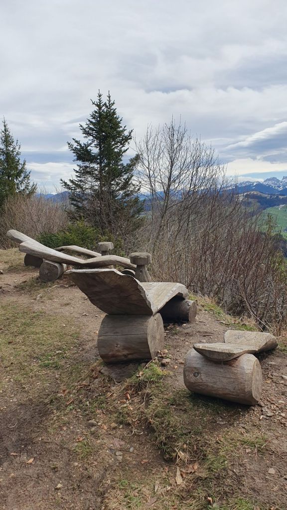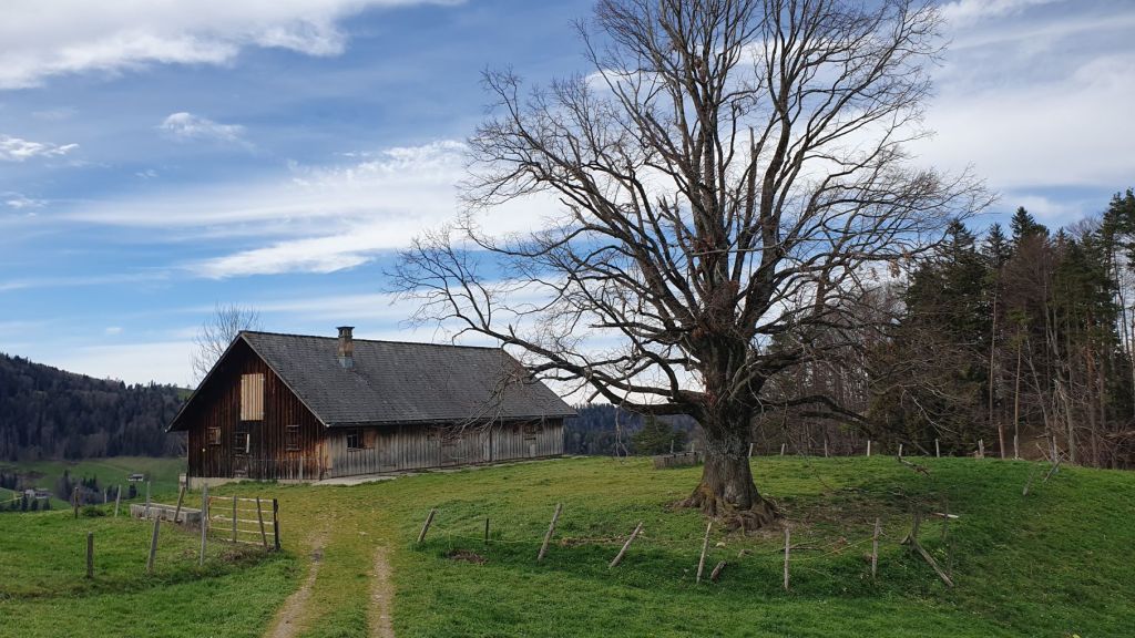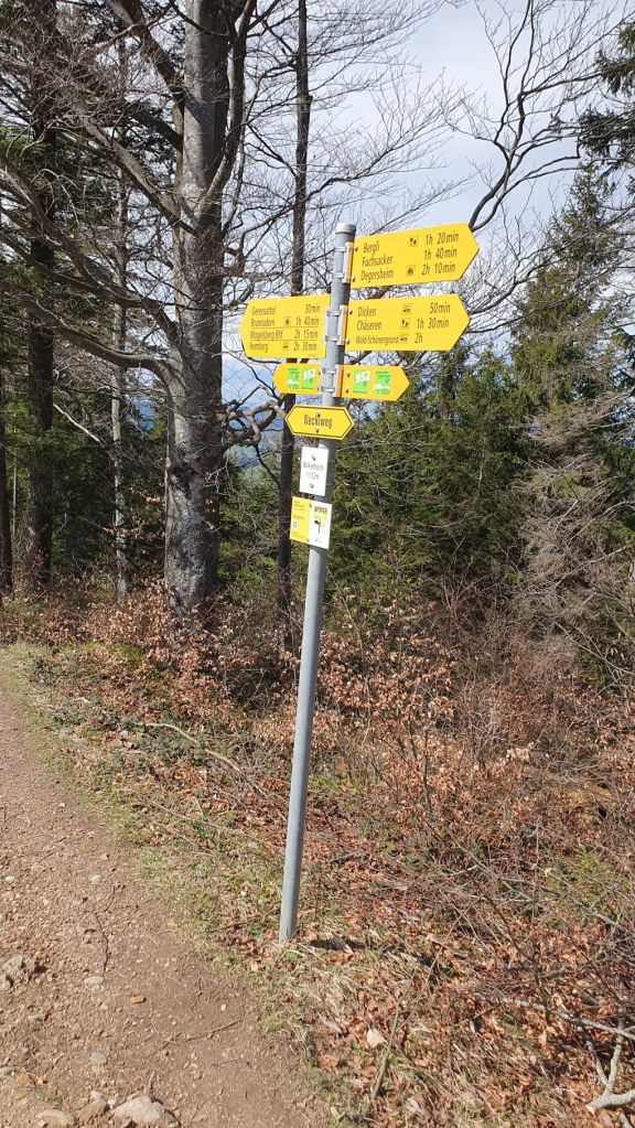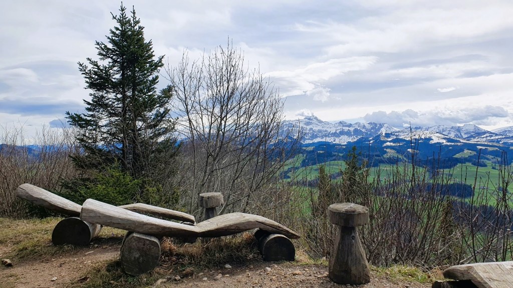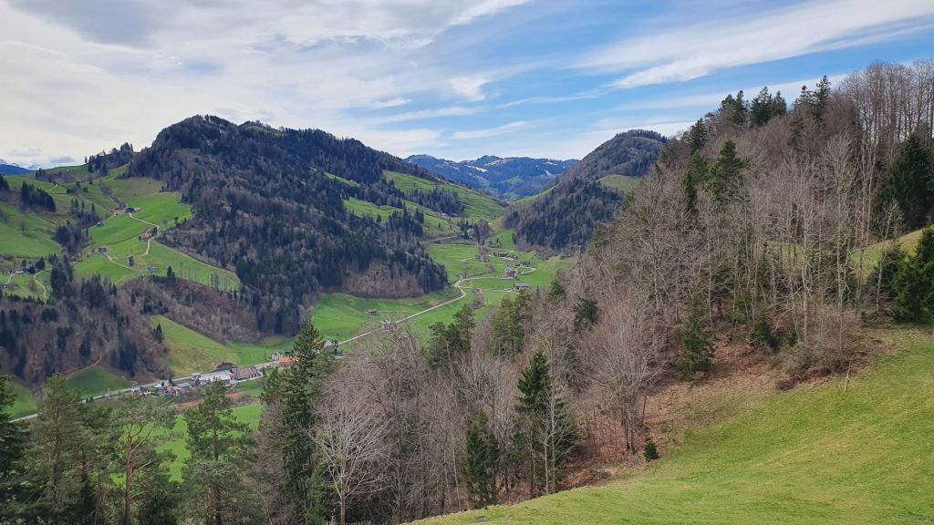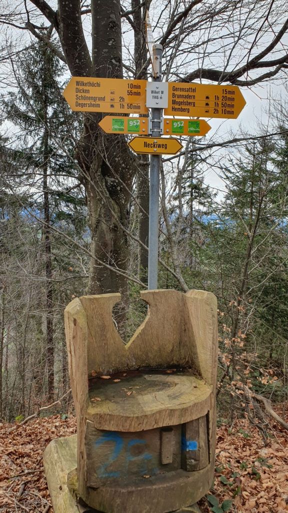 Geplant war alles etwas anders. Eigentlich wollten wir jetzt im Engadiner Madulain am Skitouren sein, doch das Wetter machte uns einmal mehr einen Strich durch die Rechnung. So verzichteten wir auf die Ferientage in Madulain und machten uns heute auf ins nahegelegene Neckertal. Vom Bahnhof Brunnadern liefen wir ein paar Schritte durchs Dorf, bevor es ziemlich steil links hoch über den Necker und den Oberberg ging. Nach einer halben Stunde kamen wir schon gehörig ins Schwitzen. Nach einem kurzen Wegstück einem Feldweg entlang erreichten wir den Gerensattel. Das letzte Stück verlief durch den Wald dem Grat entlang hoch auf die Wilkethöchi, wo wir mit dem Alpstein und den Glarner Alpen ein herrliches Panorama geniessen konnten. Und obwohl der Wind alles gab, waren wir am obersten Punkt relativ geschützt. Nur die Lautstärke des Windes….damit haben wir beide unsere liebe Mühe 😉