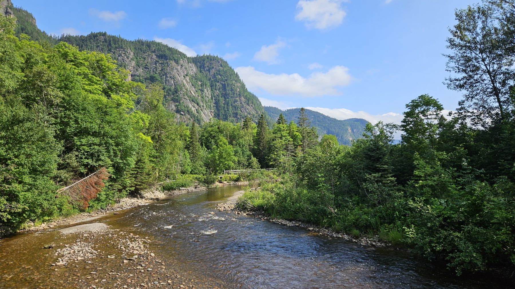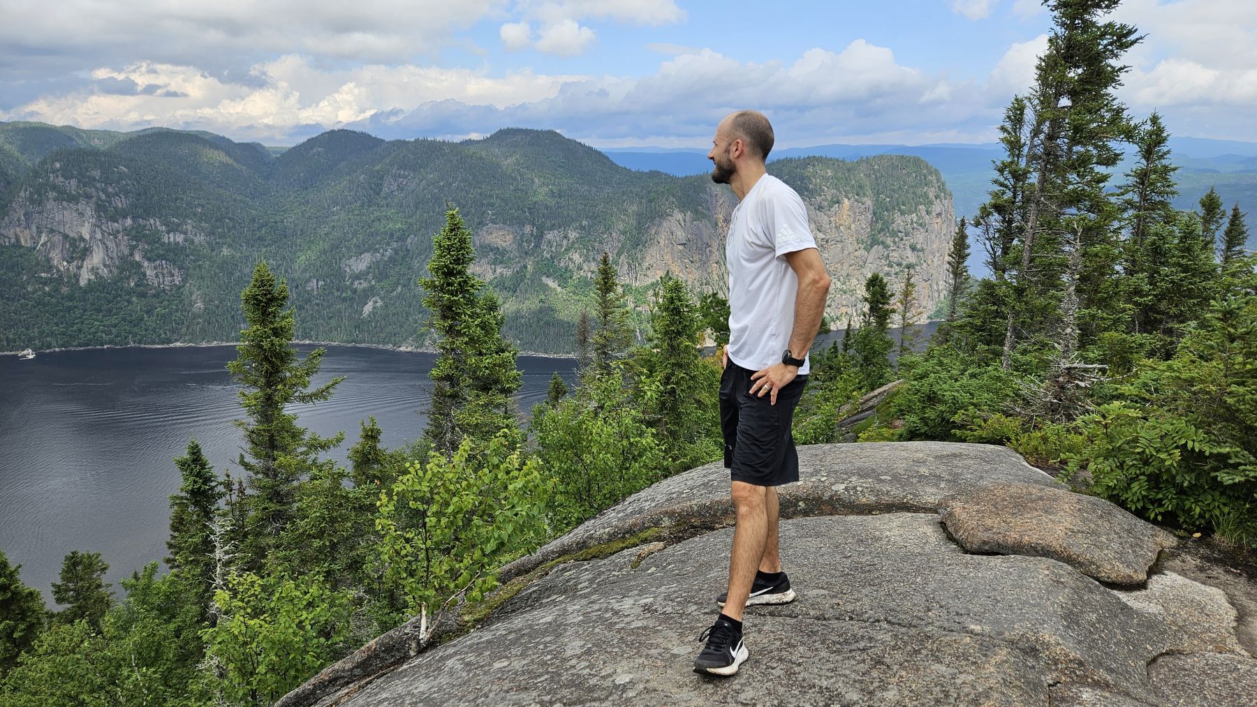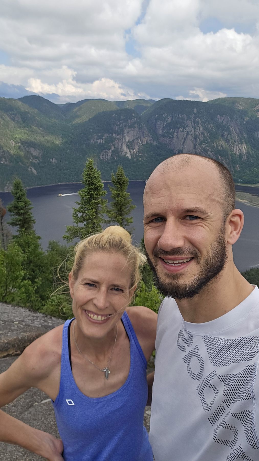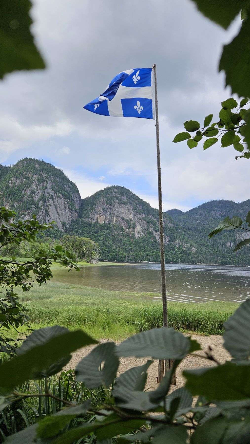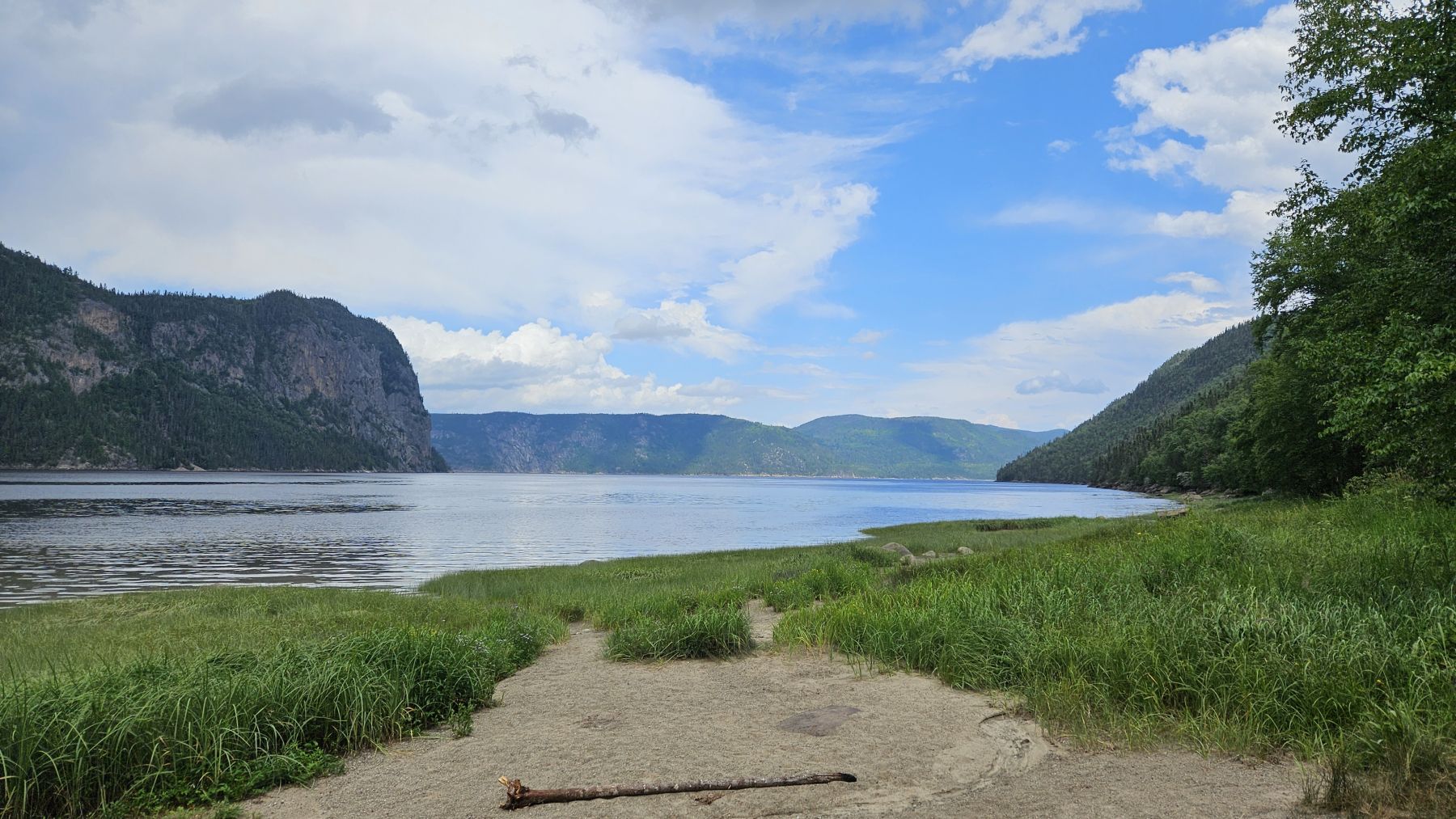 Eigentlich hatte der Wetterbericht auch für heute nasses, gewittriges Wetter vorausgesagt. Aber heute Morgen sah es schon wieder viel besser aus. Die Chance, verregnet zu werden, bestand zwar, aber wir hofften auf etwas Glück. Nach einer halbstündigen Fahrt in den benachbarten Fjord Rivière-Eternité begannen wir unsere Wanderung beim Parkplatz Nummer 3. Über verschiedene Holzbrücken den Fluss überquerend liefen wir zur Baie Eternité, wo es einen Wald-Campingplatz hat. Von dort ging es dann über Steinwege den Fjord entlang durch den üppigen Wald hoch bis zum Point de vue de Géant. Was für eine Aussicht wieder! Und während wir rundherum den Donner grollen hörten, sassen wir bei unserem Picknick mit fantastischer Aussicht im Trockenen. Auf dem Rückweg regnete es noch leicht, aber wir waren gut geschützt vom Wald. So richtig los ging das Gewitter erst fünf Minuten, nachdem wir wieder in unserer gemütlichen Hütte angekommen waren. Heute war das Wetterglück definitiv auf unserer Seite!