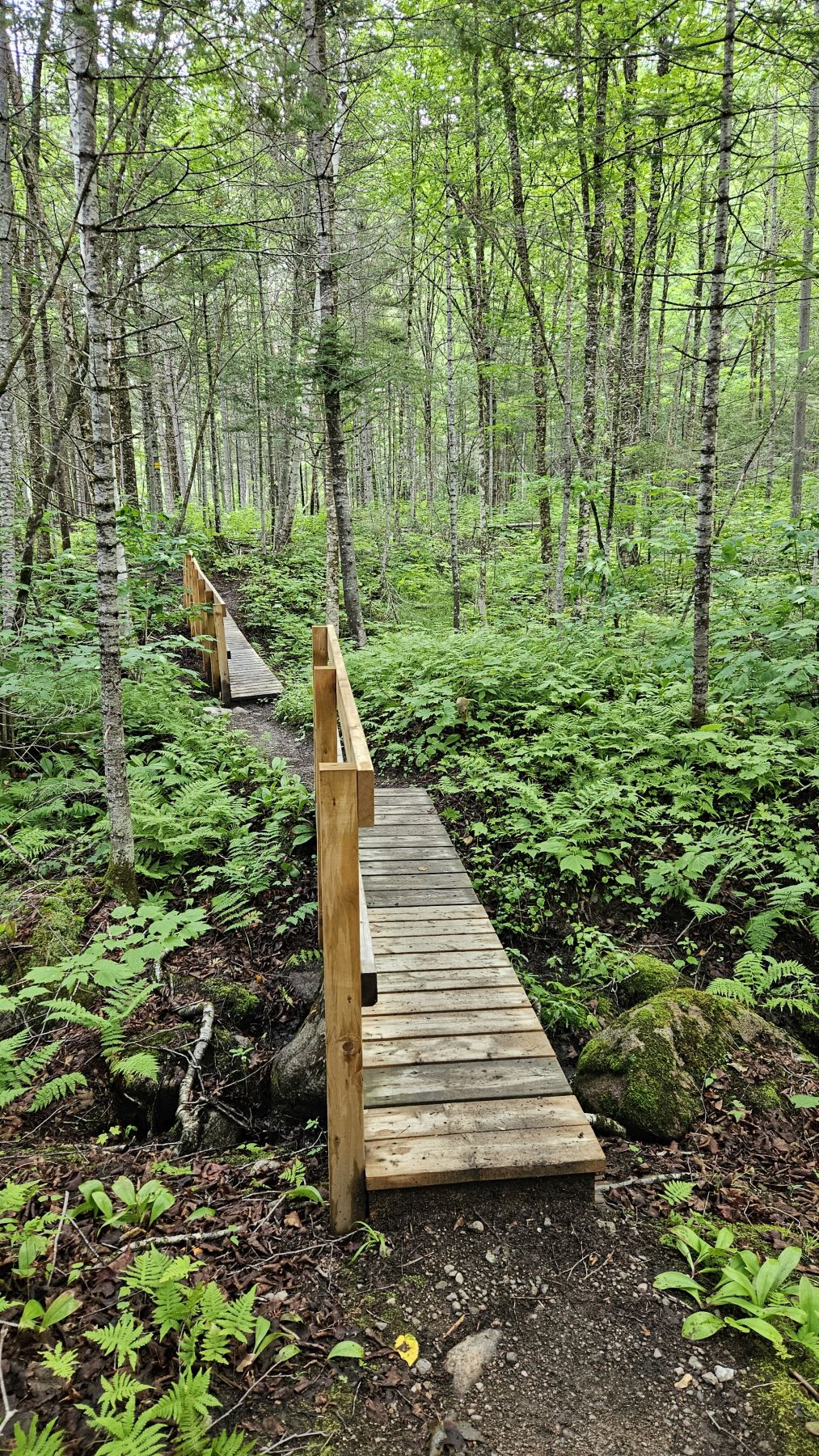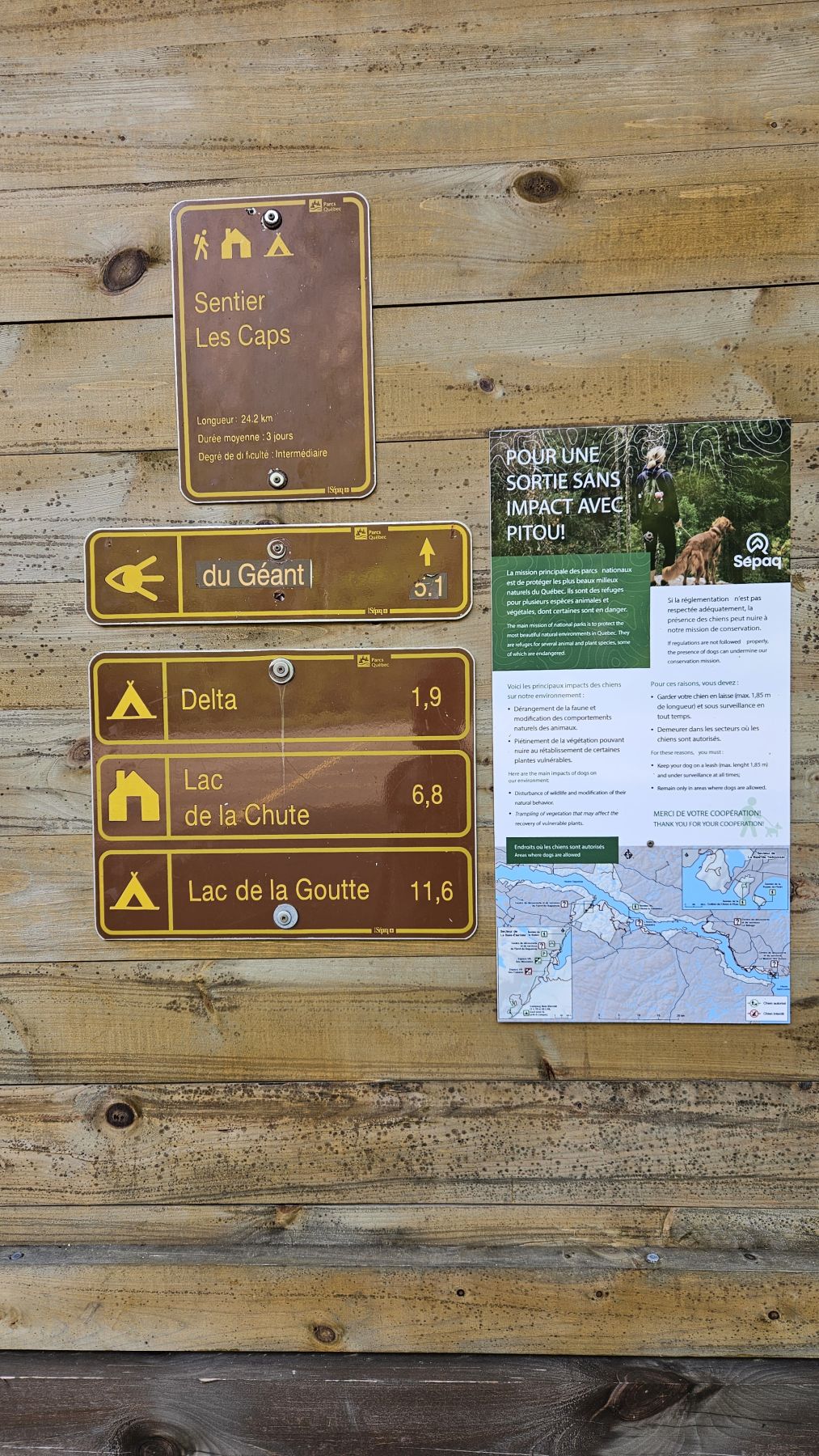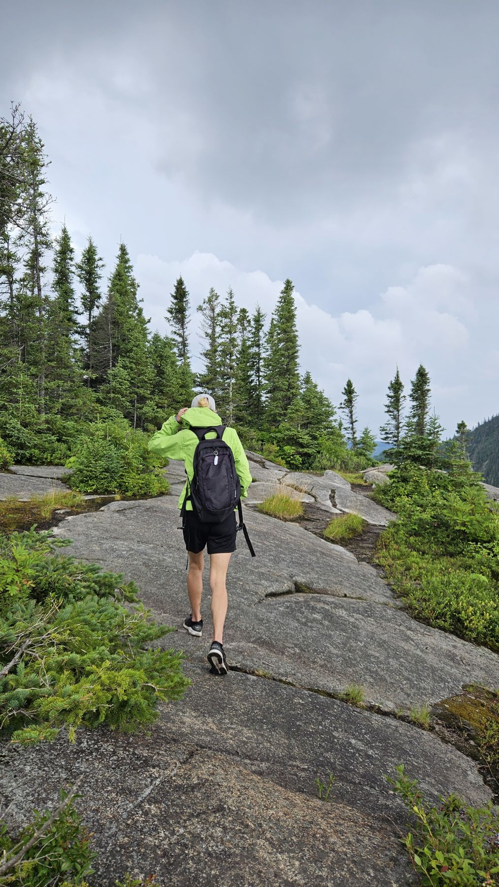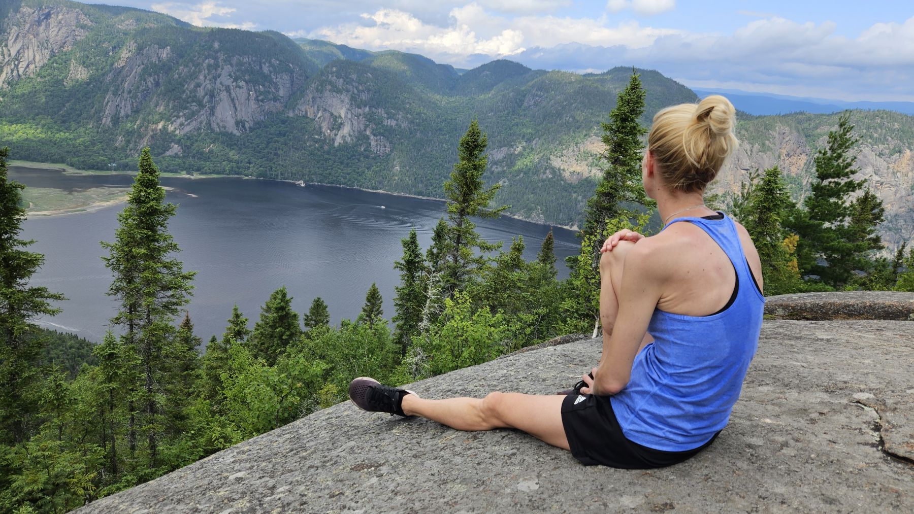 Eigentlich hatte der Wetterbericht auch für heute nasses, gewittriges Wetter vorausgesagt. Aber heute Morgen sah es schon wieder viel besser aus. Die Chance, verregnet zu werden, bestand zwar, aber wir hofften auf etwas Glück. Nach einer halbstündigen Fahrt in den benachbarten Fjord Rivière-Eternité begannen wir unsere Wanderung beim Parkplatz Nummer 3. Über verschiedene Holzbrücken den Fluss überquerend liefen wir zur Baie Eternité, wo es einen Wald-Campingplatz hat. Von dort ging es dann über Steinwege den Fjord entlang durch den üppigen Wald hoch bis zum Point de vue de Géant. Was für eine Aussicht wieder! Und während wir rundherum den Donner grollen hörten, sassen wir bei unserem Picknick mit fantastischer Aussicht im Trockenen. Auf dem Rückweg regnete es noch leicht, aber wir waren gut geschützt vom Wald. So richtig los ging das Gewitter erst fünf Minuten, nachdem wir wieder in unserer gemütlichen Hütte angekommen waren. Heute war das Wetterglück definitiv auf unserer Seite!