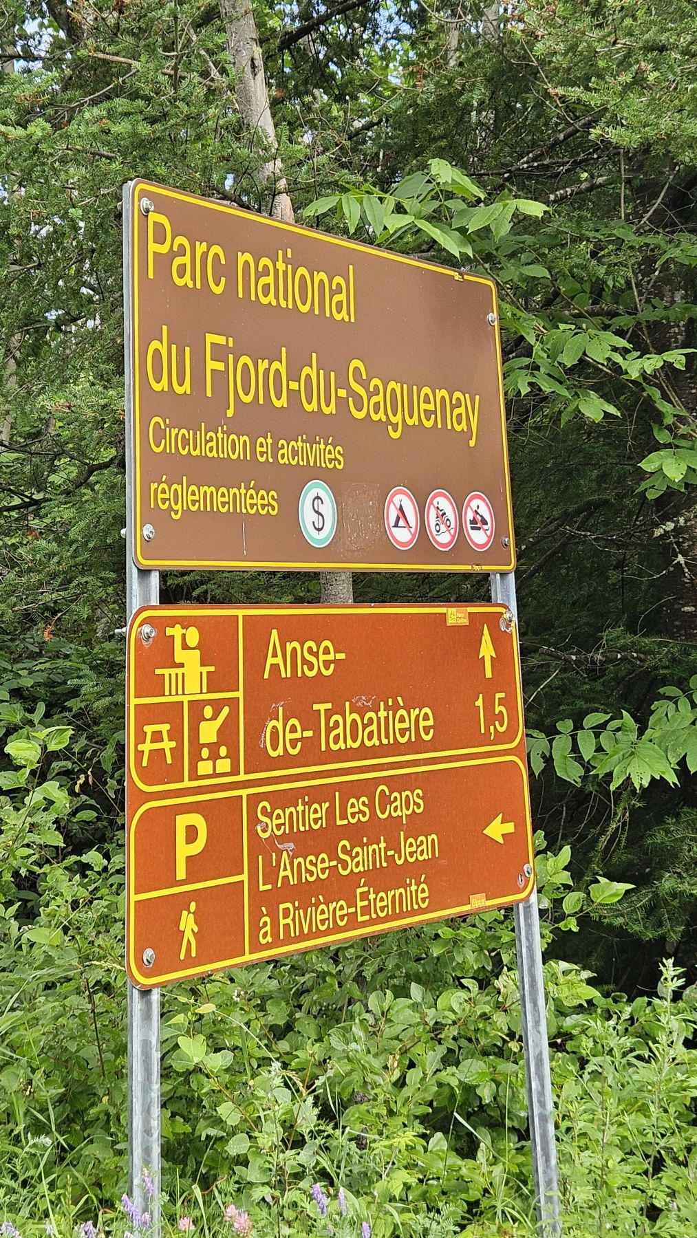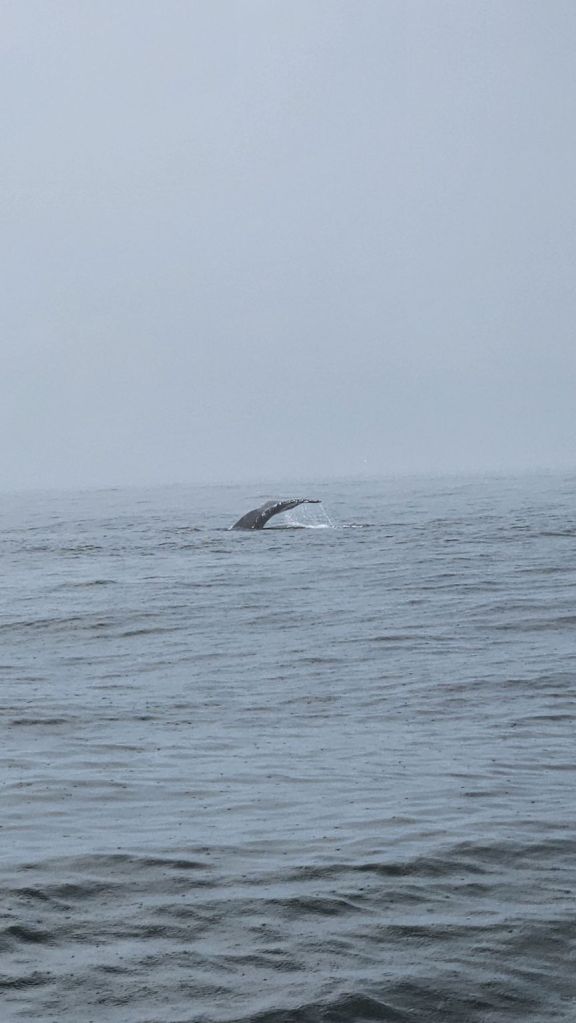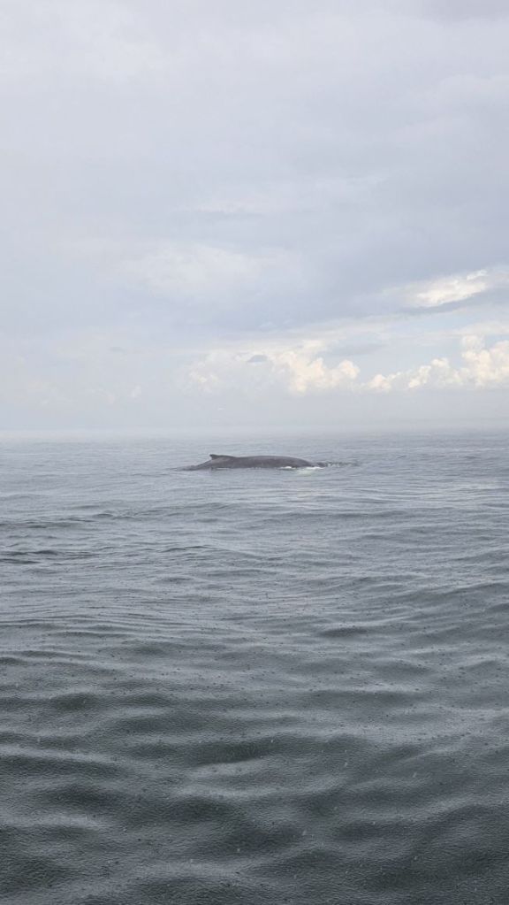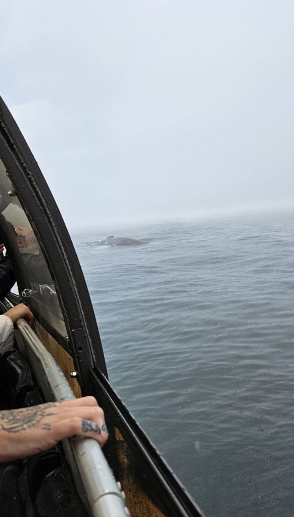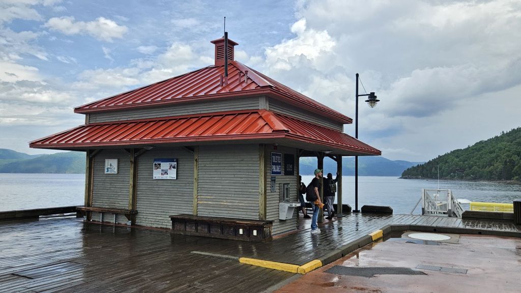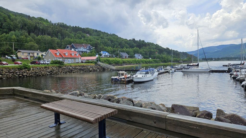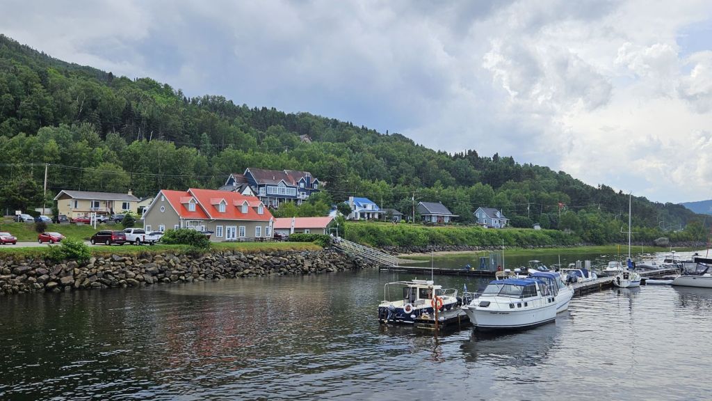 Heute Morgen fuhren wir als Erstes mit dem Auto zum fünf Minuten entfernt gelegenen Aussichtspunkt Tabatière, um erneut die herrliche Aussicht auf den Fluss Saguenay und die warmen Sonnenstrahlen zu geniessen. Dann kehrten wir zurück, um uns vor der vierstündigen Bootsfahrt am Nachmittag noch etwas zu bewegen. Wir schwitzten eine halbe Stunde beim Training auf unserer tollen Holzveranda und legten uns noch eine Weile in den Kuschelsessel. Eine Stunde später war dann das angekündigte Gewitter da. Mit Regenjacke und Zusatzkleidern bepackt machten wir uns auf Richtung L‘ Anse-Saint-Jean, wo unsere Walbeobachtungstour startete. Mit einem Zodiac fuhren wir eine Stunde dem Fluss entlang bis zur Mündung in den Sankt-Lorenz-Strom, wo das Boot langsam zum Stillstand kam. Und dann galt es abzuwarten und die Augen offen zu halten. Und dann waren da plötzlich tatsächlich Wale, was für ein Glück! Diese riesigen Tiere in freier Natur zu sehen war sehr beeindruckend.