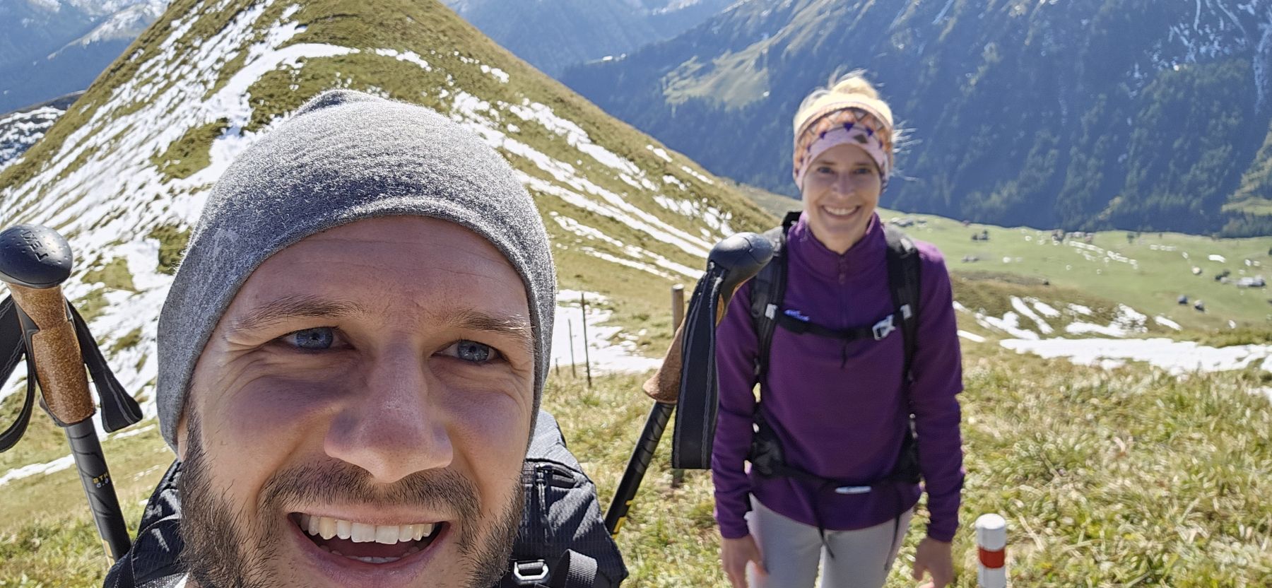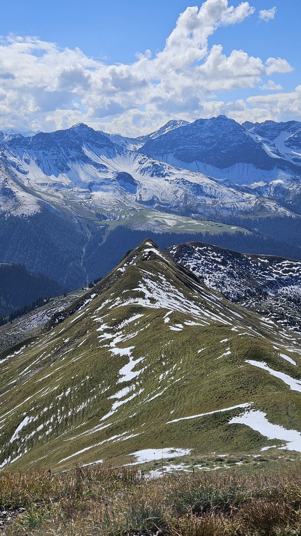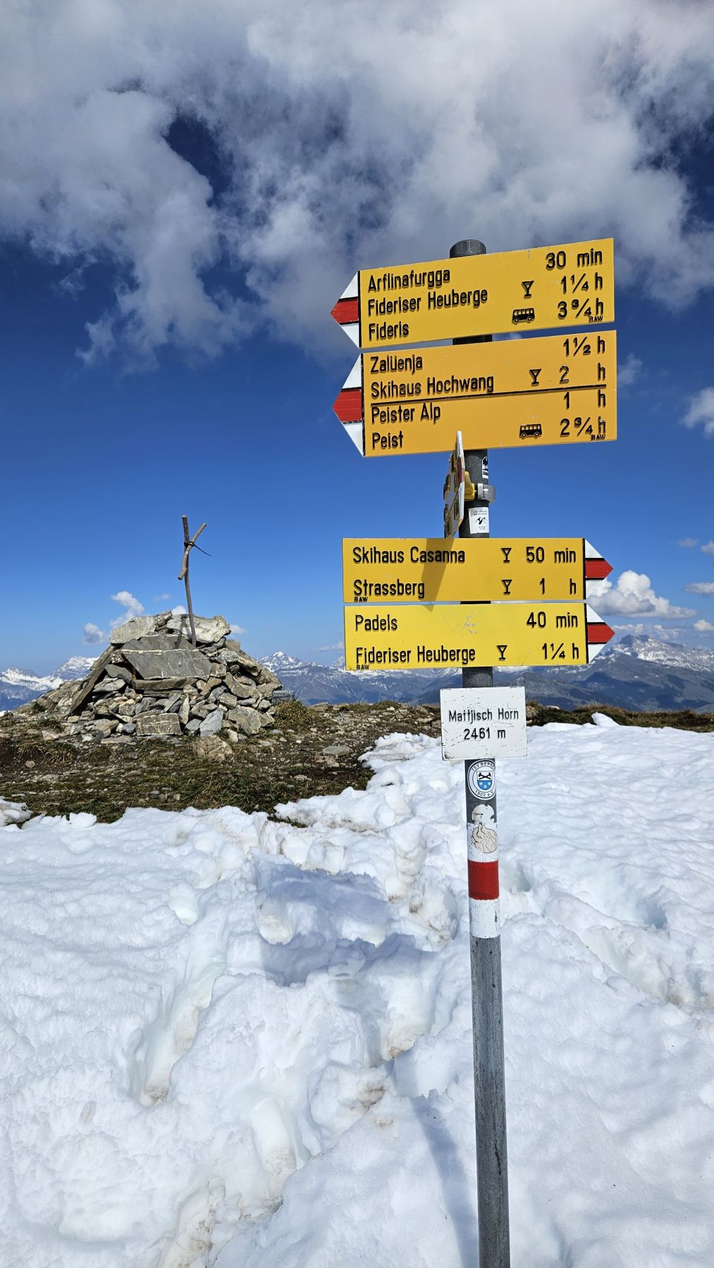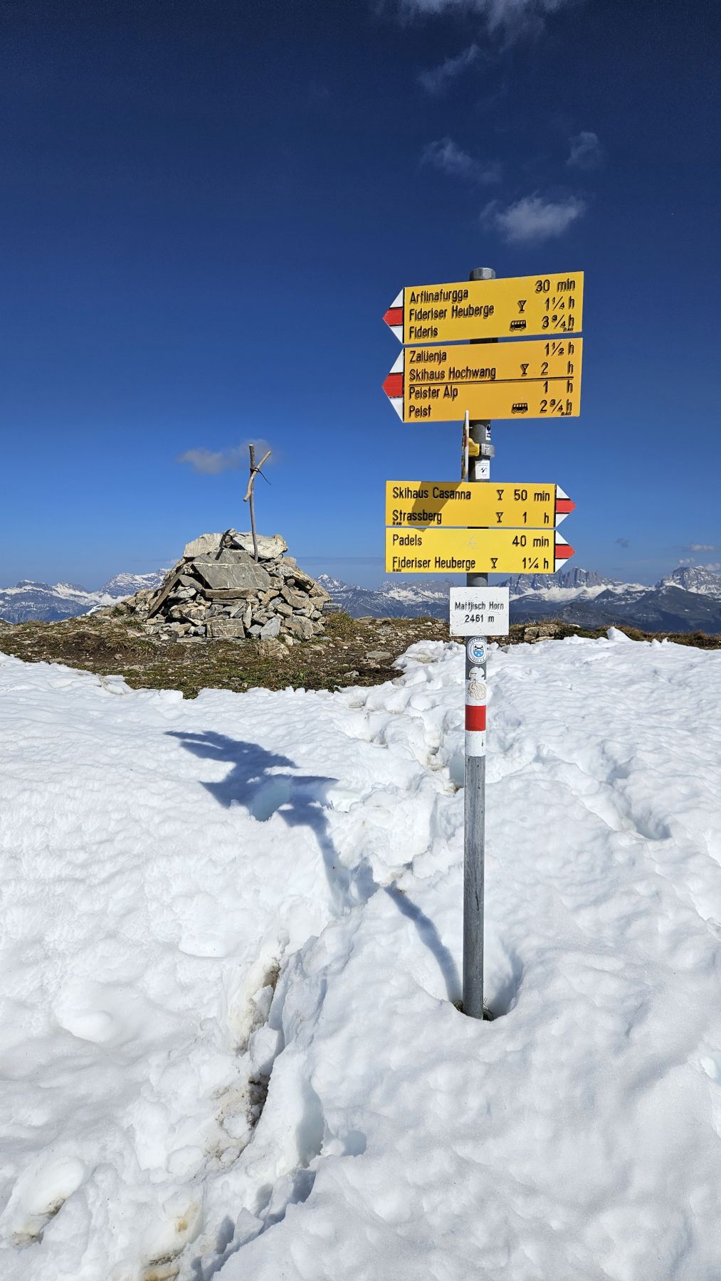 Unser zweites Wochenende in unserer neuen Ferienwohnung und schon sehen wir Schnee! Die höchsten Gipfel, mitunter auch das Weisshorn, sind schon richtig schön bedeckt. Auf das auf 2460 Metern gelegene Mattjisch Horn sollten wir es aber mit den Wanderschuhen gerade noch schaffen. So machten wir uns am Samstagmorgen bei traumhaftem Sonnenschein von Maselfa auf den Weg Richtung Peister Alp, mehrheitlich eben einem Feldweg entlang mit wunderschöner Aussicht. Wenige hundert Meter nach der Peister Alp wechselten wir dann auf einen Wanderweg, der stetig steiler wurde, am Spitzenbüel vorbei und stets mit dem etwas langweilig erscheinenden Mattjisch Horn vor uns im Blickfeld. Wenn man jedoch oben steht, ist die Aussicht alles andere als langweilig! Man sieht von den Fideriser Heubergen über die halbverschneiten Gipfel des Mittagspitz und des Cunggel über das vollverschneite Weisshorn bis tief in das Aroser Tal. Grandios! Nachdem wir beim Aufstieg nach und nach eine Schicht Kleider nach der anderen ausgezogen hatten, war es auf dem Gipfel mit etwas Wind dann doch wieder recht kühl. Wir packten uns gut ein, genossen die frische Luft, die tolle Aussicht und die Ruhe. Und machten uns dann zügigen Schrittes auf den Rückweg. Soooo schön, dass wir das Mattjisch Horn unseren Hausberg nennen dürfen.