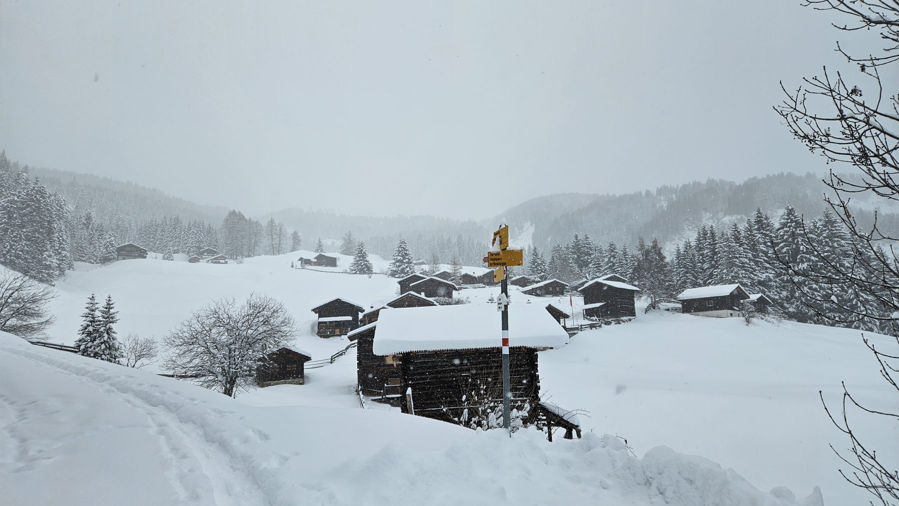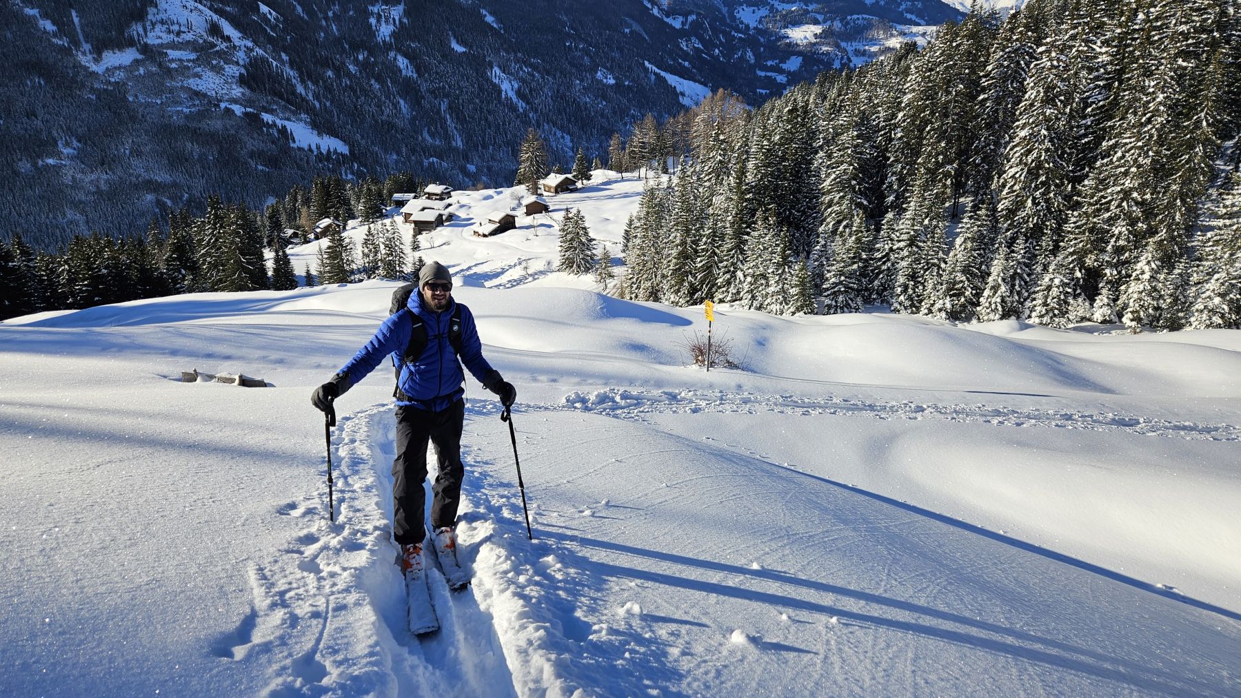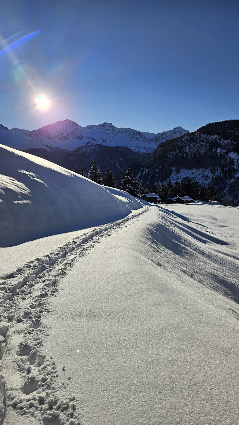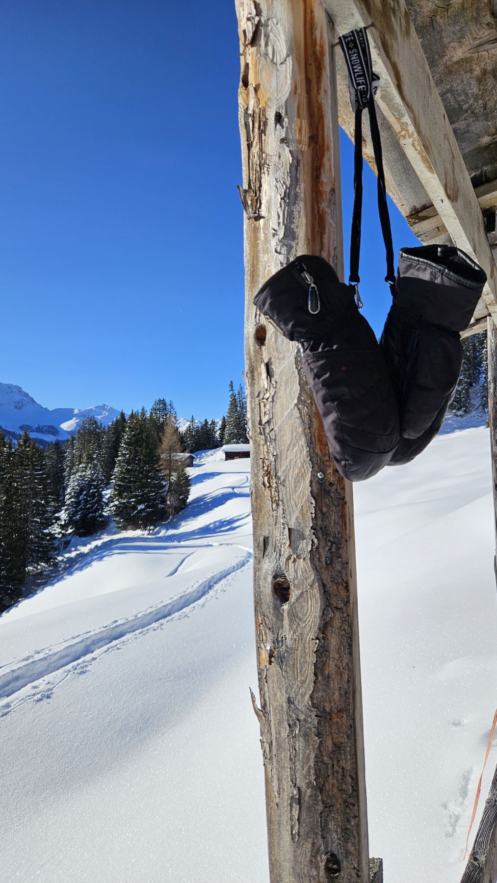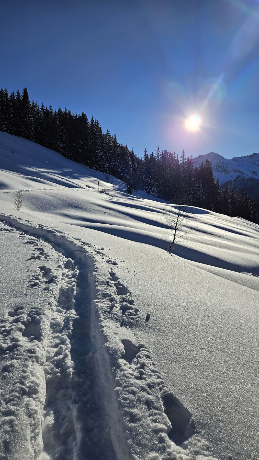 Wie so oft wurden wir anfangs Weihnachtsferien krank. So wurde die Anreise in den Chegelboden noch strenger als erwartet. Und da es leider bereits zu viel Schnee hatte, konnten wir mit dem Auto auch nicht hochfahren. Schlimmer noch, wir blieben sogar stecken. Nach einigen Transportgängen zu Fuss hatten wir immerhin unser Gepäck Mitte Nachmittag in der Wohnung. Und wie gerufen kam dann der Bauer Marco mit seinem Wintergefährt vorbei, zog unser Auto aus dem Schnee und fuhr unsere Tourenskis noch hoch. Was für ein Glück! Die nächsten paar Tage war es eher düster und schneite fast ununterbrochen. Wir genossen es jedoch, waren wir ja beide immer noch nicht bei vollen Kräften und hatten auch schon lange nicht mehr so viel Schnee erlebt. Ab Montag waren wir dann auch jeden Tag im Schnee; entweder auf den Schneeschuhen, auf den Tourenskis oder auf den Skis. Und während es in den ersten paar Tagen noch völlig unberührt und tief verschneit war, so schmolz der Schnee mit jedem weiteren Sonnentag nur so dahin, wir wir am Ende unserer zehntägigen Ferien wieder viele grüne Flecken sahen. Was für unvergesslich schöne Weihnachtsferien in unserer urgemütlichen Ferienwohnung im Chegelboden!
