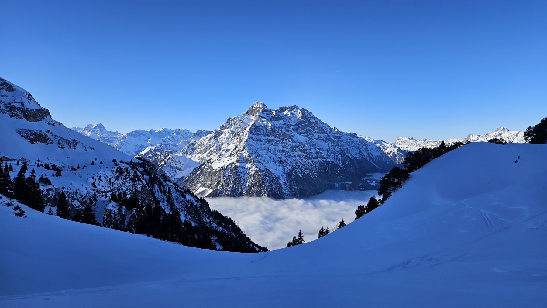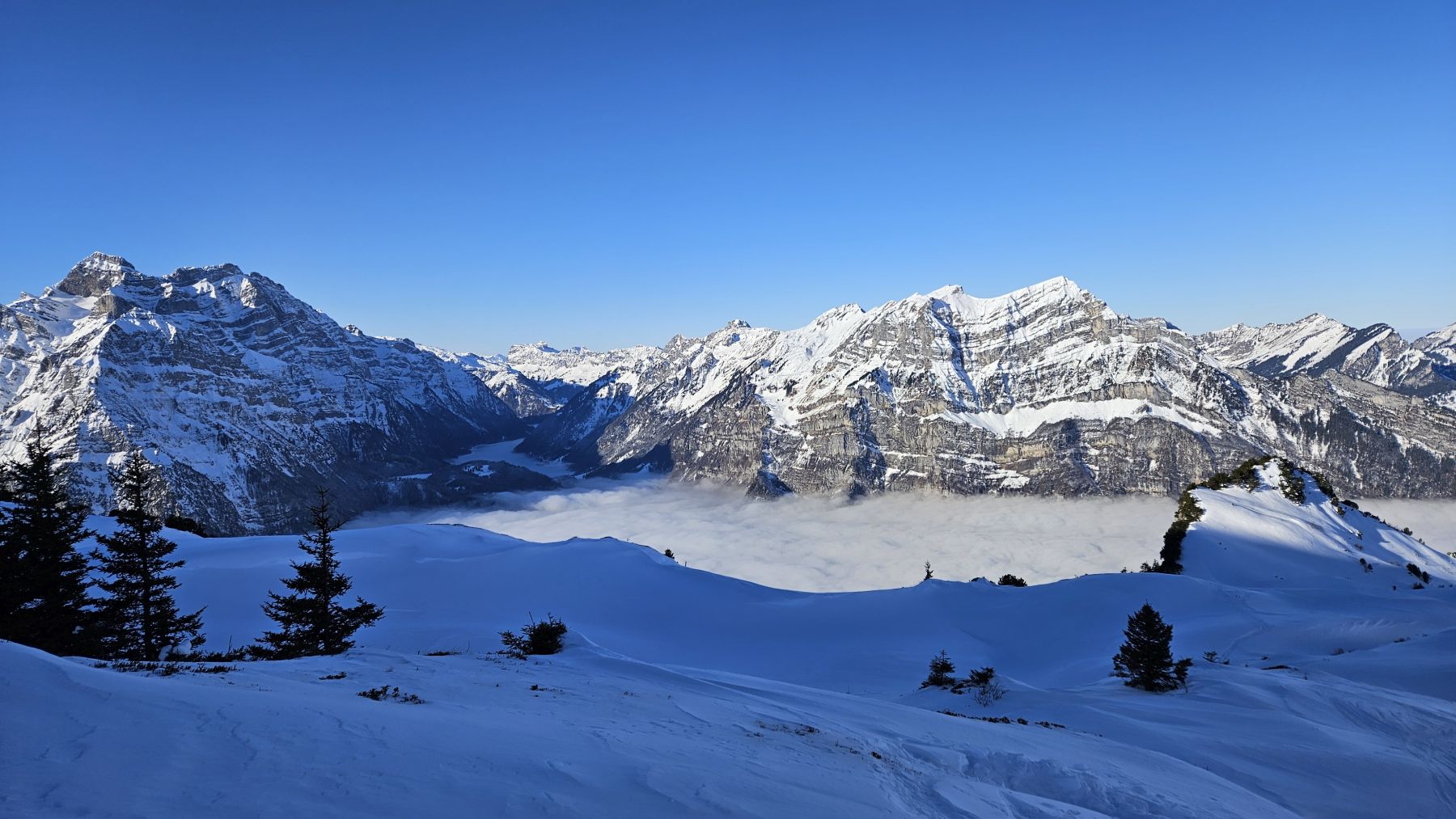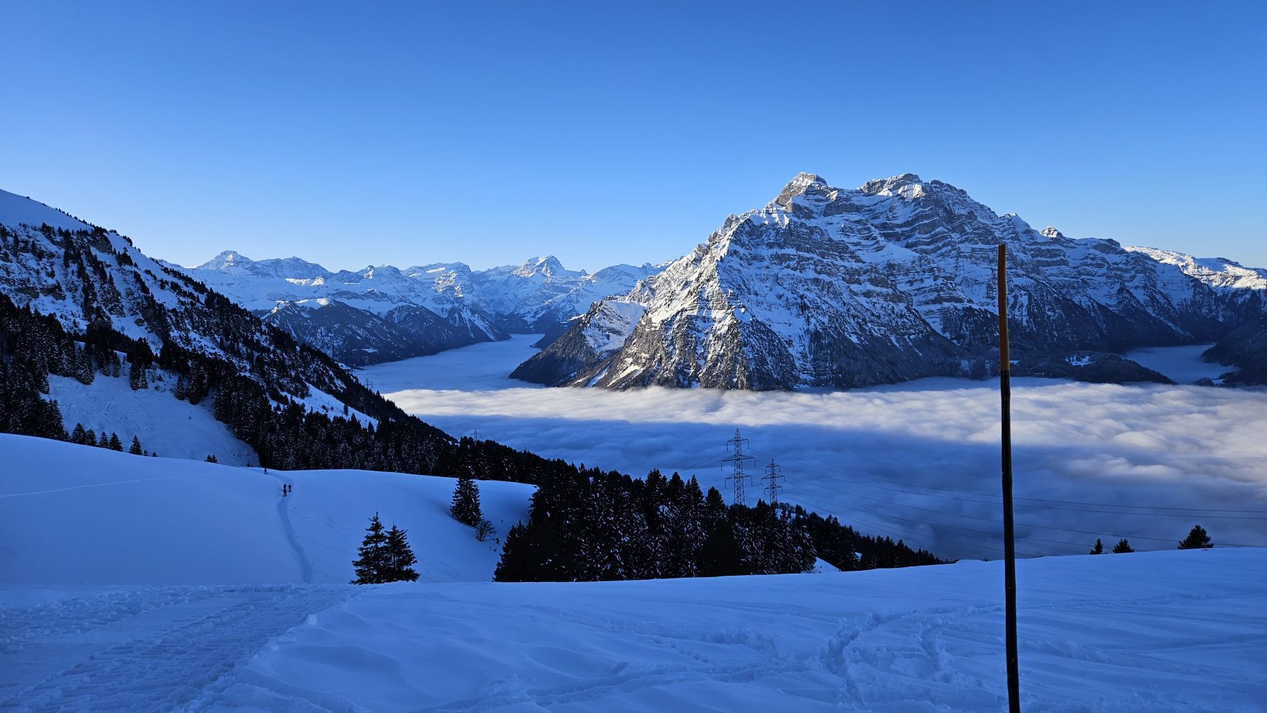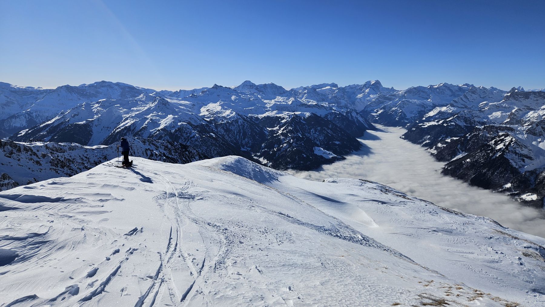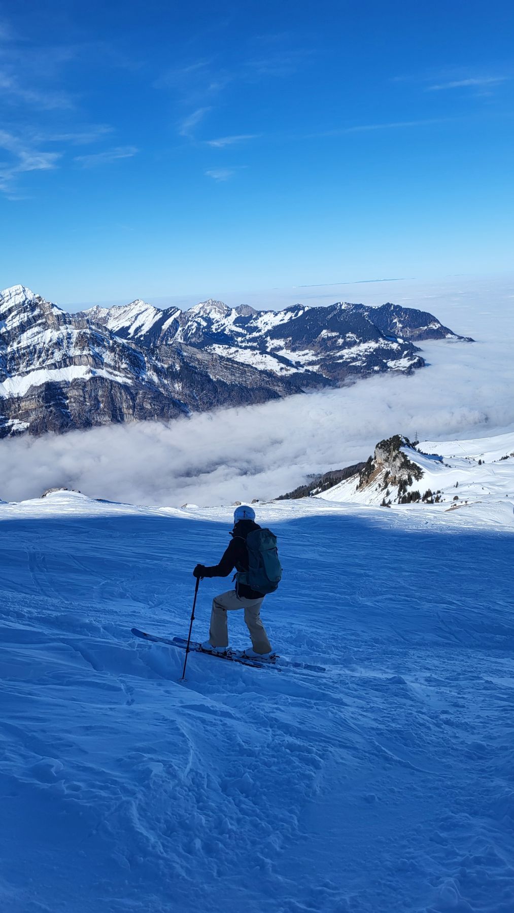 Die Wetterprognosen für den letzten Sportferientag waren grossartig und das wollten wir nochmal ausnützen. Bei nebligen Bedingungen machten wir uns früh auf den Weg zum Skilift Mollis, wo wir dann auch endlich Schnee vorfanden. Und auch einige andere SkitourengängerInnen. Die Tour auf den Schilt ist beliebt und bekannt, daher haben wir damit gerechnet, dass wir nicht die Einzigen sein würden. Nach einer kurzen Abfahrt legten wir die Felle auf und zogen im Schatten los Richtung Färiboden, angenehm ansteigend, stetig hoch. Auf dem Färiboden erwartete uns bereits die Sonne. Weiter ging es rund um den Sivellen und dann noch ein kurzes Stück hoch auf den Schilt, wo es sich bereits mehrere SkitourengängerInnen gemütlich gemacht hatten. Wir fuhren ein paar Meter weiter und fanden dort ein ruhiges Plätzchen mit einer gewaltigen Aussicht auf das Nebelmeer und die umliegenden Gipfel. Es erstaunt nicht, dass die Tour so beliebt ist; sie ist sehr angenehm zu gehen, landschaftlich wunderschön und auch konditionell gut machbar. Einfach ein Hit! Wir kommen bestimmt wieder, am liebsten an einem Wochentag mit weniger Leuten.