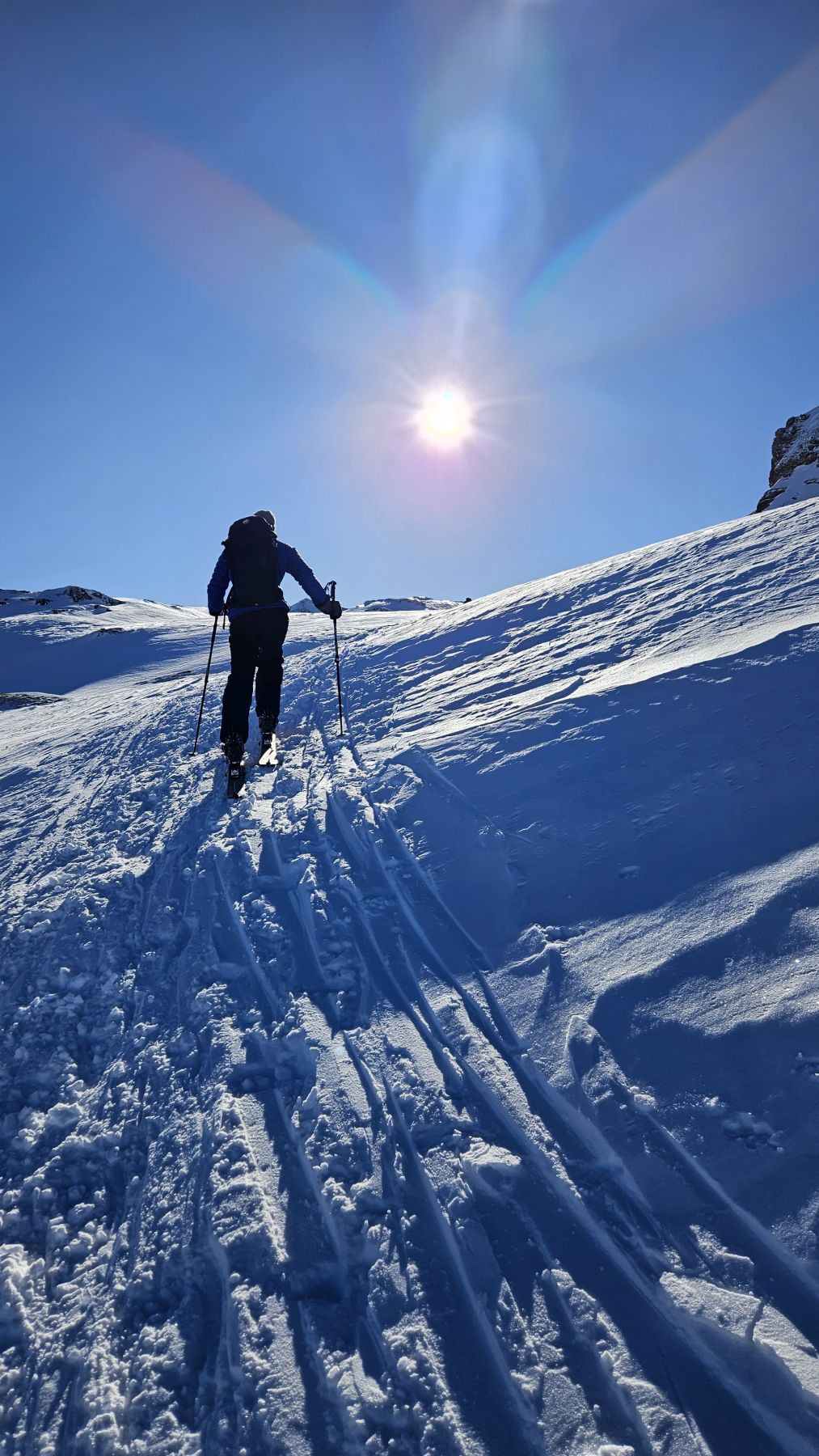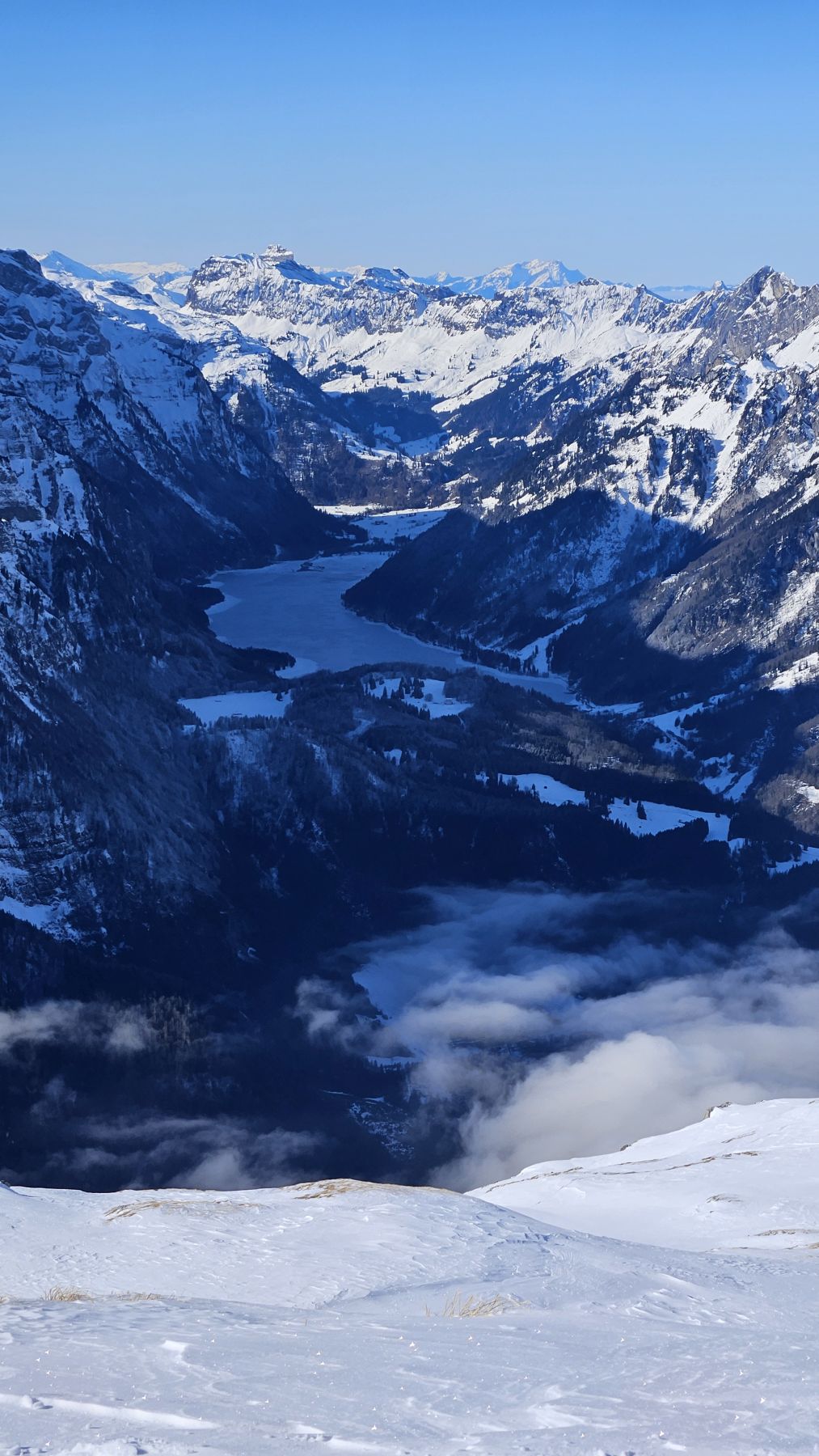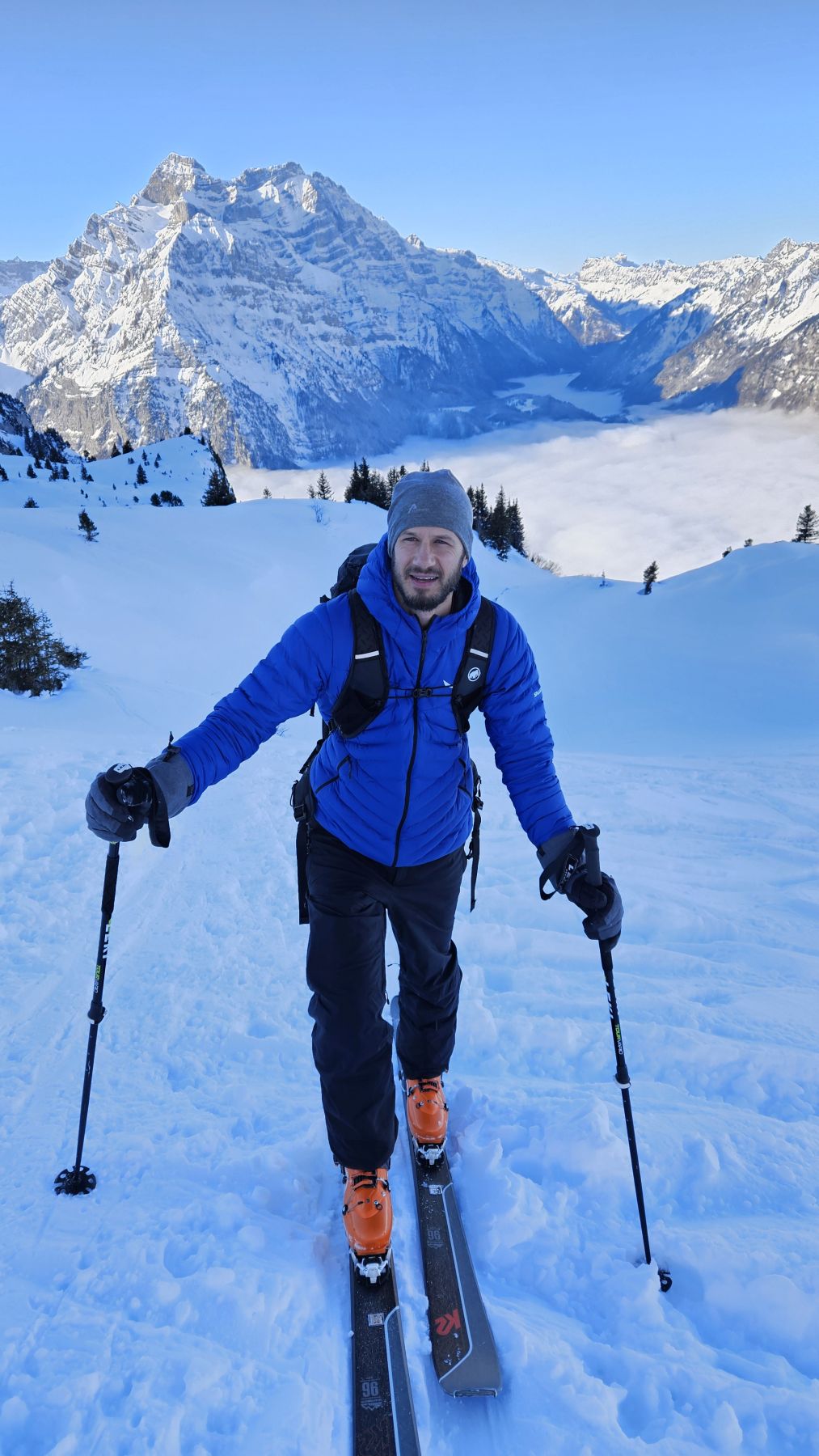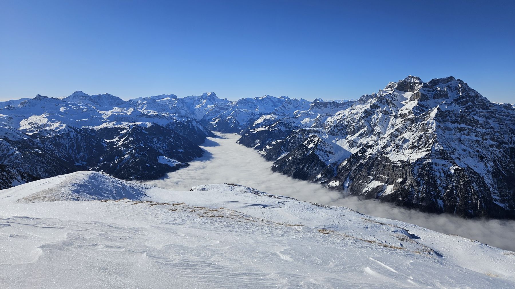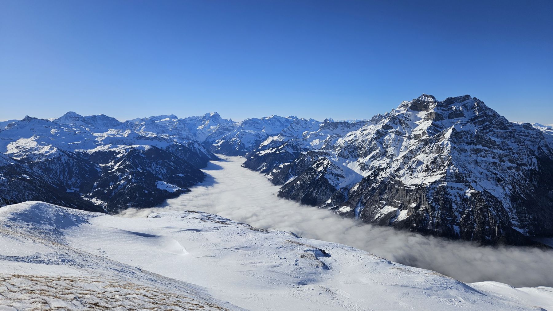 Die Wetterprognosen für den letzten Sportferientag waren grossartig und das wollten wir nochmal ausnützen. Bei nebligen Bedingungen machten wir uns früh auf den Weg zum Skilift Mollis, wo wir dann auch endlich Schnee vorfanden. Und auch einige andere SkitourengängerInnen. Die Tour auf den Schilt ist beliebt und bekannt, daher haben wir damit gerechnet, dass wir nicht die Einzigen sein würden. Nach einer kurzen Abfahrt legten wir die Felle auf und zogen im Schatten los Richtung Färiboden, angenehm ansteigend, stetig hoch. Auf dem Färiboden erwartete uns bereits die Sonne. Weiter ging es rund um den Sivellen und dann noch ein kurzes Stück hoch auf den Schilt, wo es sich bereits mehrere SkitourengängerInnen gemütlich gemacht hatten. Wir fuhren ein paar Meter weiter und fanden dort ein ruhiges Plätzchen mit einer gewaltigen Aussicht auf das Nebelmeer und die umliegenden Gipfel. Es erstaunt nicht, dass die Tour so beliebt ist; sie ist sehr angenehm zu gehen, landschaftlich wunderschön und auch konditionell gut machbar. Einfach ein Hit! Wir kommen bestimmt wieder, am liebsten an einem Wochentag mit weniger Leuten.