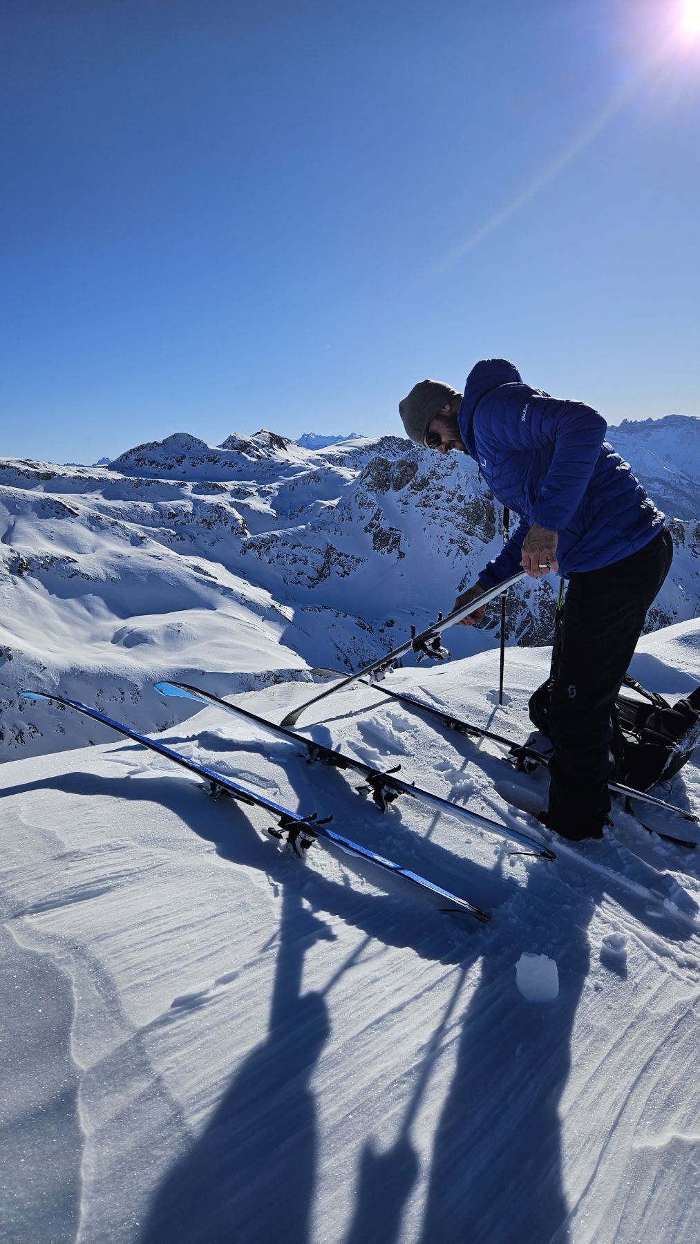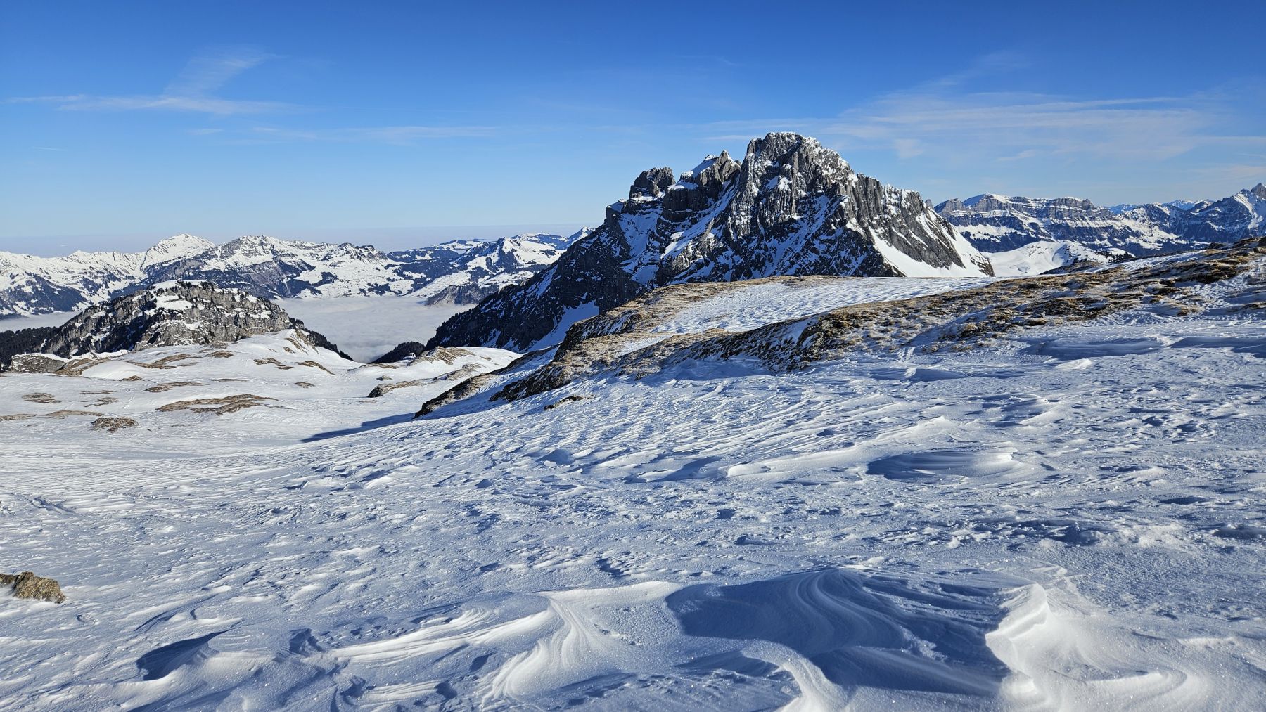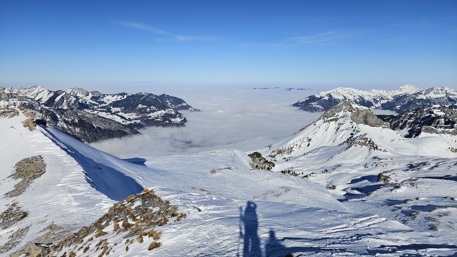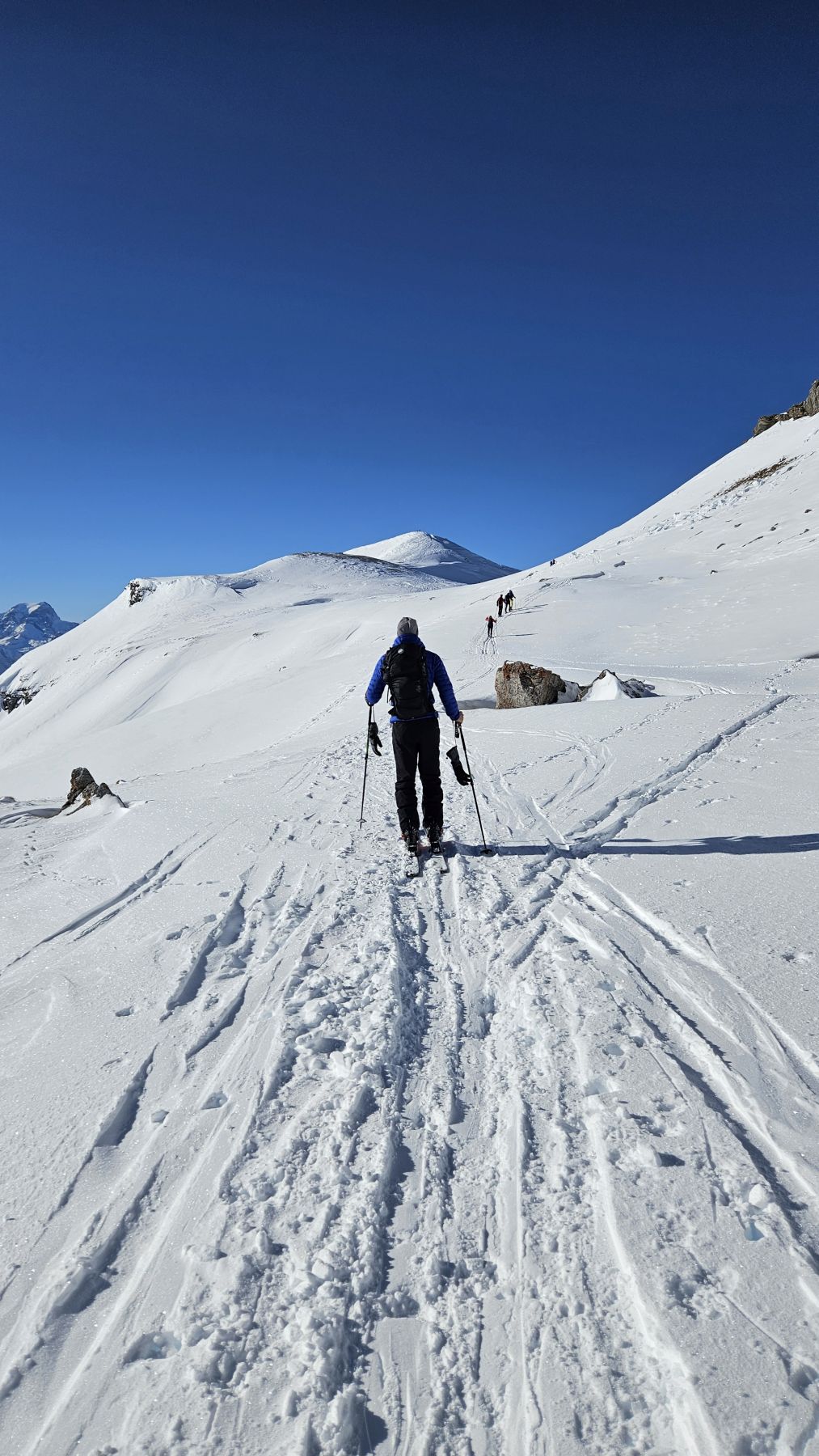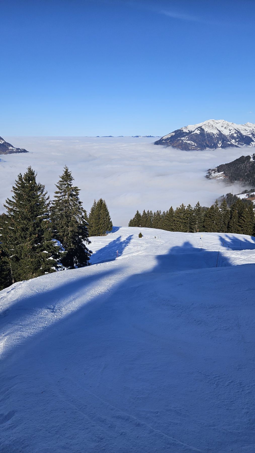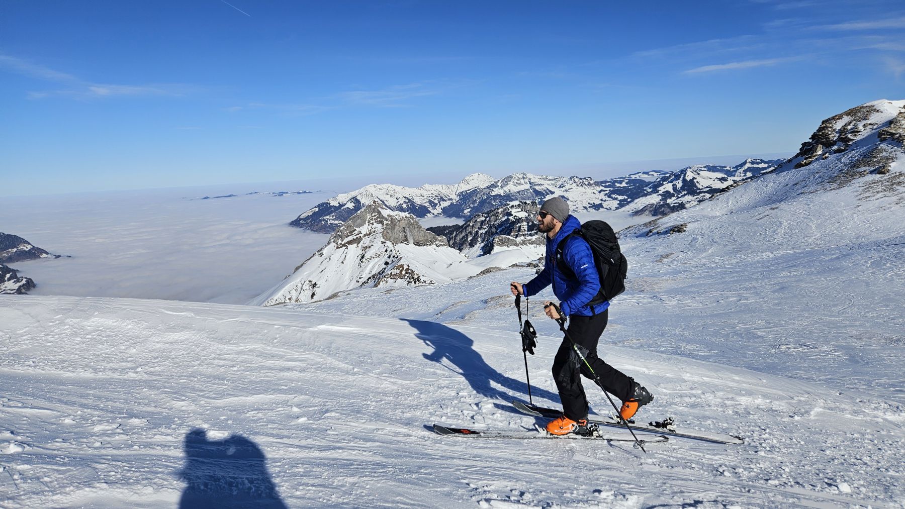 Die Wetterprognosen für den letzten Sportferientag waren grossartig und das wollten wir nochmal ausnützen. Bei nebligen Bedingungen machten wir uns früh auf den Weg zum Skilift Mollis, wo wir dann auch endlich Schnee vorfanden. Und auch einige andere SkitourengängerInnen. Die Tour auf den Schilt ist beliebt und bekannt, daher haben wir damit gerechnet, dass wir nicht die Einzigen sein würden. Nach einer kurzen Abfahrt legten wir die Felle auf und zogen im Schatten los Richtung Färiboden, angenehm ansteigend, stetig hoch. Auf dem Färiboden erwartete uns bereits die Sonne. Weiter ging es rund um den Sivellen und dann noch ein kurzes Stück hoch auf den Schilt, wo es sich bereits mehrere SkitourengängerInnen gemütlich gemacht hatten. Wir fuhren ein paar Meter weiter und fanden dort ein ruhiges Plätzchen mit einer gewaltigen Aussicht auf das Nebelmeer und die umliegenden Gipfel. Es erstaunt nicht, dass die Tour so beliebt ist; sie ist sehr angenehm zu gehen, landschaftlich wunderschön und auch konditionell gut machbar. Einfach ein Hit! Wir kommen bestimmt wieder, am liebsten an einem Wochentag mit weniger Leuten.