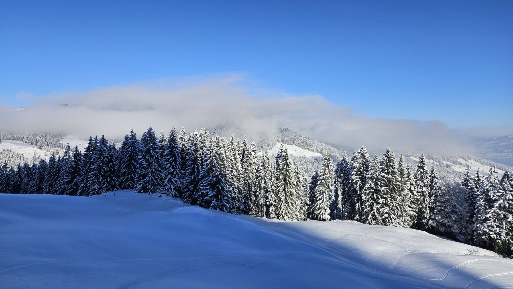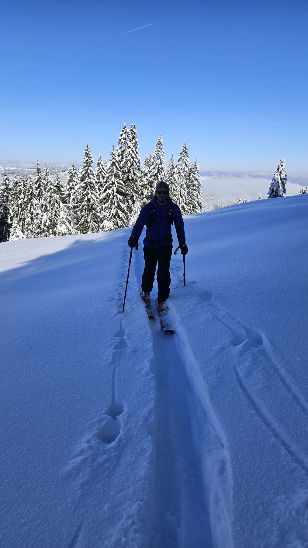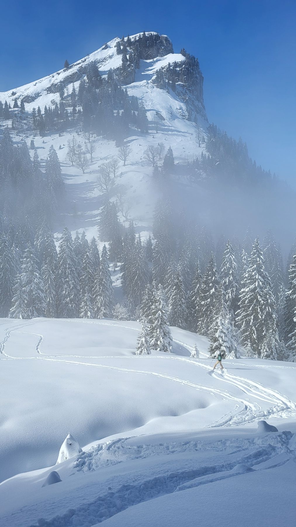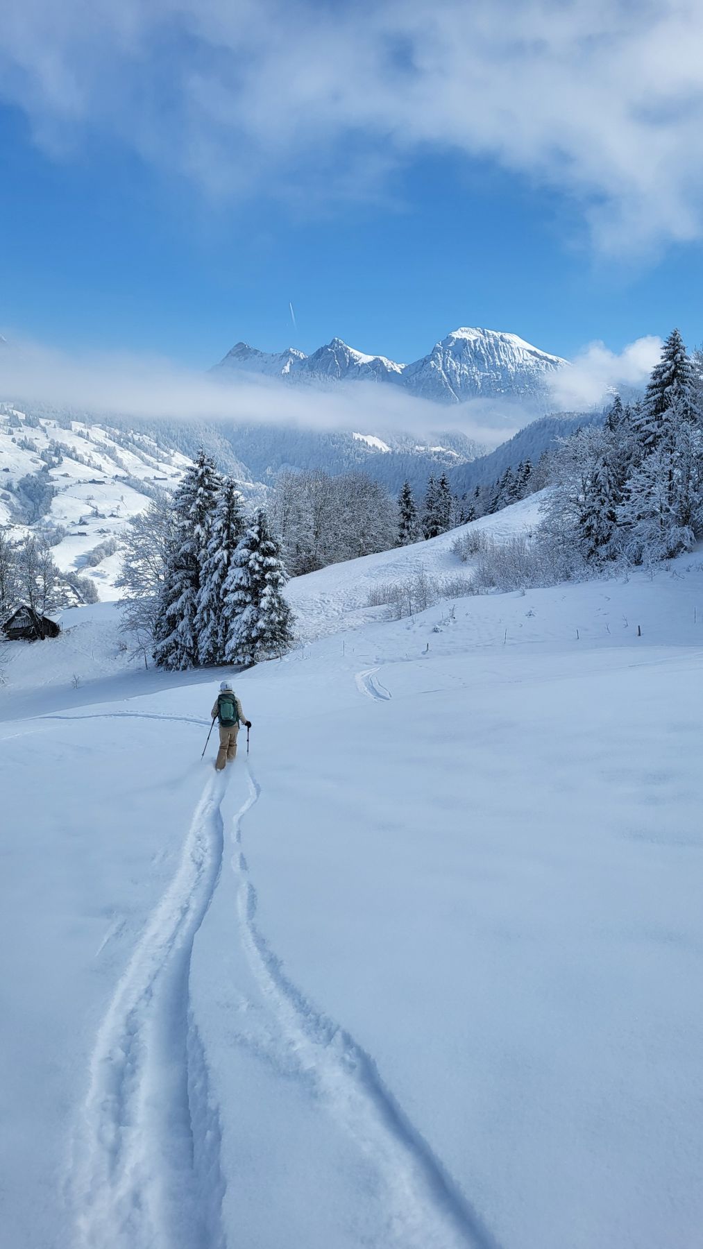 Nachdem es gestern frisch geschneit hatte, wollten wir den Pulvertag heute ausnützen. Wir fuhren zeitig los Richtung Wägital und parkierten unser Auto mitten im Dorf. In eisiger Kälte, dafür wunderbarem Neuschnee zogen wir dem Wägitaler Skilift entlang stetig hoch, immer mit Blick auf den Gross Aubrig. Oberhalb des Skiliftes folgten wir dem zugeschneiten Feldweg sanft ansteigend bis nach Nüssen, dann dem Waldrand entlang hoch bis auf die Krete, wo wir eine traumhafte Rundumsicht hatten. Die letzten Höhenmeter waren dann nochmal etwas steiler und strenger, aber mit der Aussicht auf das Nebelmeer und die verschneiten Gipfel rundherum lief es dennoch recht ring. Das Picknick mit Sonne im Gesicht war wunderbar – und die Abfahrt im Pulverschnee noch besser. Diese folgte der Aufstiegsroute entlang und war bis auf das allererste Stück der Krete entlang grossartig. Ein Tag, der auf jeden Fall in Erinnerung bleiben wird.