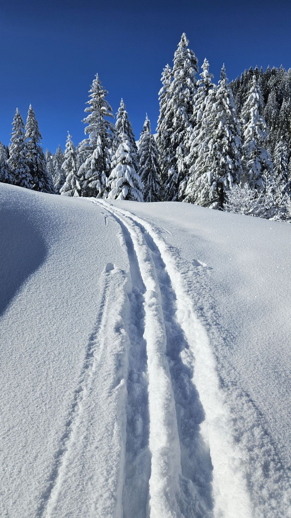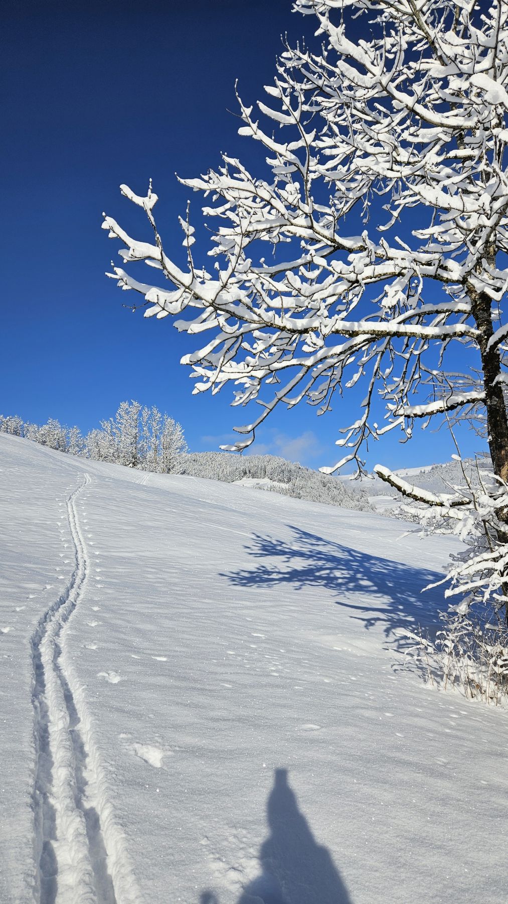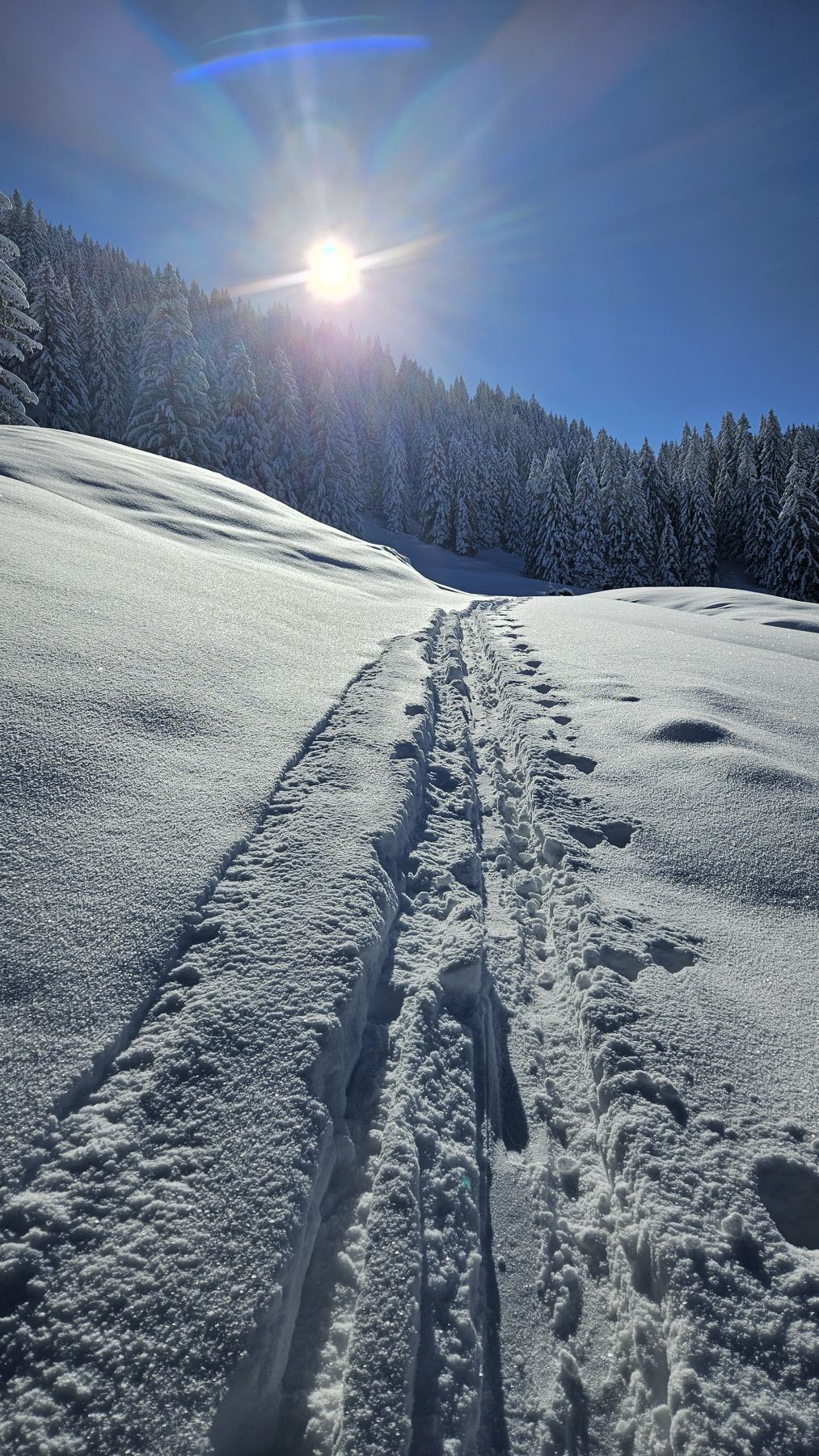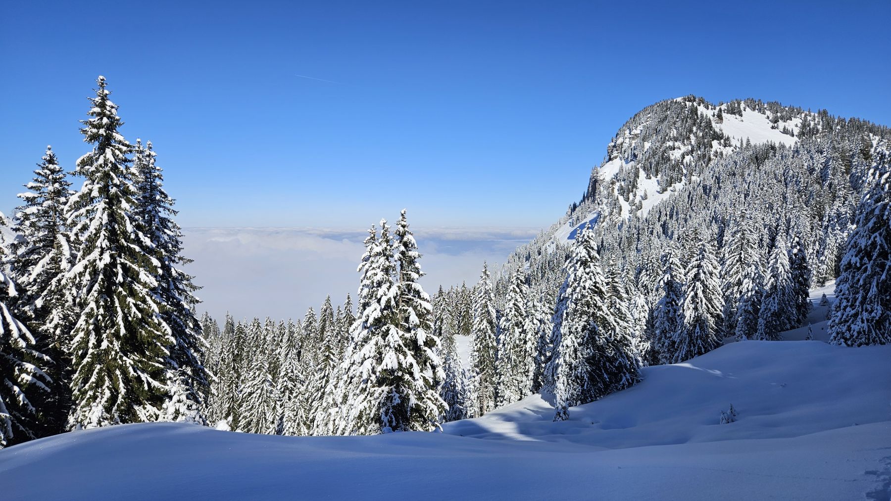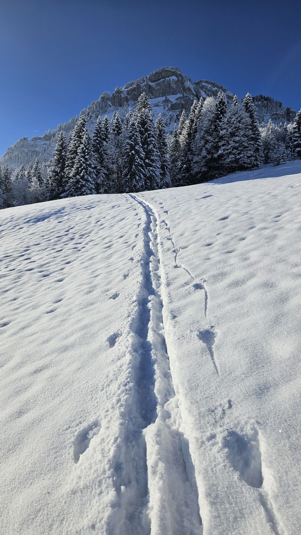 Nachdem es gestern frisch geschneit hatte, wollten wir den Pulvertag heute ausnützen. Wir fuhren zeitig los Richtung Wägital und parkierten unser Auto mitten im Dorf. In eisiger Kälte, dafür wunderbarem Neuschnee zogen wir dem Wägitaler Skilift entlang stetig hoch, immer mit Blick auf den Gross Aubrig. Oberhalb des Skiliftes folgten wir dem zugeschneiten Feldweg sanft ansteigend bis nach Nüssen, dann dem Waldrand entlang hoch bis auf die Krete, wo wir eine traumhafte Rundumsicht hatten. Die letzten Höhenmeter waren dann nochmal etwas steiler und strenger, aber mit der Aussicht auf das Nebelmeer und die verschneiten Gipfel rundherum lief es dennoch recht ring. Das Picknick mit Sonne im Gesicht war wunderbar – und die Abfahrt im Pulverschnee noch besser. Diese folgte der Aufstiegsroute entlang und war bis auf das allererste Stück der Krete entlang grossartig. Ein Tag, der auf jeden Fall in Erinnerung bleiben wird.