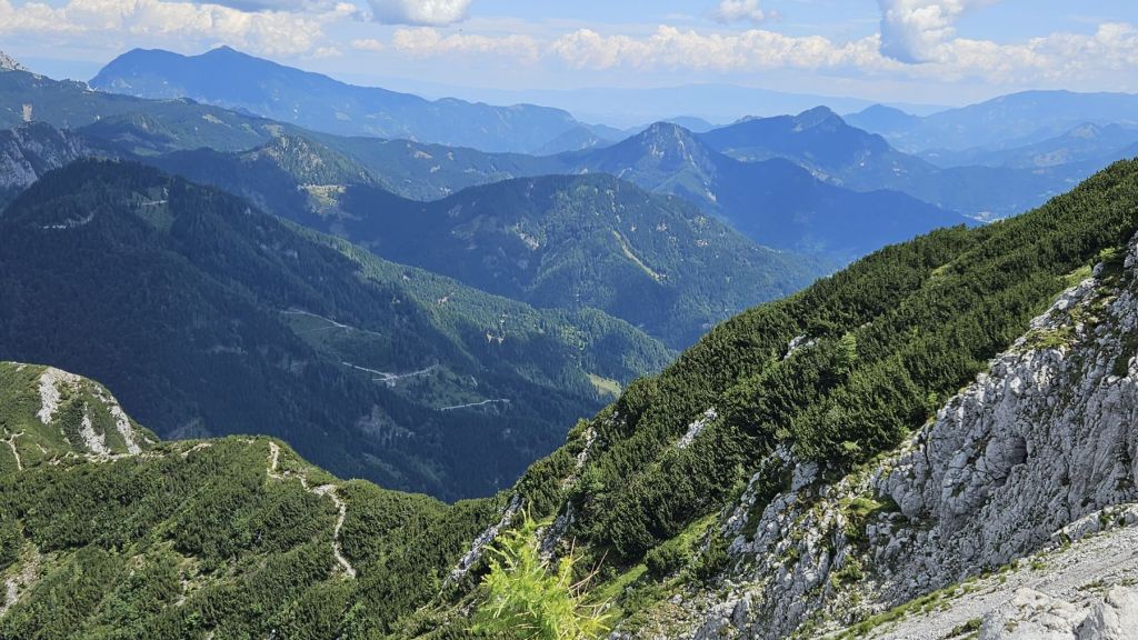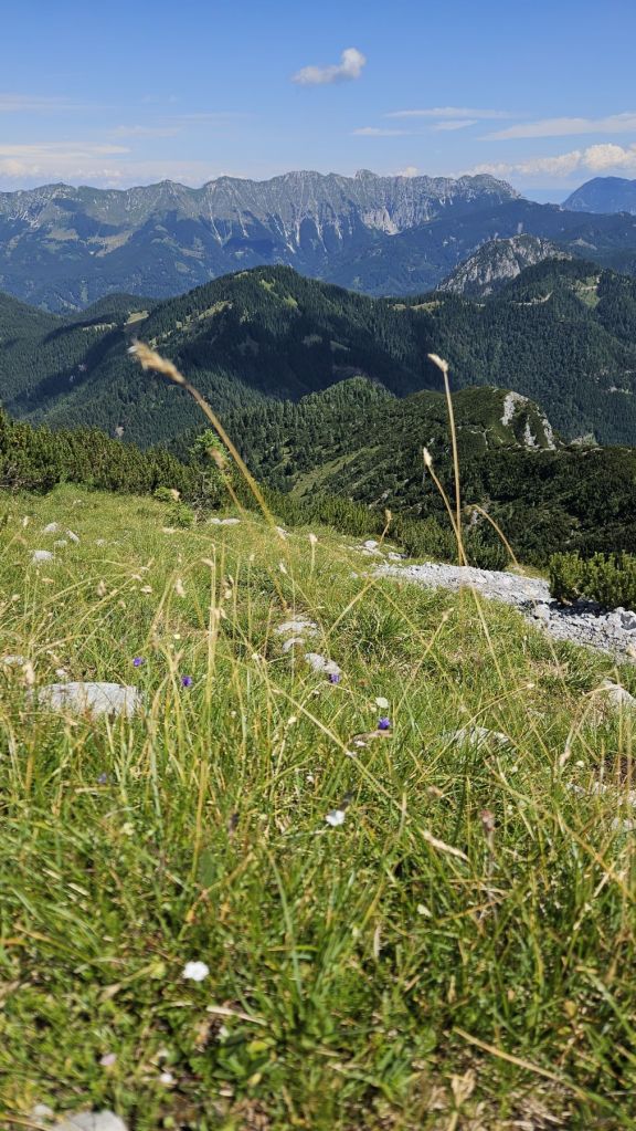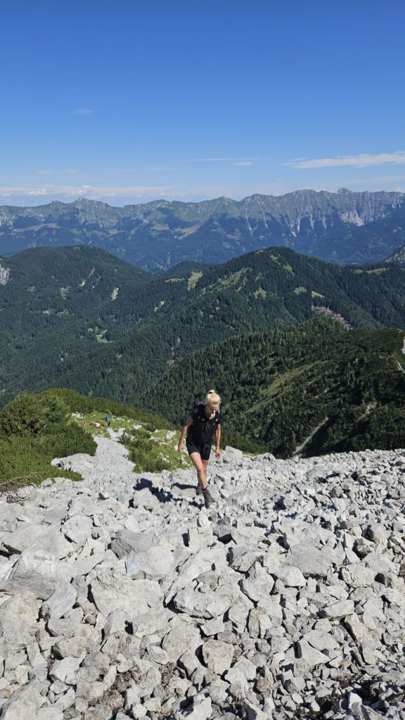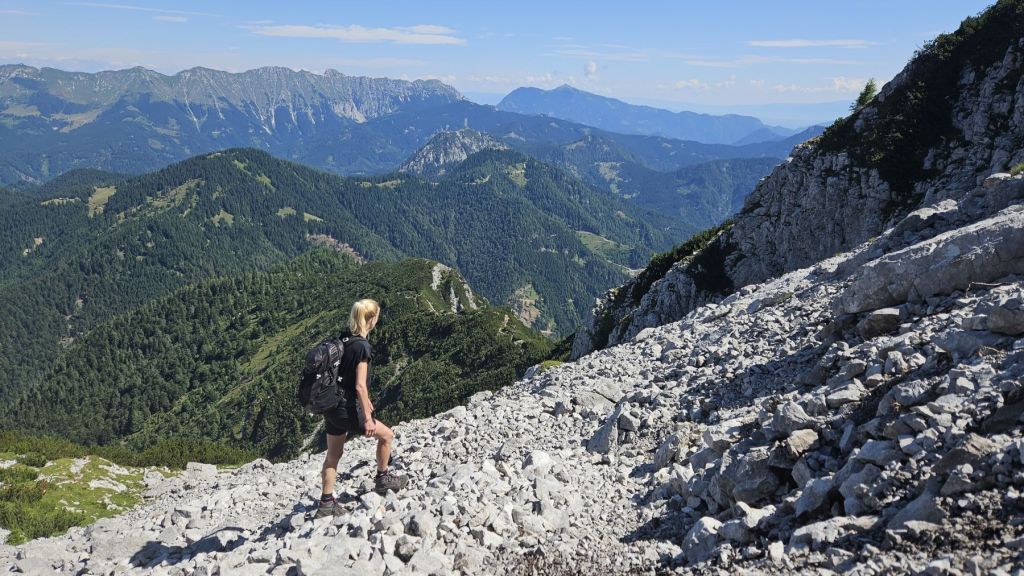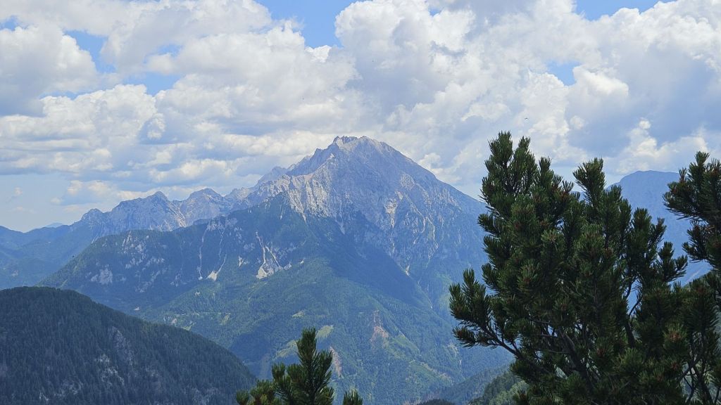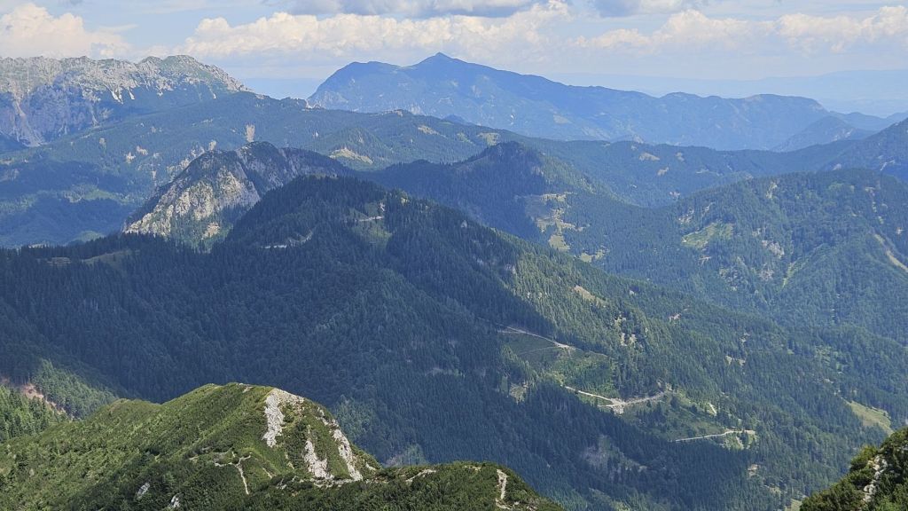 Als wir heute Morgen in Ljubjana zusammenpackten, war es recht warm. Eine Stunde später, auf dem Parkplatz Planinski dom pod Storzicem war es erfrischend kühl. Von dort aus ging unsere erste Wanderung in Slowenien los. Die ersten 40 Minuten liefen wir stetig durch den Wald hoch, zuerst auf steinigem Boden, danach auf weichem Waldboden. Und schon konnten wir das erste Mal einen Blick über die Bäume auf die Waldflächen und Gipfel rundherum erhaschen – und auch auf den Gipfel des Stozic, der ziemlich gewaltig aussah von dort unten. Wir liefen weiter den Wald hoch zur Kuppe, wo die Sträucher immer noch wucherten, aber nicht mehr ganz so hoch waren. Dann liefen wir dem Grat entlang bis unterhalb des Gipfels, wo nicht nur das Kreuz auf dem Gipfel, sondern auch der Gratweg, den wir entlanggekommen waren, gut sichtbar waren. Da war dann auch Endstation für uns. Einerseits, weil die letzten paar Höhenmeter bis auf den Gipfel sehr exponiert waren und die Gefahr von Steinschlag drohte, andererseits auch einfach wegen meiner Höhenangst. Ich wollte nicht schon wieder schlottrige Beine. Wir genossen unser Picknick bei traumhafter Aussicht und herrlichem Sonnenschein, bevor wir all die Höhenmeter wieder herunterzappelten. Und uns dabei auf die neue Ferienwohnung in Bohinjska Bistrica freuten.