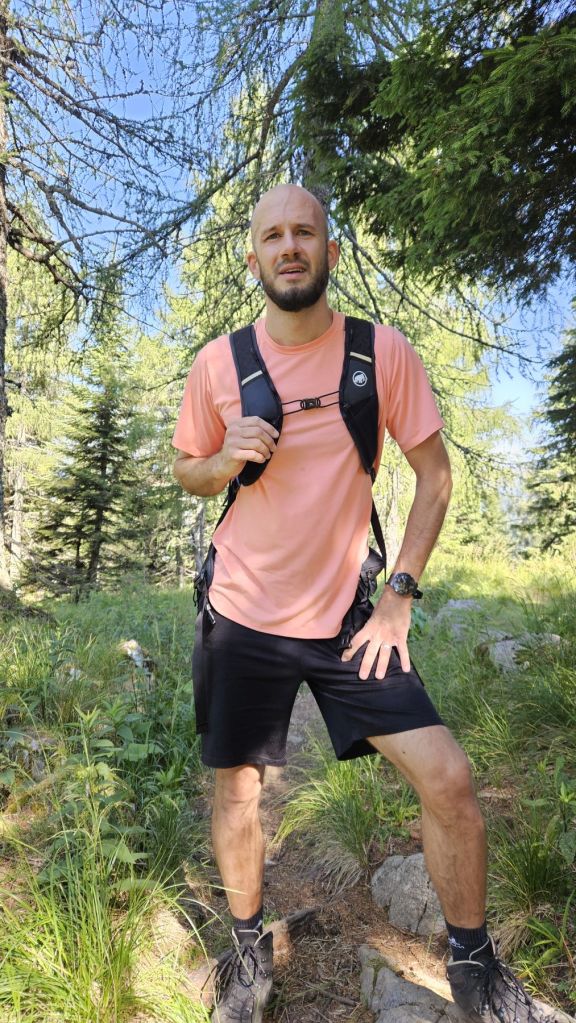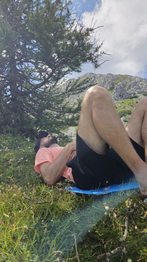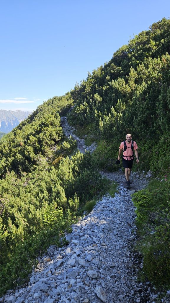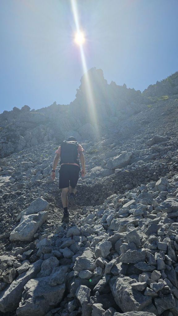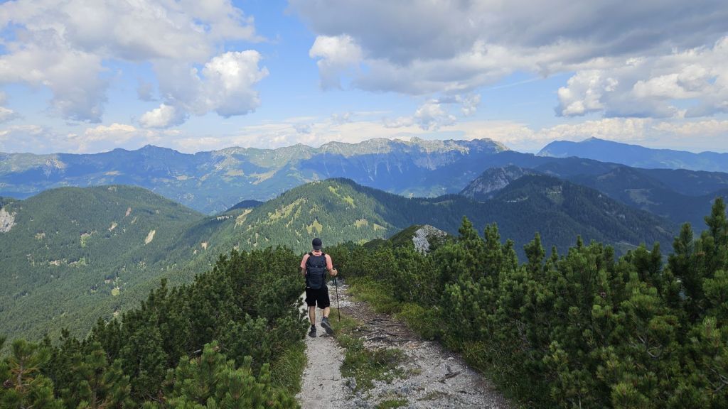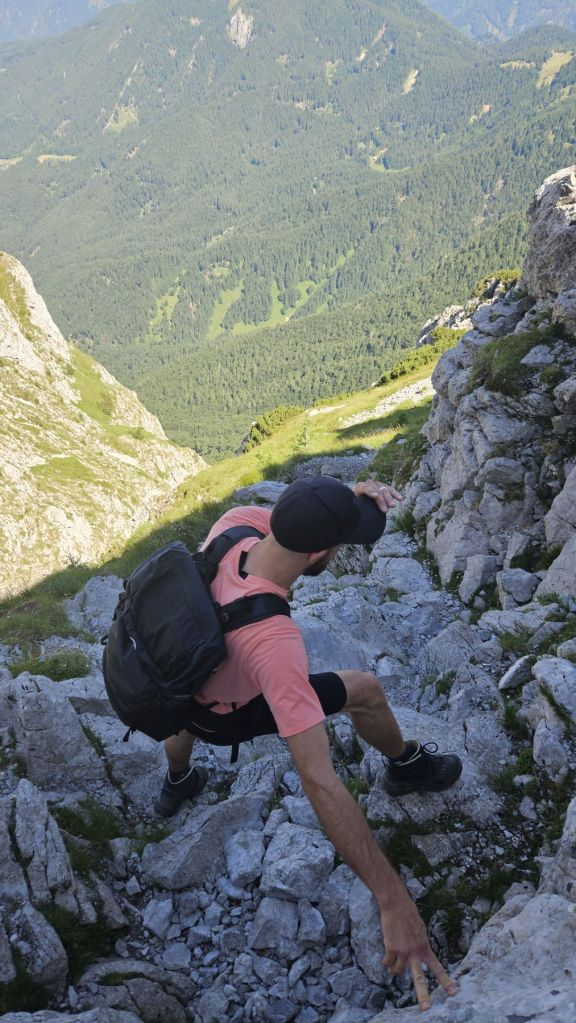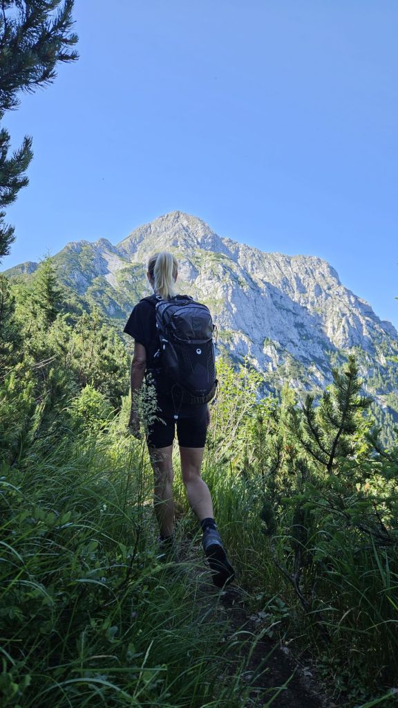 Als wir heute Morgen in Ljubjana zusammenpackten, war es recht warm. Eine Stunde später, auf dem Parkplatz Planinski dom pod Storzicem war es erfrischend kühl. Von dort aus ging unsere erste Wanderung in Slowenien los. Die ersten 40 Minuten liefen wir stetig durch den Wald hoch, zuerst auf steinigem Boden, danach auf weichem Waldboden. Und schon konnten wir das erste Mal einen Blick über die Bäume auf die Waldflächen und Gipfel rundherum erhaschen – und auch auf den Gipfel des Stozic, der ziemlich gewaltig aussah von dort unten. Wir liefen weiter den Wald hoch zur Kuppe, wo die Sträucher immer noch wucherten, aber nicht mehr ganz so hoch waren. Dann liefen wir dem Grat entlang bis unterhalb des Gipfels, wo nicht nur das Kreuz auf dem Gipfel, sondern auch der Gratweg, den wir entlanggekommen waren, gut sichtbar waren. Da war dann auch Endstation für uns. Einerseits, weil die letzten paar Höhenmeter bis auf den Gipfel sehr exponiert waren und die Gefahr von Steinschlag drohte, andererseits auch einfach wegen meiner Höhenangst. Ich wollte nicht schon wieder schlottrige Beine. Wir genossen unser Picknick bei traumhafter Aussicht und herrlichem Sonnenschein, bevor wir all die Höhenmeter wieder herunterzappelten. Und uns dabei auf die neue Ferienwohnung in Bohinjska Bistrica freuten.