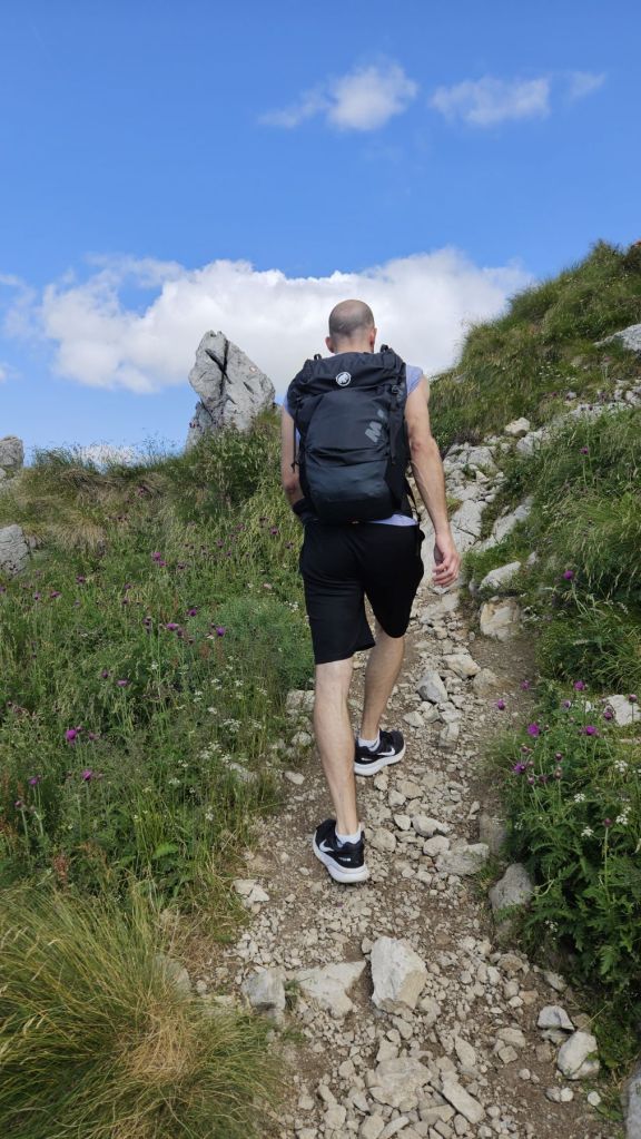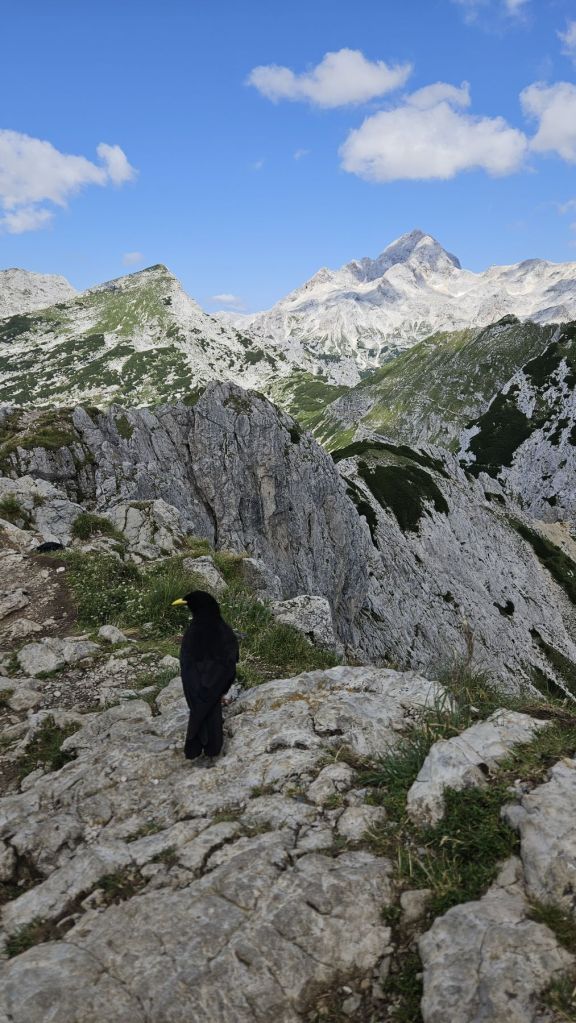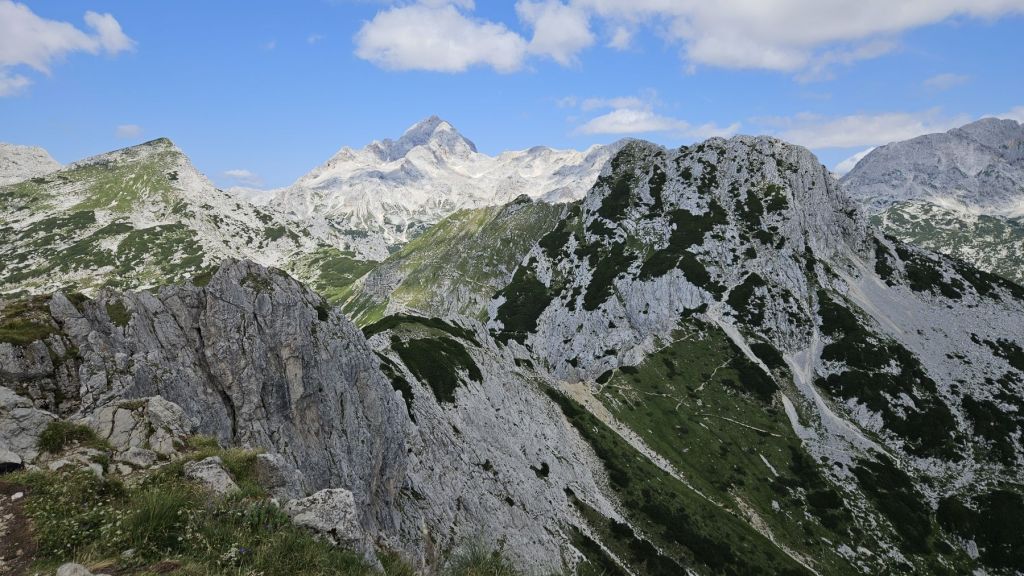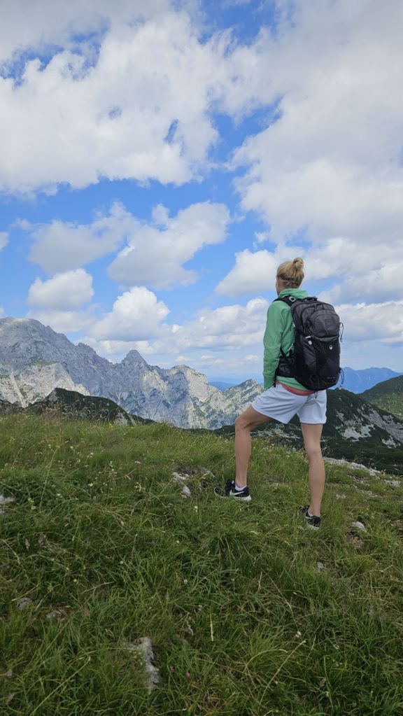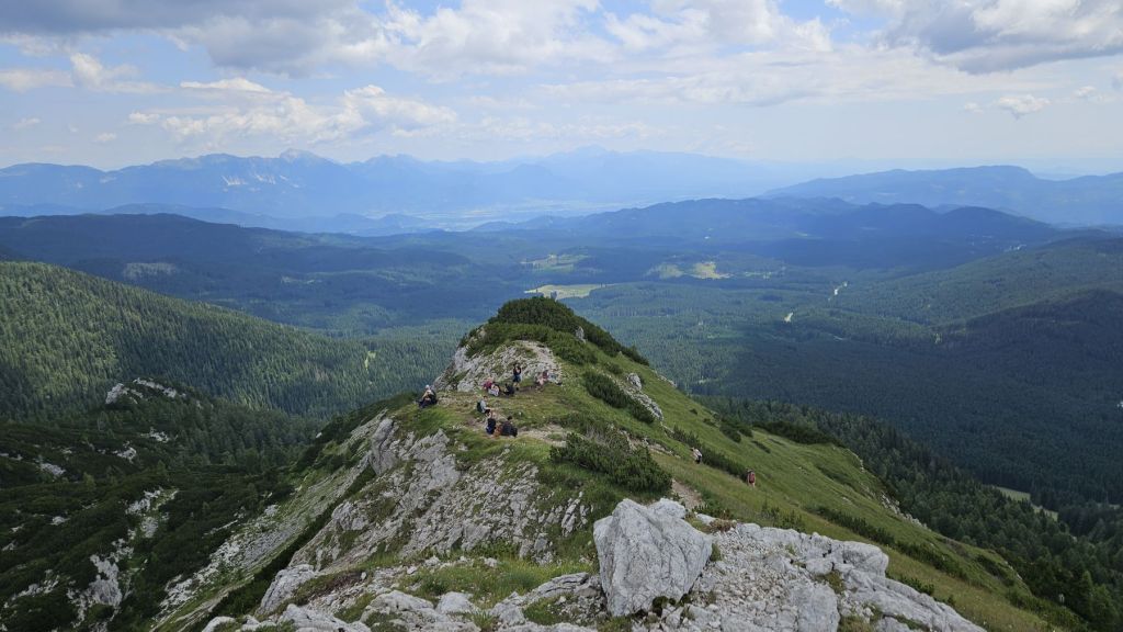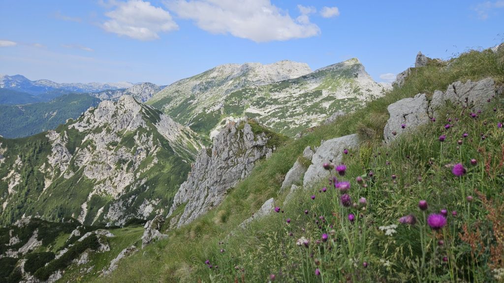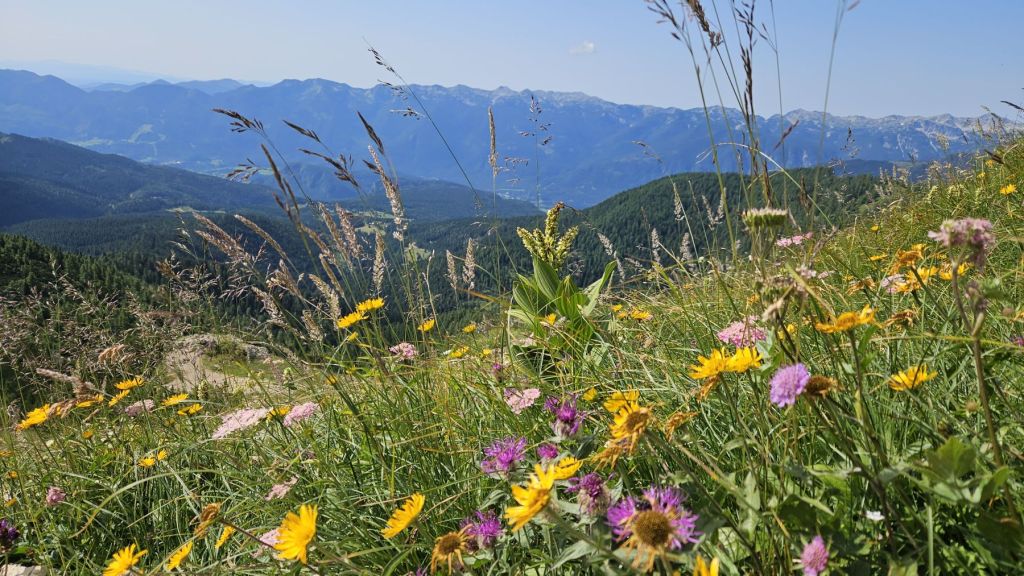 Etwa eine halbe Fahrstunde von Bohinjska Bistrica entfernt liegt der Ausgangsort zu dieser lohnenswerten Wanderung auf den Visevnik im Nationalpark Terglau. Obwohl wir lange und gut geschlafen hatten, fühlten wir uns mässig fit heute. Vor allem ich hatte zu kämpfen, der tiefe Blutdruck und das dementsprechend mangelnde Energielevel machten mir zu schaffen. Die erste halbe Stunde durch den Wald bis auf die Srednja war wirklich eine Qual. Danach ging es mit jedem Schritt besser. Der Weg war eigentlich durchgehend steil, zuerst durch den Wald dem Skilift entlang hoch, dann über Steinwege an Almwiesen voller farbiger Frühlingsblumen vorbei. Der letzte Abschnitt war dann nochmal richtig steil, dafür wurden wir auf dem Gipfel mit einer atemberaubenden Aussicht auf den höchsten Berg, den Triglav 2863m, und viele umliegende Berggipfel belohnt. Unser Picknick nahmen wir etwas unterhalb des Gipfels an einem ruhigen Plätzchen ein und freuten uns sehr, den Triglav gesehen zu haben. Hinunter ging es dann zügig, da wir nachmittags noch die Füsse im nahegelegenen Fluss Sava abkühlen wollten.