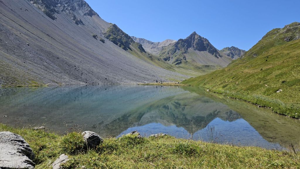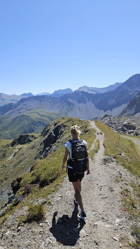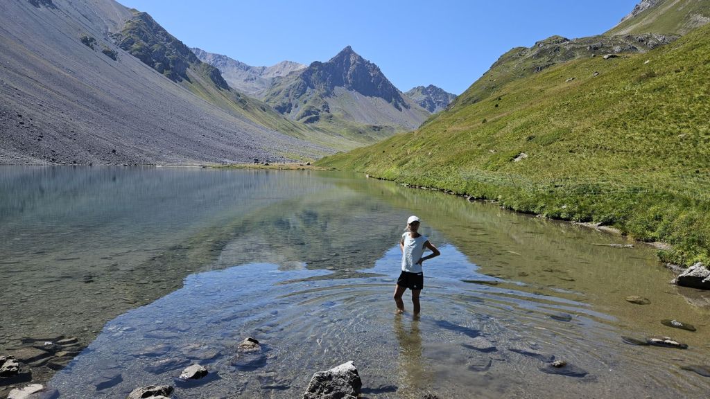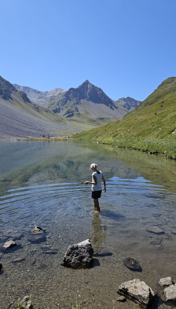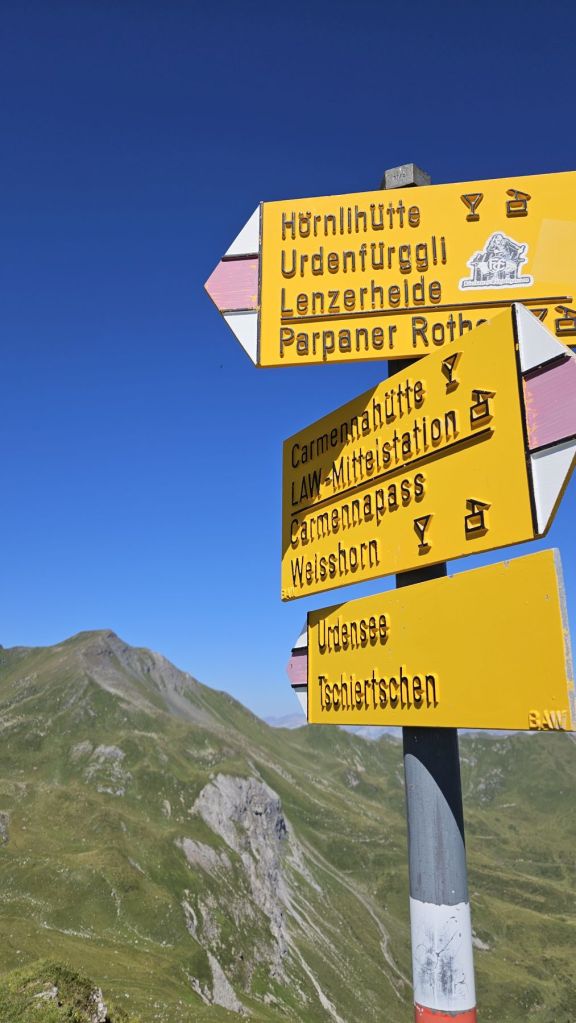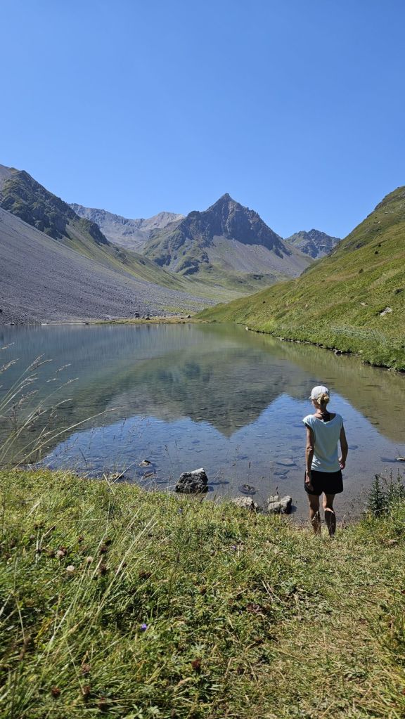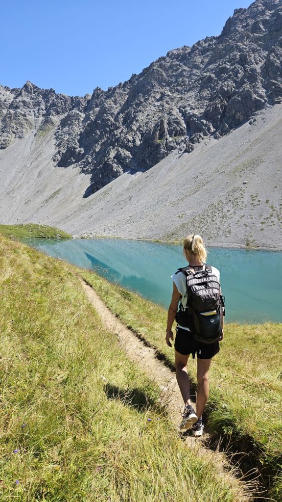 Nach zwei frustrierenden Sommerferienwochen, in denen es nur geregnet hatte, konnten wir heute endlich wieder einmal in die Berge. Diesen freien Freitag wollten wir ausnutzen und eine Wanderung vom sonst eher bevölkerten Arosa aus machen. Wir starteten in Innerarosa und liefen über Wiesenwege stetig hoch über die Carmennahütte zum Hörnli auf 2496m. Obwohl die Bedingungen wunderbar waren, hatten wir heute beide wenig Energie. So liessen wir uns Zeit, hielten noch einen Schwatz mit einem echten Inneraroser und genossen es, dass es trotz super Wetter so wenig Leute auf dem Wanderweg hatte. Kurz nach der Hörnlihütte, dort, wo wir auch im Winter schon mehrmals Pause gemacht hatten, machten wir unsere Picknick-Pause und genossen die Ruhe. Von dort ging es zuerst ein rechtes Stück hinunter, bevor wir rechts hochzogen zum Älplisee. Was für ein idyllischer und ruhiger Ort! Wir kühlten unsere Füsse im eiskalten See ab und liefen dann am Schwellisee vorbei zurück nach Innerarosa. Ein Bilderbuch-Wandertag, der uns für weitere Wanderungen rund um Arosa inspiriert hat.