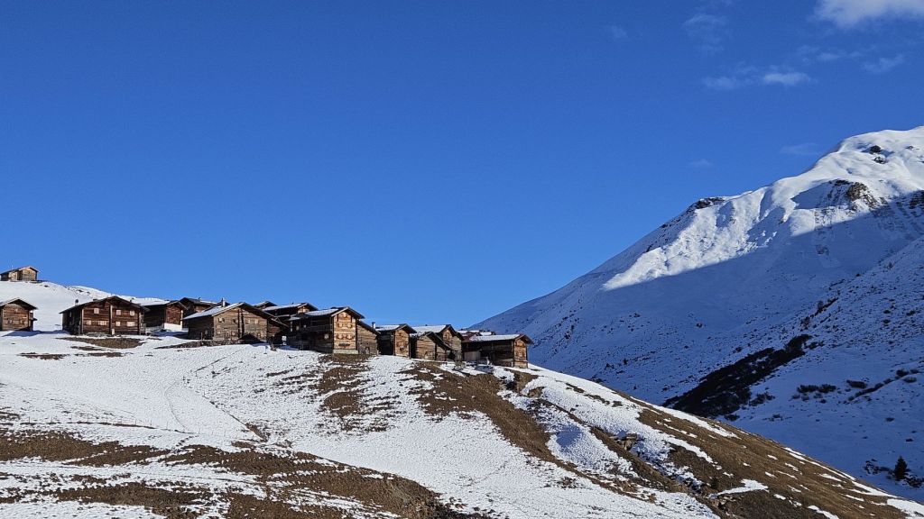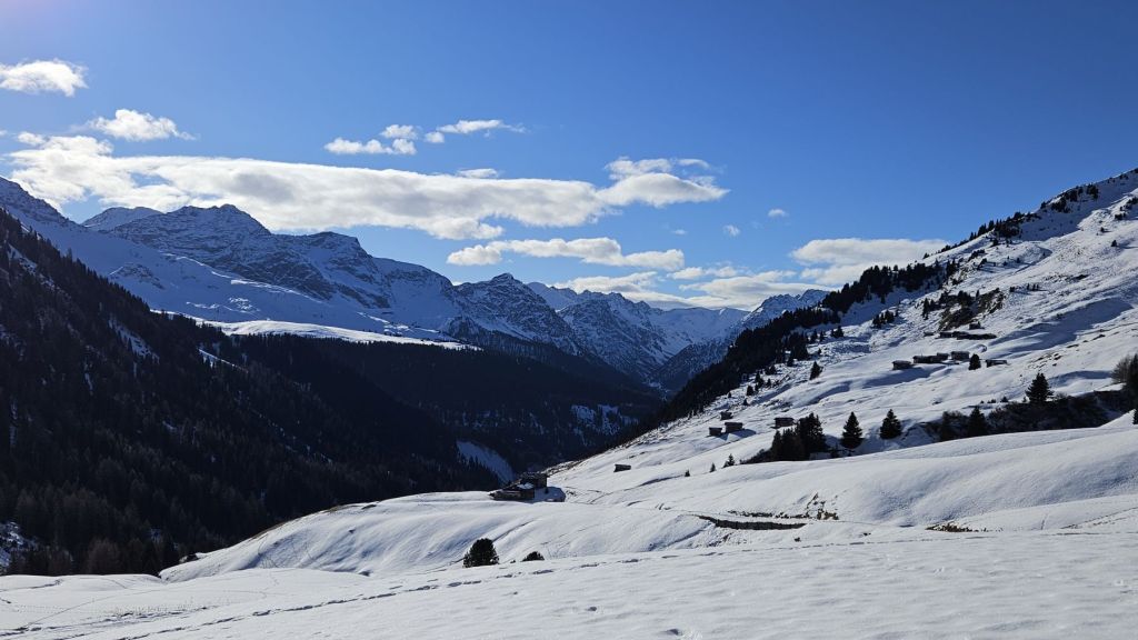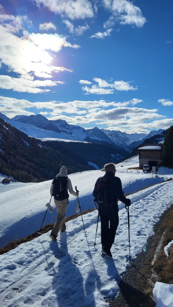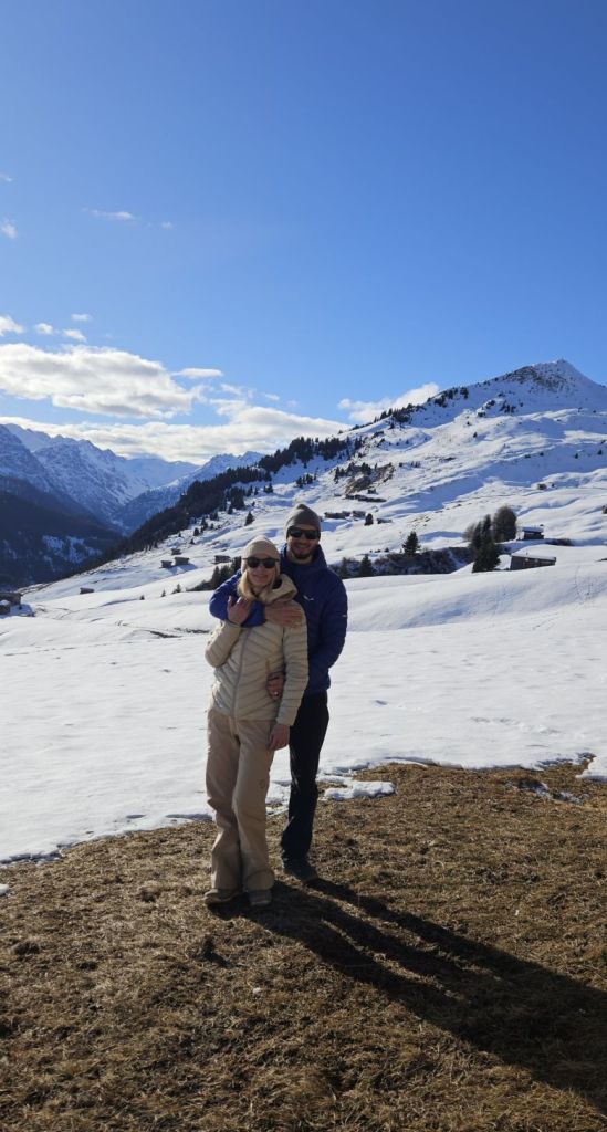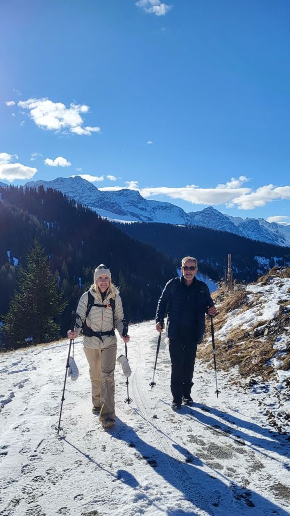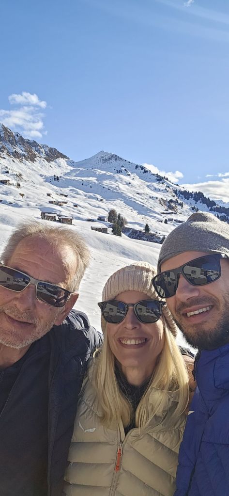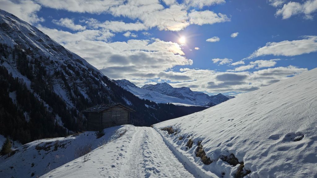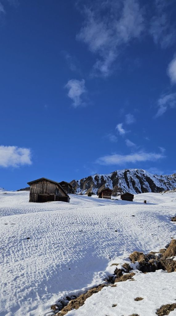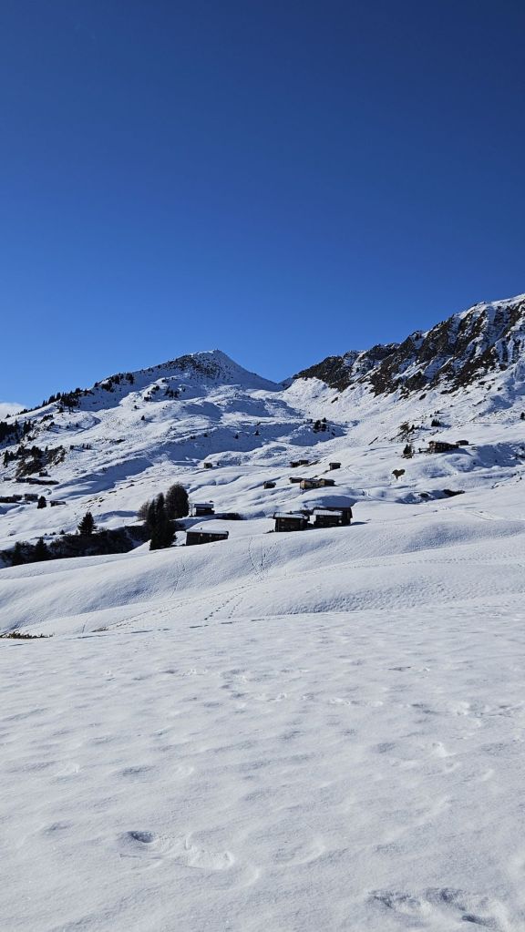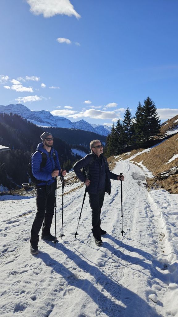 Am 25. Dezember kam Papi hoch und wir machten eine einfache Winterwanderung ins schöne Fondei Tal. Wir fuhren hoch zum Parkplatz Höh Rüti und wanderten von dort gemütlich hoch zum herzigen Dörfchen Strassberg in Fondei. Das Picknick konnten wir bei herrlichem Sonnenschein auf dem Bänkli geniessen. Abends feierten wir mit Papi Weihnachten mit einem feinen Fondue Chinoise in unserem gemütlichen Hüttli. Was für ein perfekter Tag!